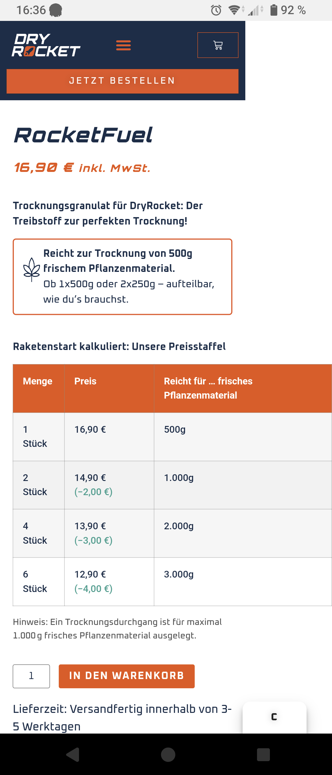 Kurz zum Produkt: Die DryRocket ist ein automatisiertes VPD-gesteuertes Trocknungsgerät, das ihr in eure Growbox stellt, sobald ihr mit der Trocknung beginnt. Sprich: Buds aufhängen, die Rakete rein, mit Granulat füllen und per App aktivieren. Den Rest macht die Dryrocket.