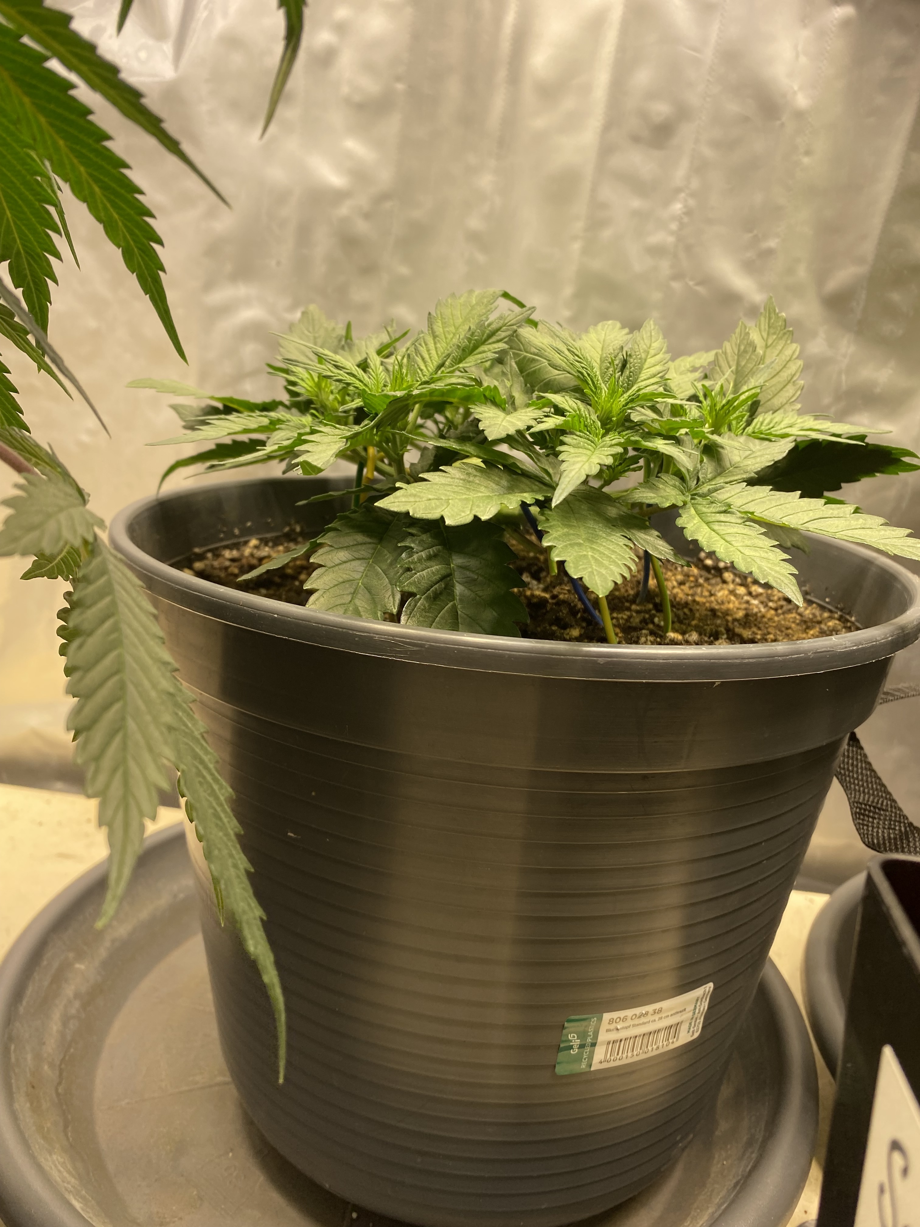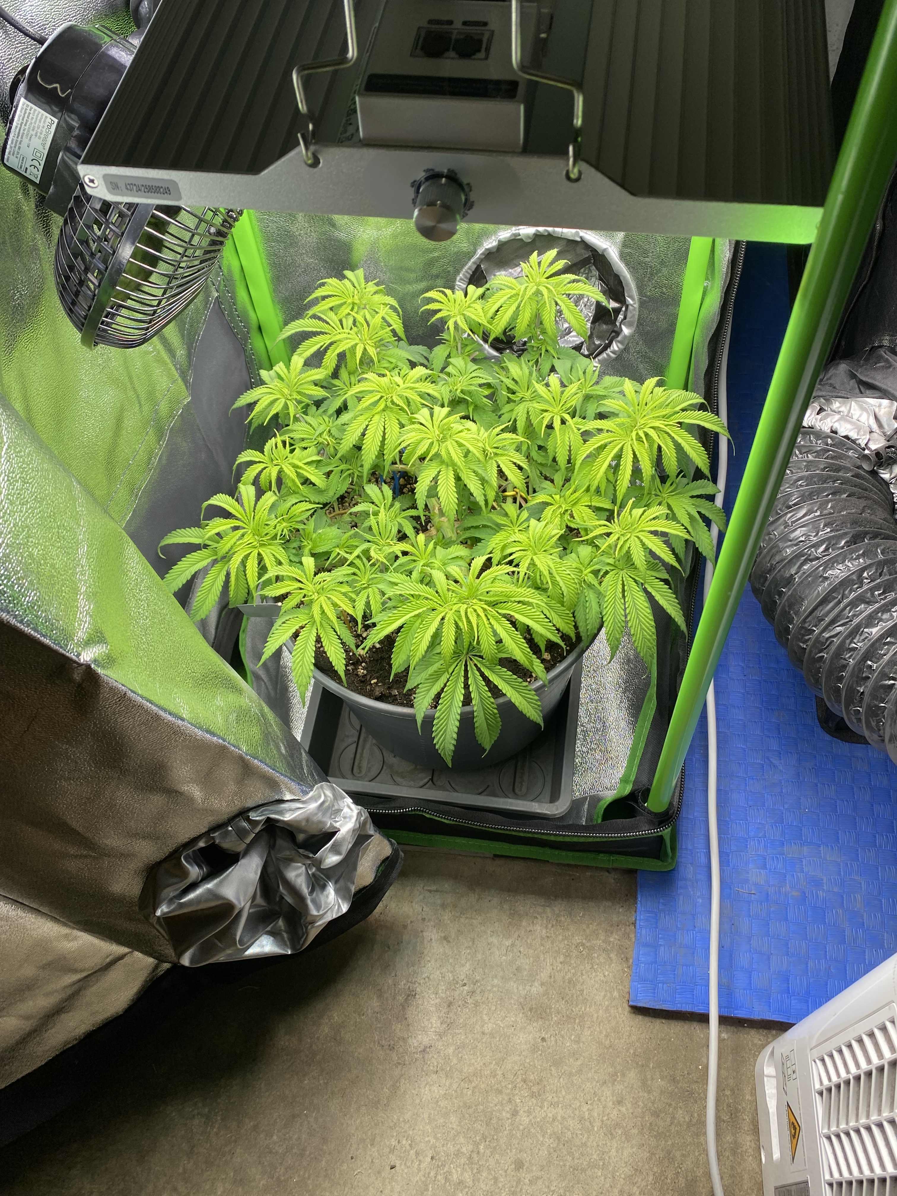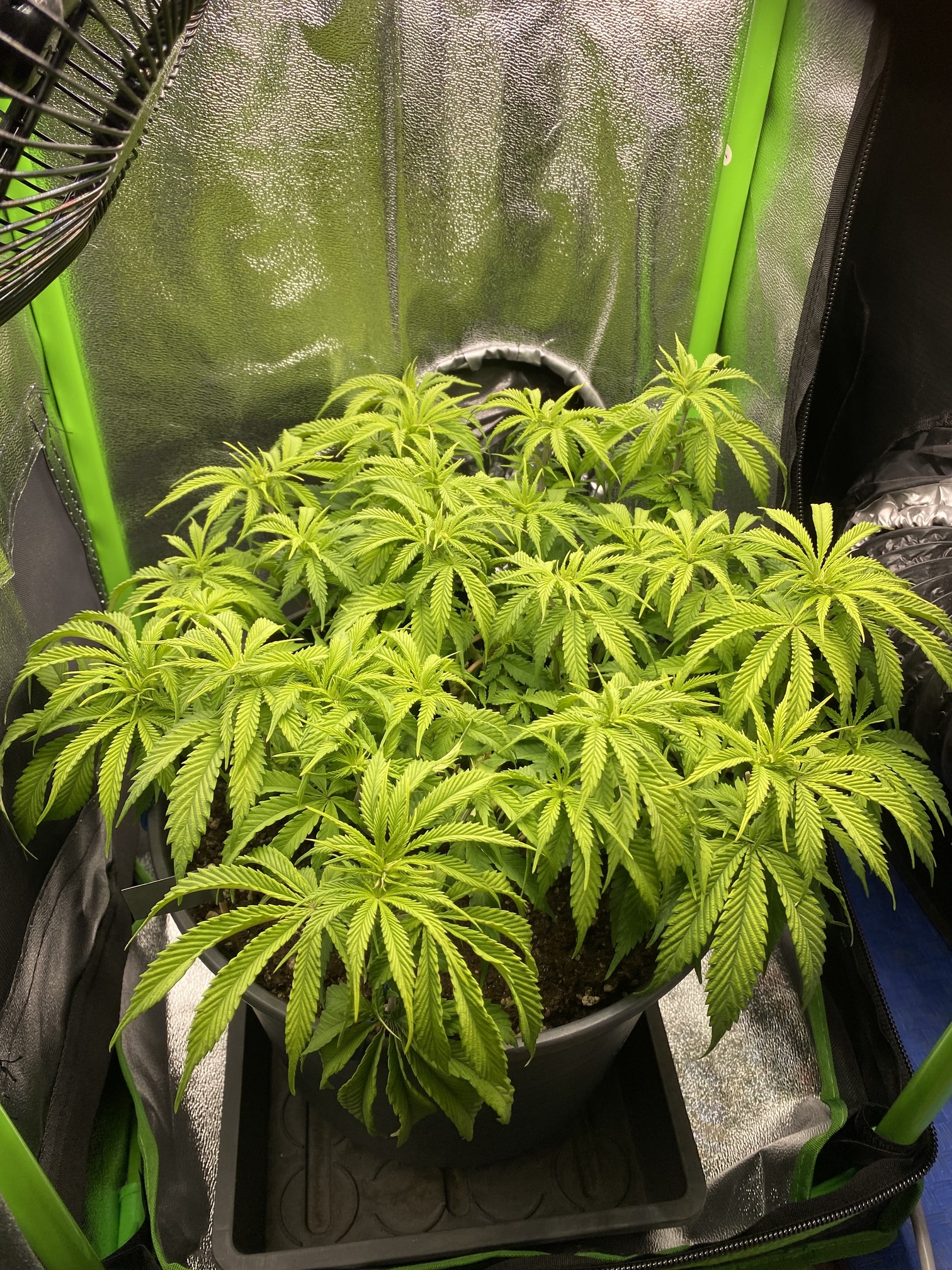 7. Woche und immer noch nix zu sehn von blühversuchen. Also hat die Dame ihre eigene Box bekommen für nen 12/12 Zyklus aber bevor ich den umgestellt hab fängt die an blass zuwerden hab gedacht „Fu…. off“ hab ihr trotzdem ihr Top Dress mit 20g Pferdedungpelltes gegeben dann dann mit NL gegossen und trotzdem umgestellt auf 12/12.