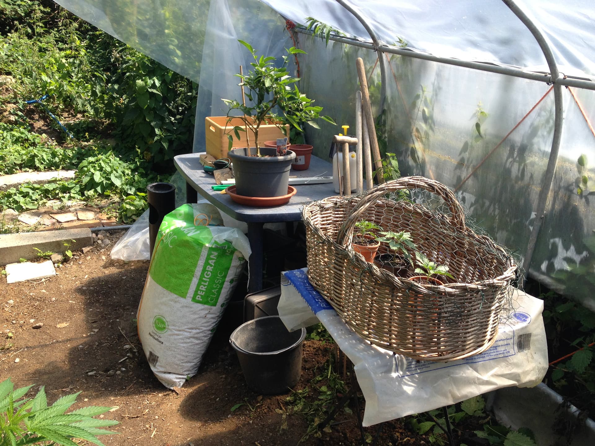 Da ich übers Wochenende weg bin, hab ich die kleinen Ladies jetzt erstmal ins Gewächshaus gestellt. Das Dachfenster kann ich nicht offenlassen wegen der Insekten nachts, die fahren natürlich auf die LED ab … und ich kann es nicht geschlossen lassen, weil ich dann tagsüber 30°+ da hätte.