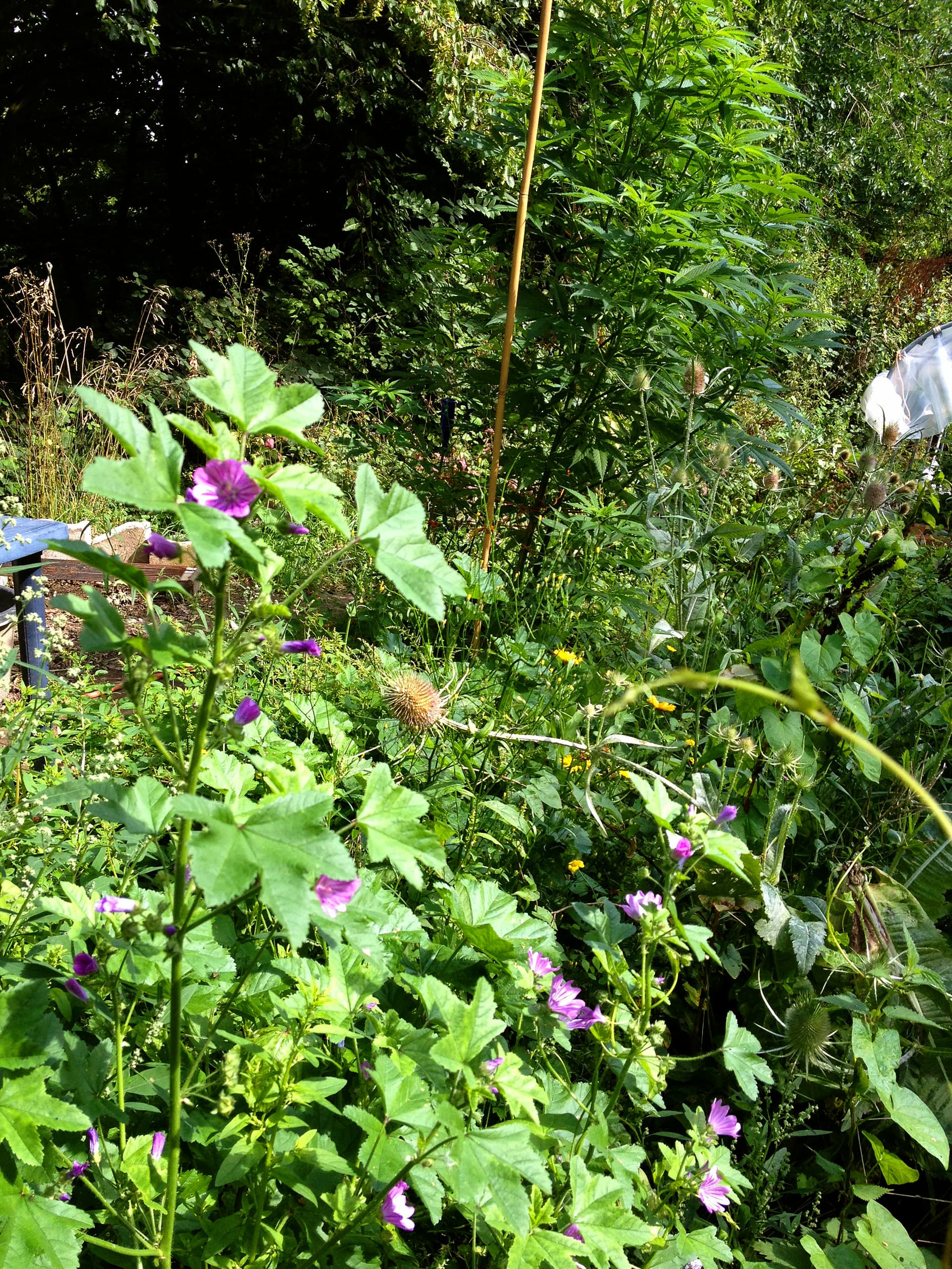 Die Wildwiese steht jetzt auch schon hoch und blüht. Lila: Malve, Gelb: Ringelblumen.