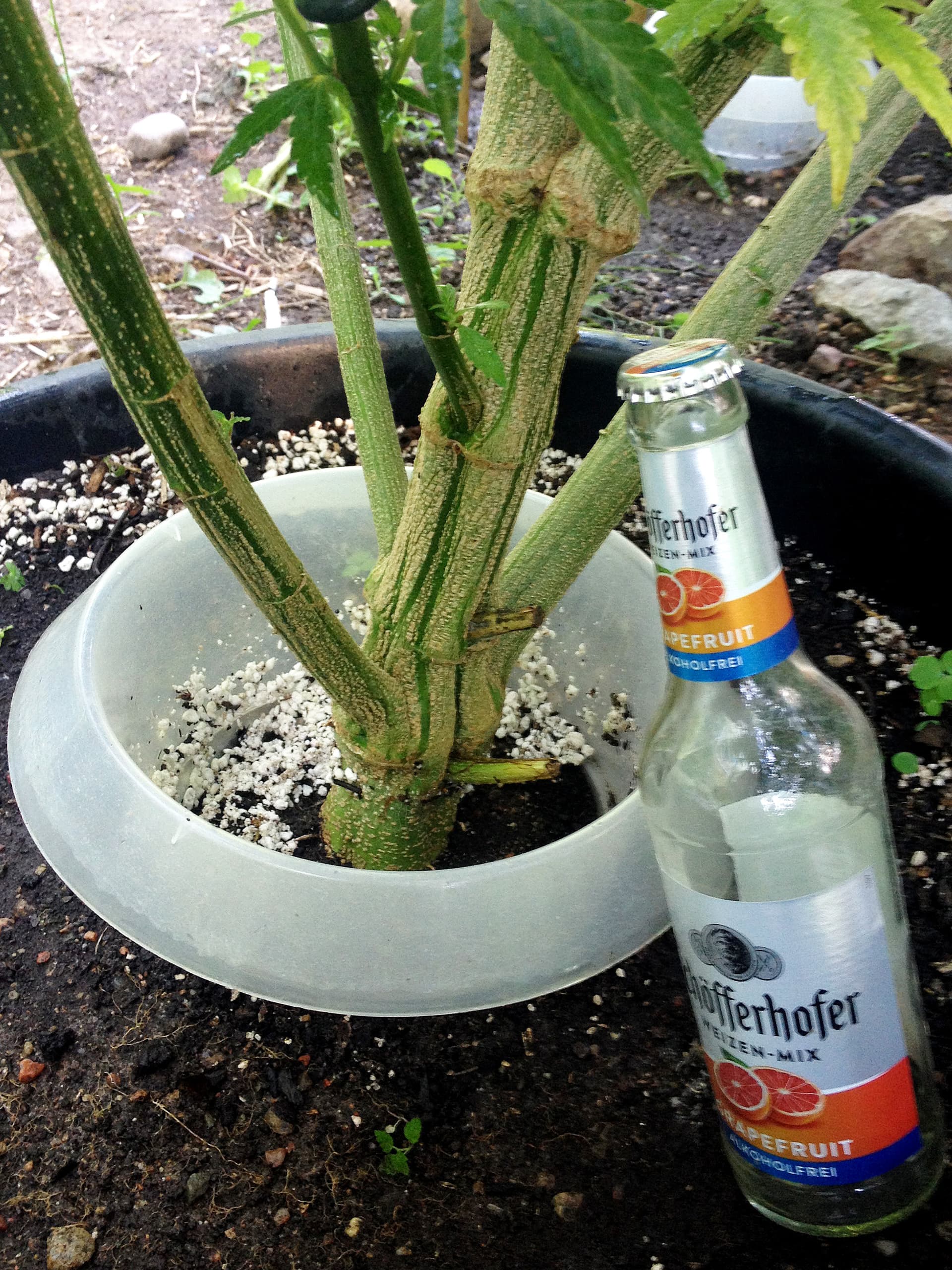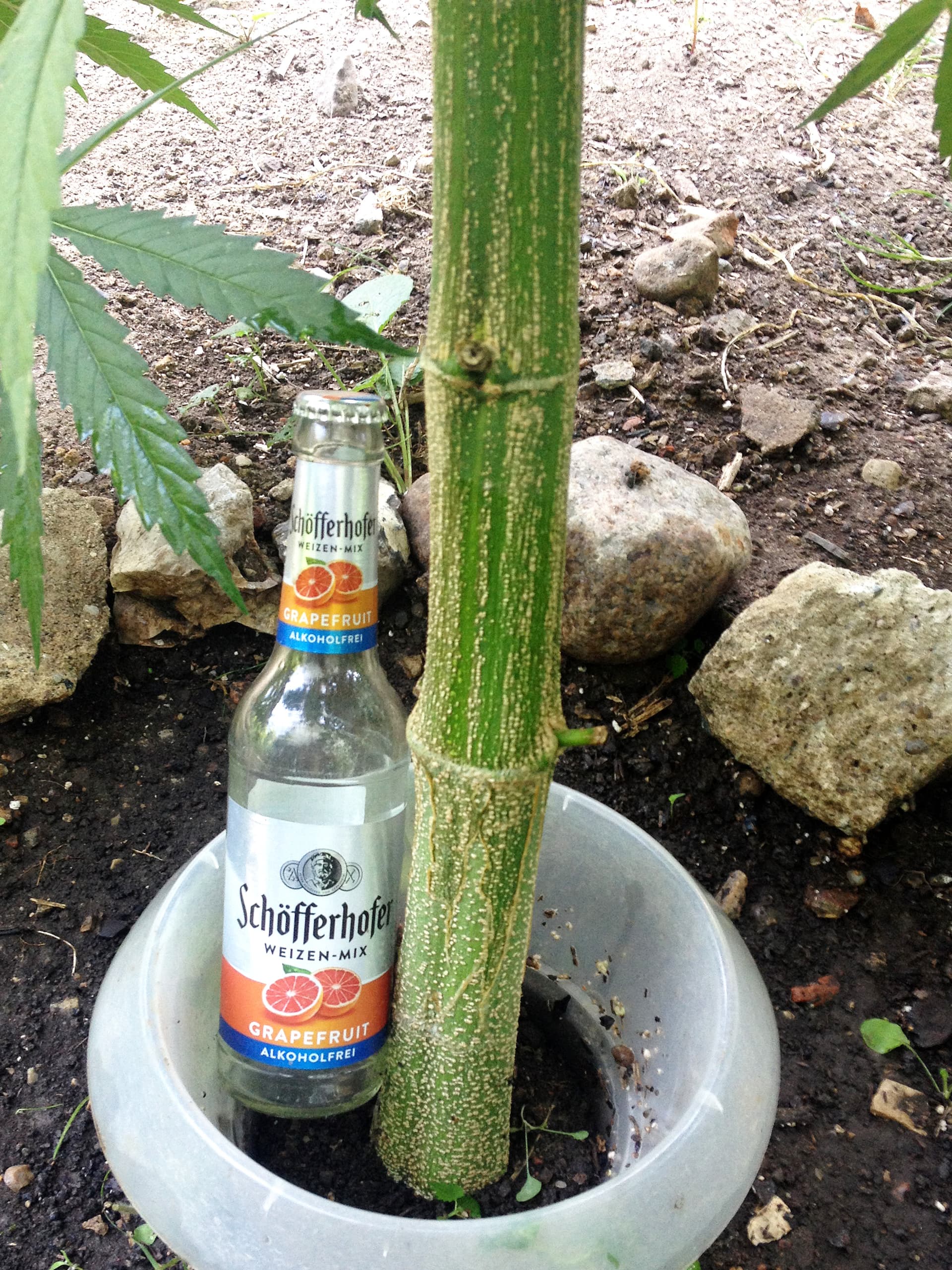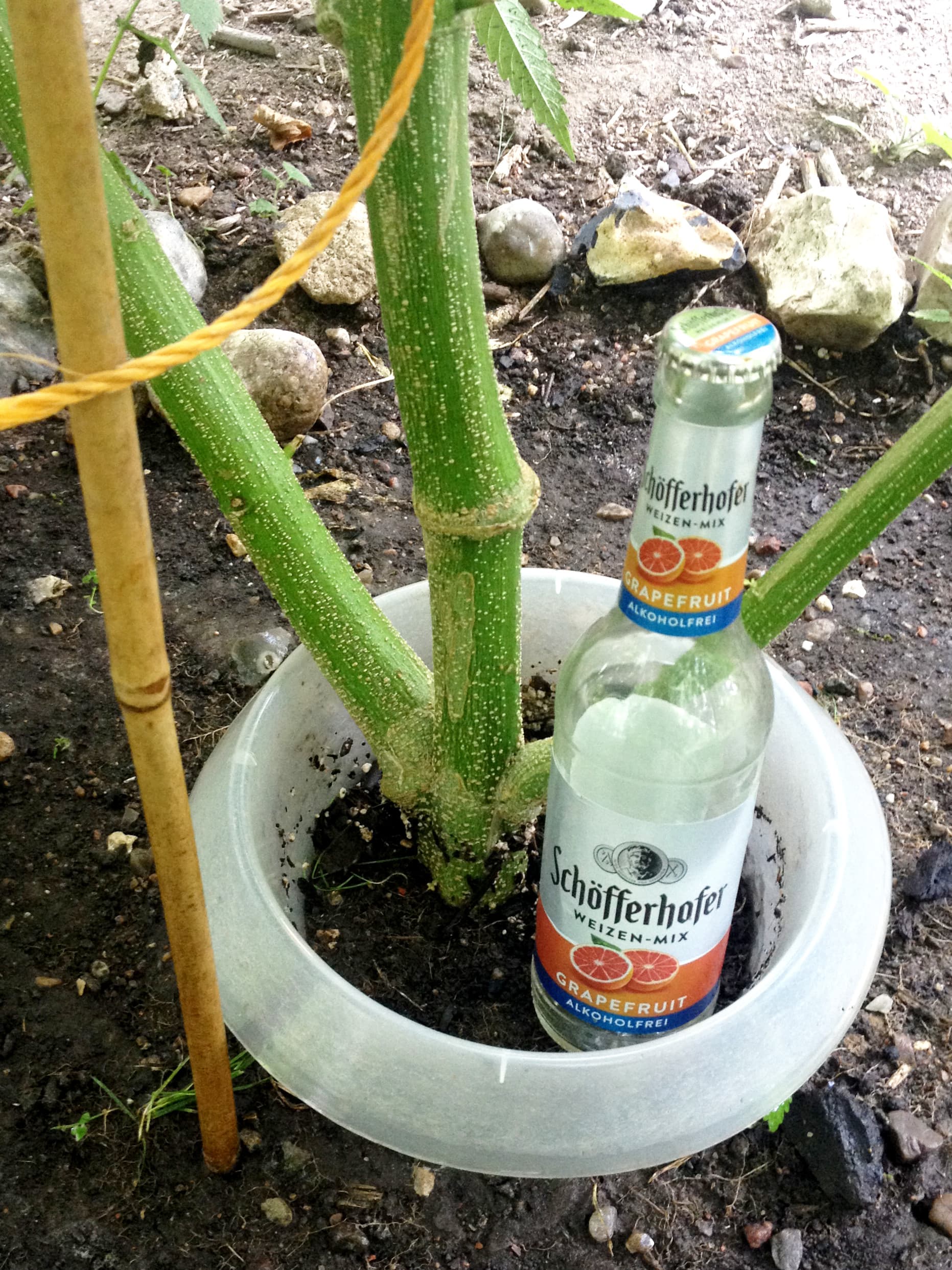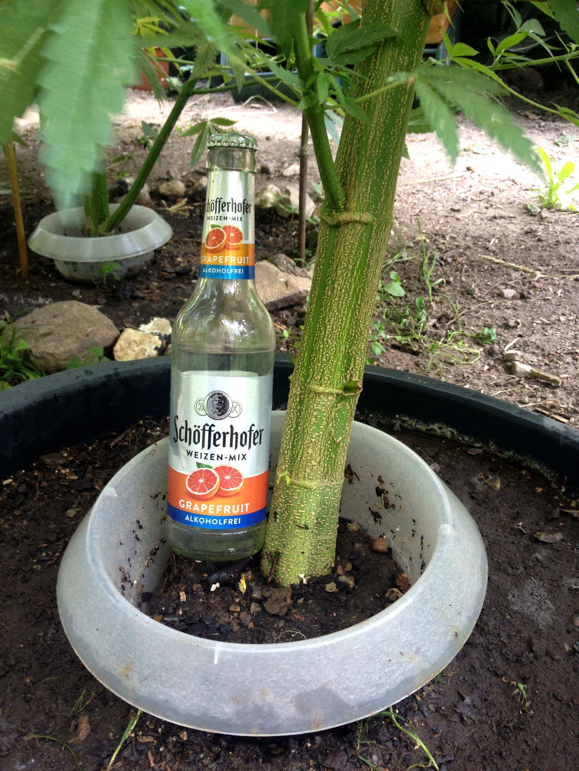 Bei den Freiland-Ladies habe ich ein paar gelbe Blattspitzen entdeckt. Nachdem ich 2 Wochen nur gegossen hab, gabs heute wieder Dünger. Ich hab zum 1. Mal Grow & Bloom gegeben, da die Vorblüte schon weit fortgeschritten ist … ich denke die legen bald los.