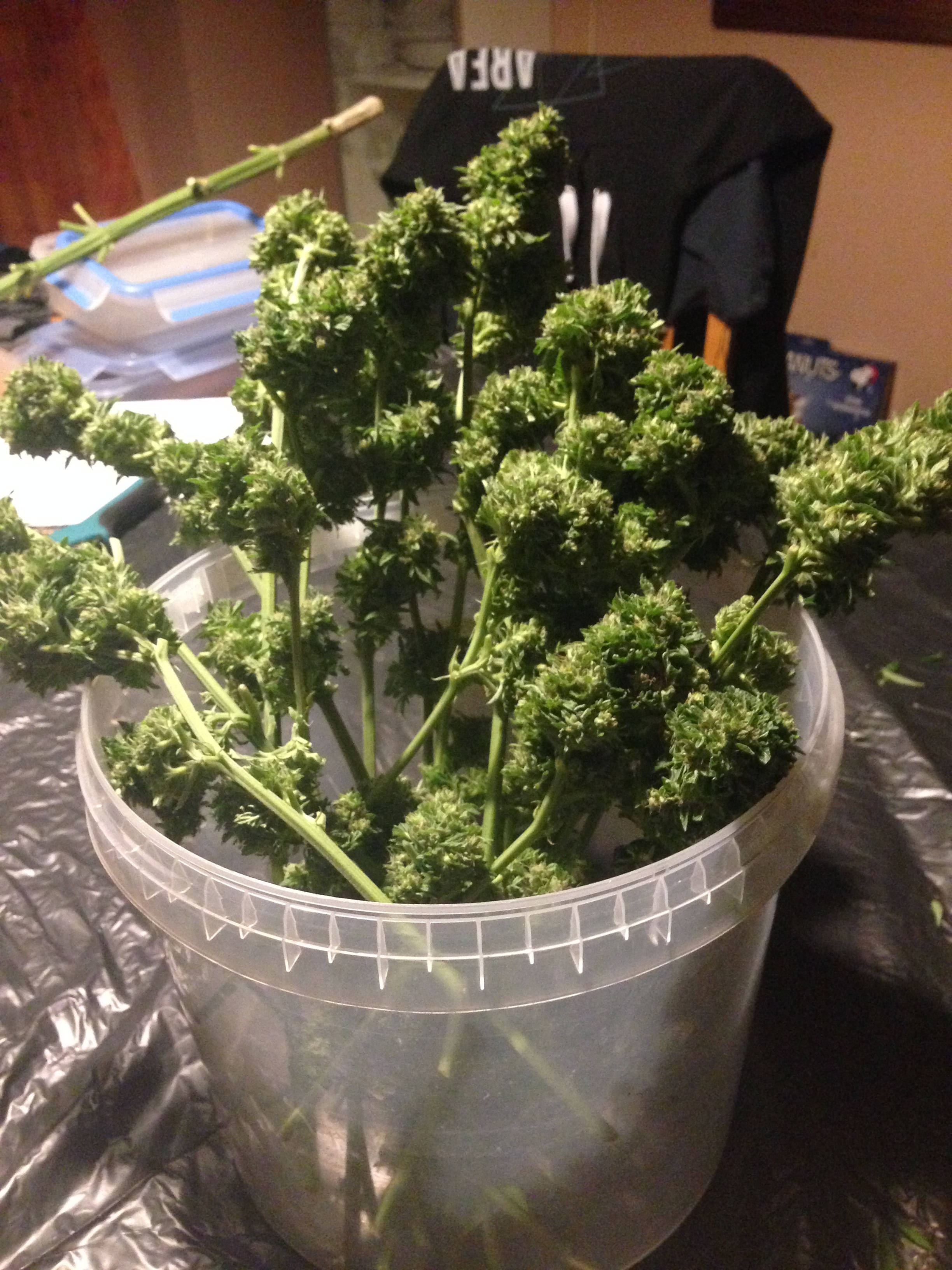 . Also ich hab buds und trimm von ungefähr 6 Pflanzen drin, aber 4 davon musste ich so früh ernten, das kaum was zusammen kam.