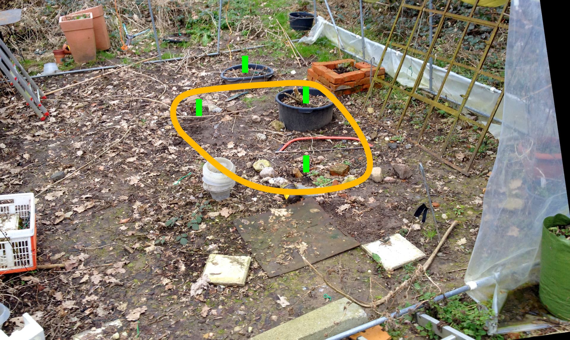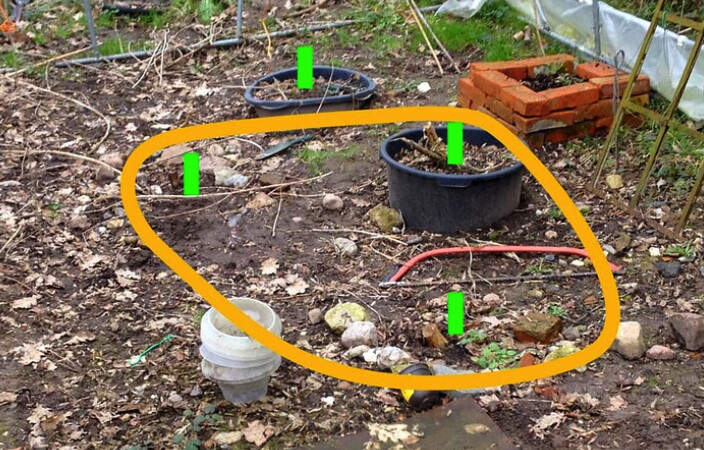 ‚Auf mehrere Jahre‘ heißt halt, einen Spot festzulegen, den man dann gezielt optimiert. Aber eigentlich ist der Schritt schon getan: das markierte Beet ist schon der beste Platz, was Sonnenscheindauer und Bodenqualität angeht.
