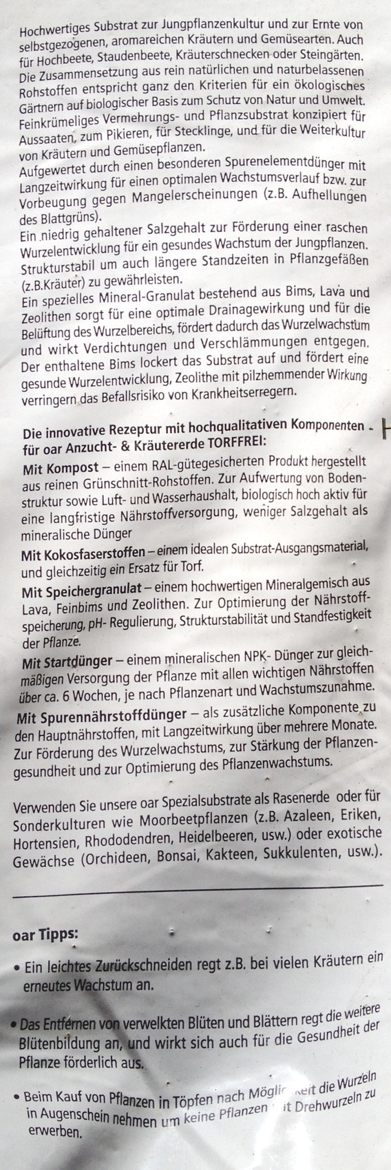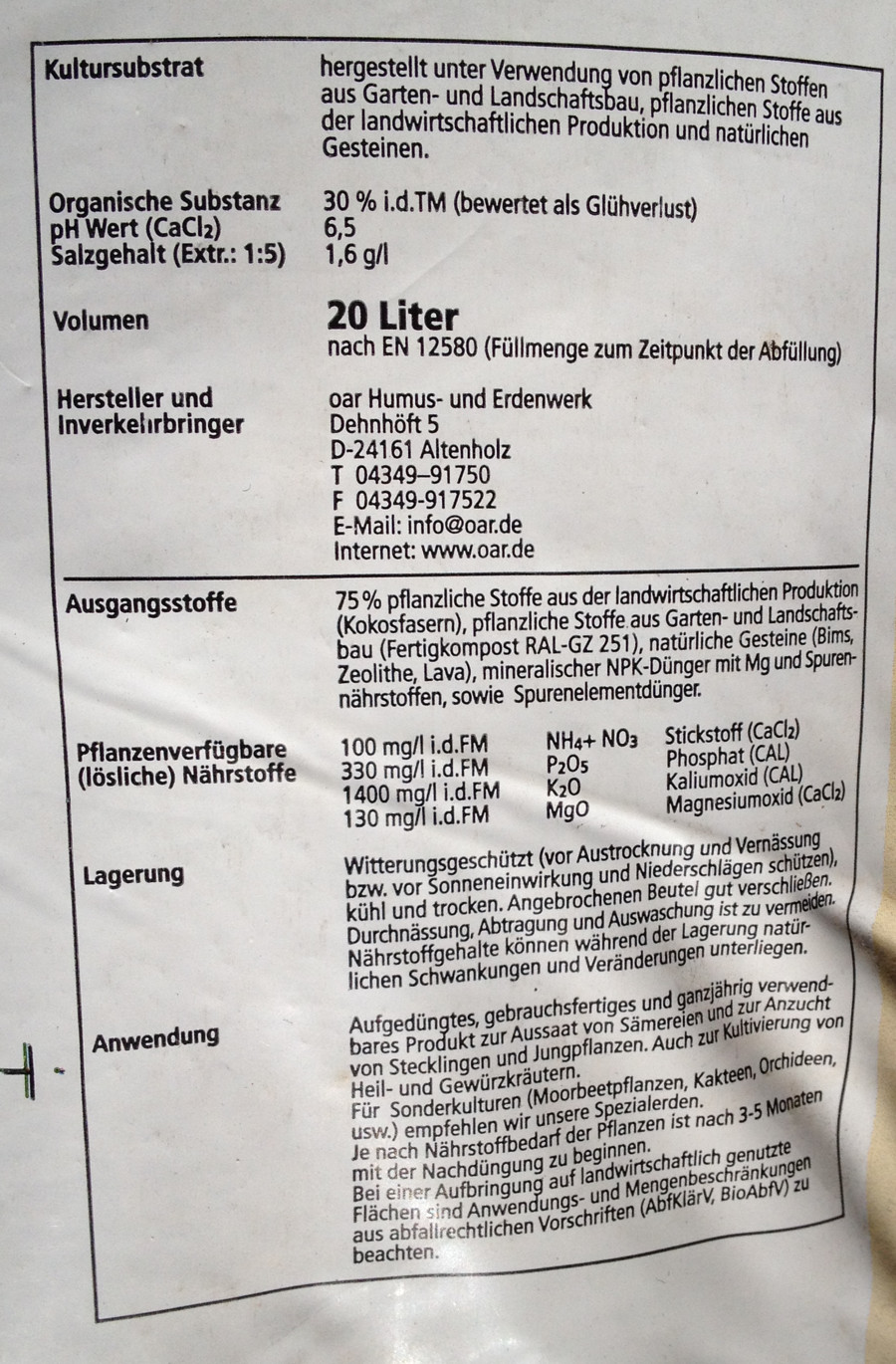 Neulich gabs im Supermarkt (famila) diese Erde für 4 € / 20 liter. Kann man erstmal nicht meckern; torffrei, mit Nährstoffspeicher & Wurzelaktivator …