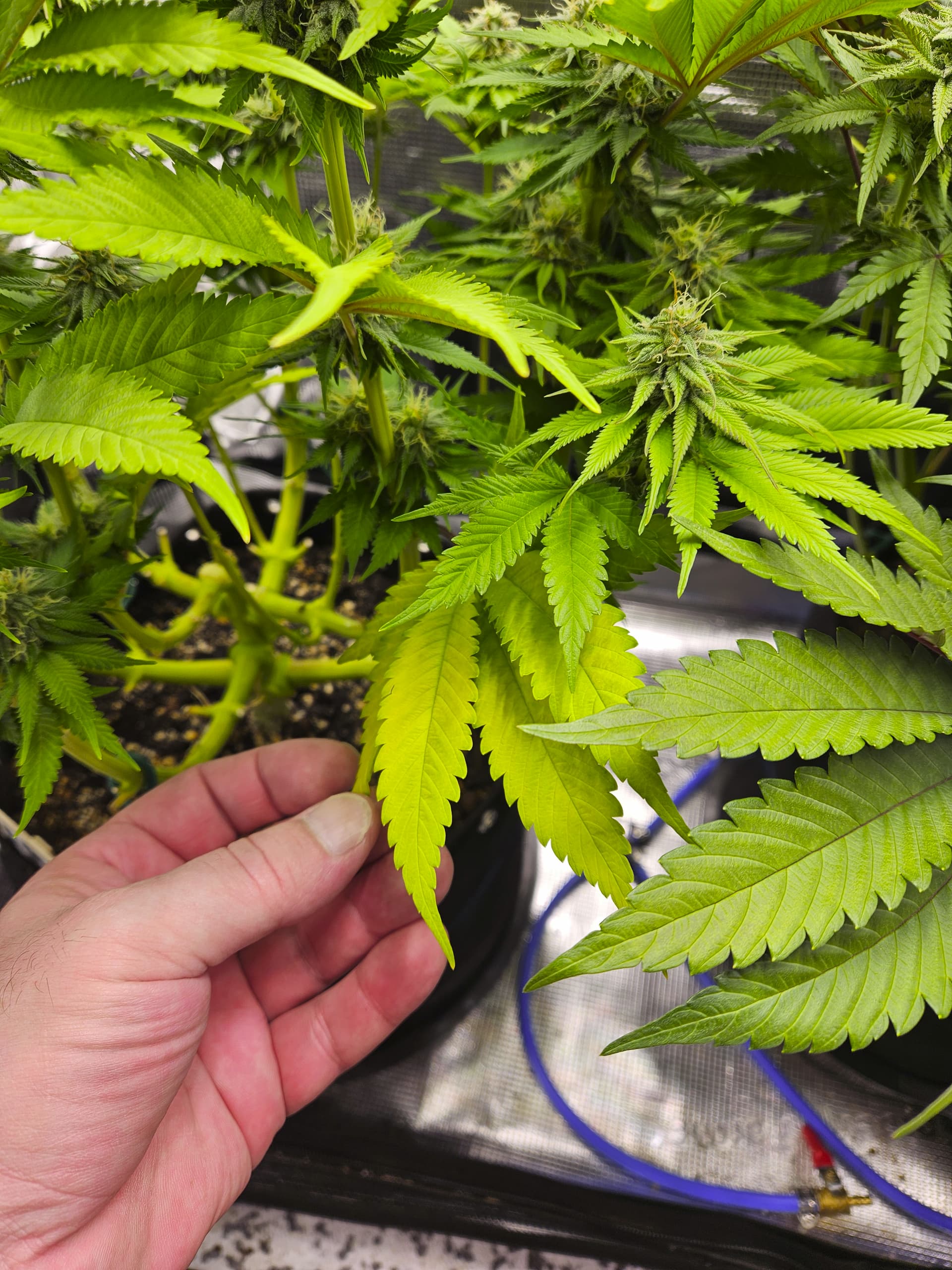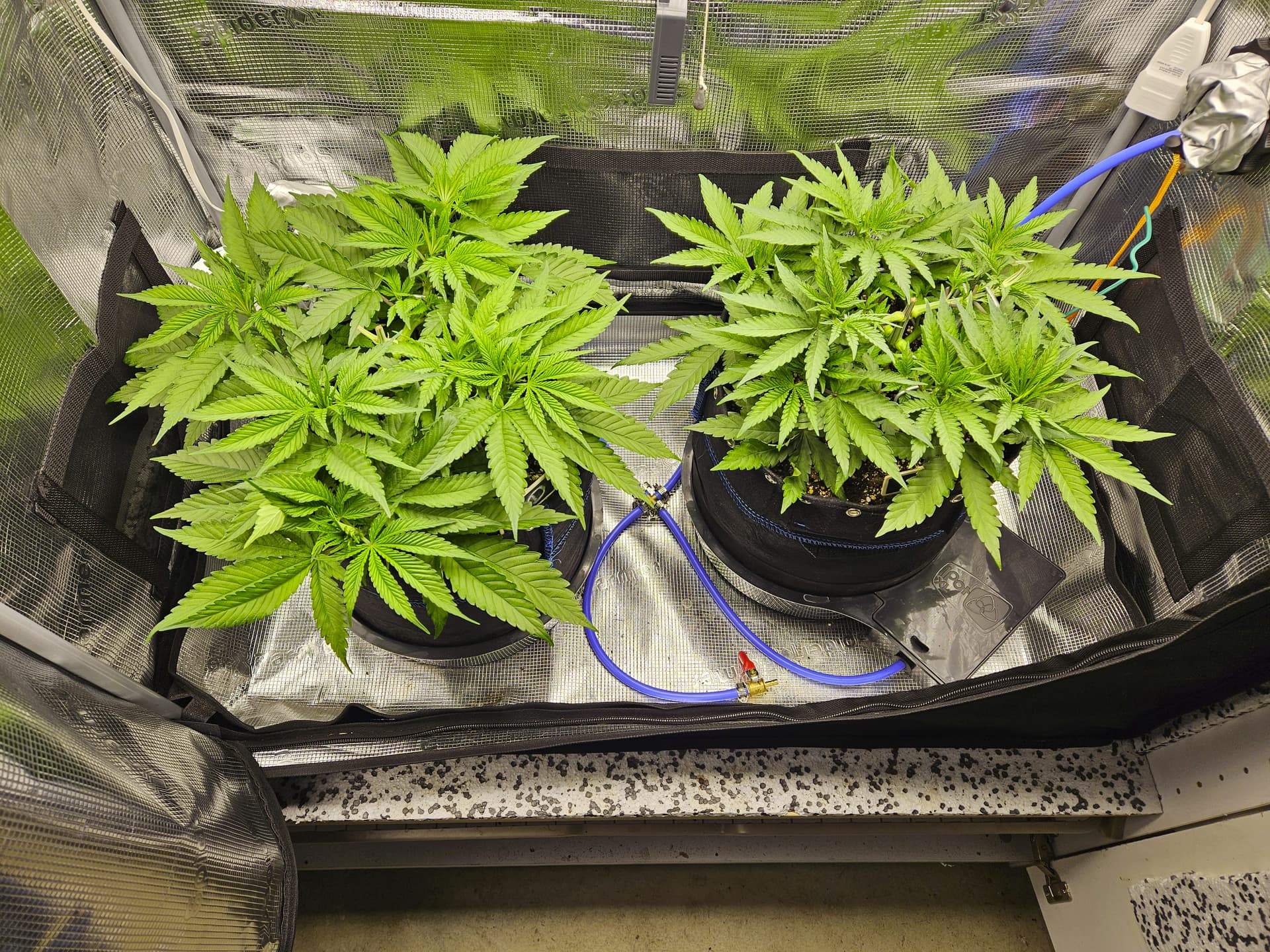 Unten kahmen ca. 4 cm. Blähton/Seramis in den Topf (ohne Airbase) und beim umtopfen wurden beide nochmals mit MT Mix angeimpft. Leider war ich gestern nicht Giessen daher hängen sie etwas. Es wurden ca. 6 L (mit ca 500 ml Drain) pro Dame vergossen. Da es im grossen Topf das erste mal Giessen war, wurde in 12 L Wasser entsprechend Hubey Veggie Boost und Humin Extract aufgelöst bevor es vergossen wurde.