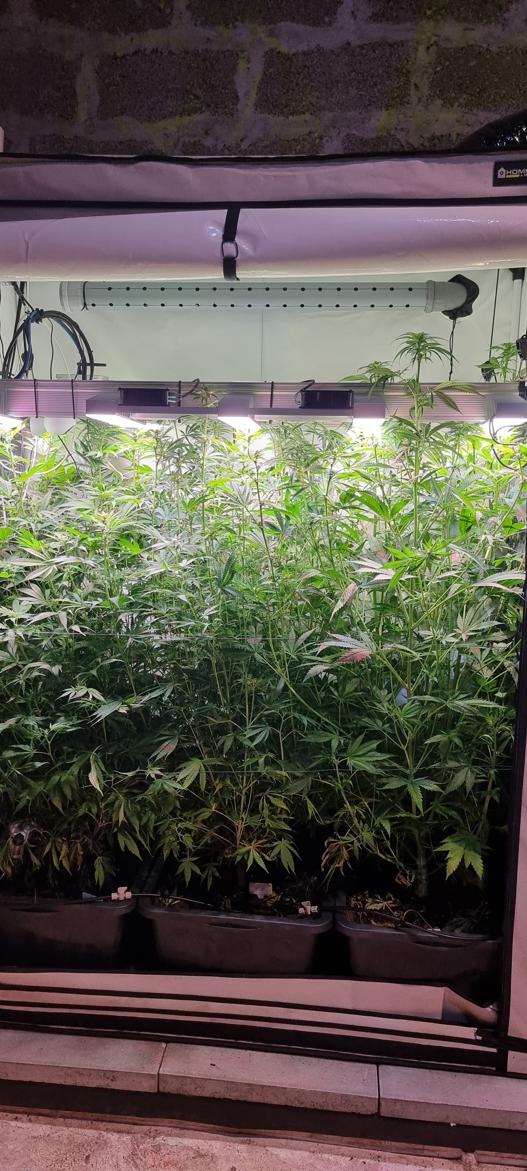 Würde da einiges Entlauben (Defoliation) und dann eventuell, wenn du die Möglichkeit hast eine Pflanze nach draußen stellen in die Sonne und da zu Ende bringen. Bei dir ist ja auch seitlich kein Platz mehr, nach hinten auch nicht, da kann man auch nicht vernünftig runterbinden (finde ich). Alternativ kannst du auch die Lichtintensität runter dimmen wenn sie näher zu Lampe wachsen.