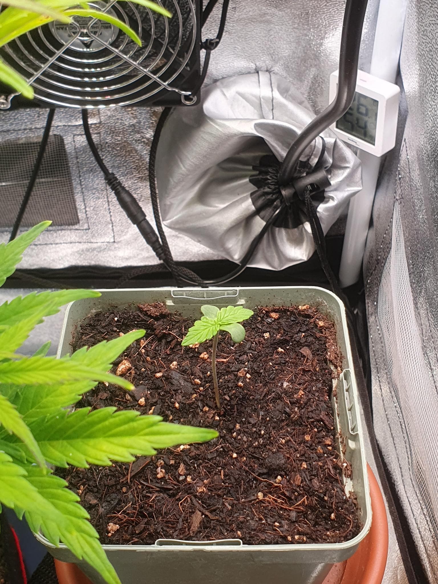 Bei mir läuft es ja nicht so rund mit dem Sonnenerde-Grow, aber die Idee dahinter/living soil hat es mir schon angetan und es sind nur 2 Pflanzen, also gibt es seit letztes WE einen kleinen Untermieter im Zelt, den ich am So. dann in einen 10l Stofftopf mit aufgepeppter BB-AllMix-Erde umbetten wollte.
