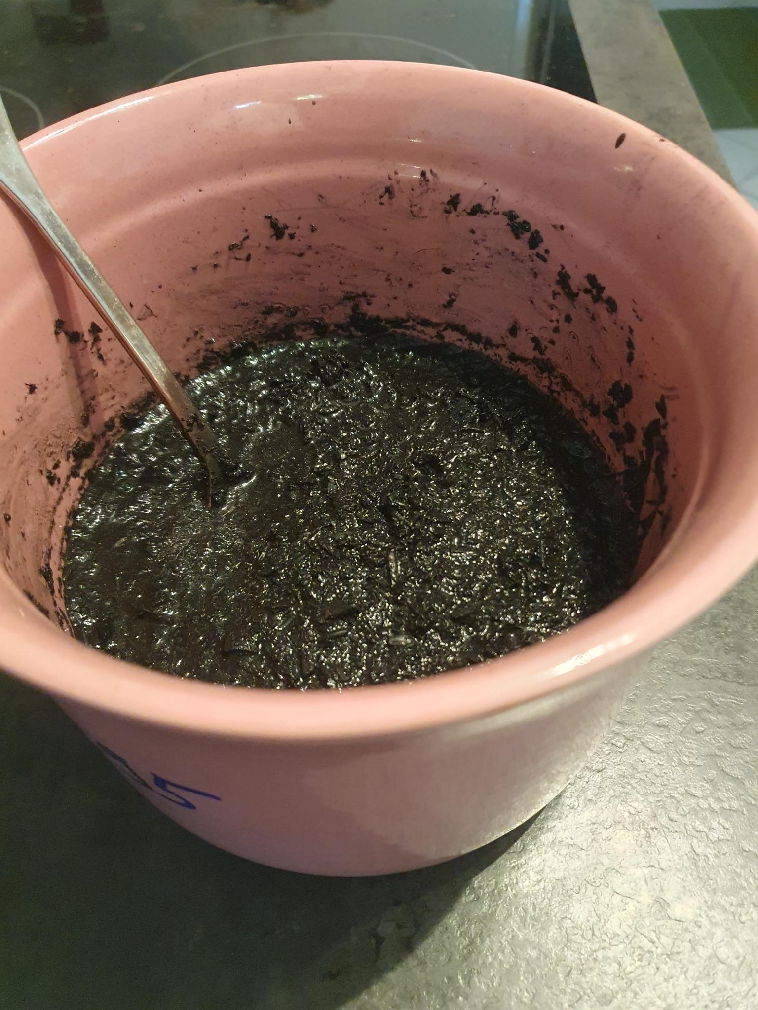 War danach recht schwer das gleichmäßig mit der Erde zu vermischen, weil es geklumpt hat.