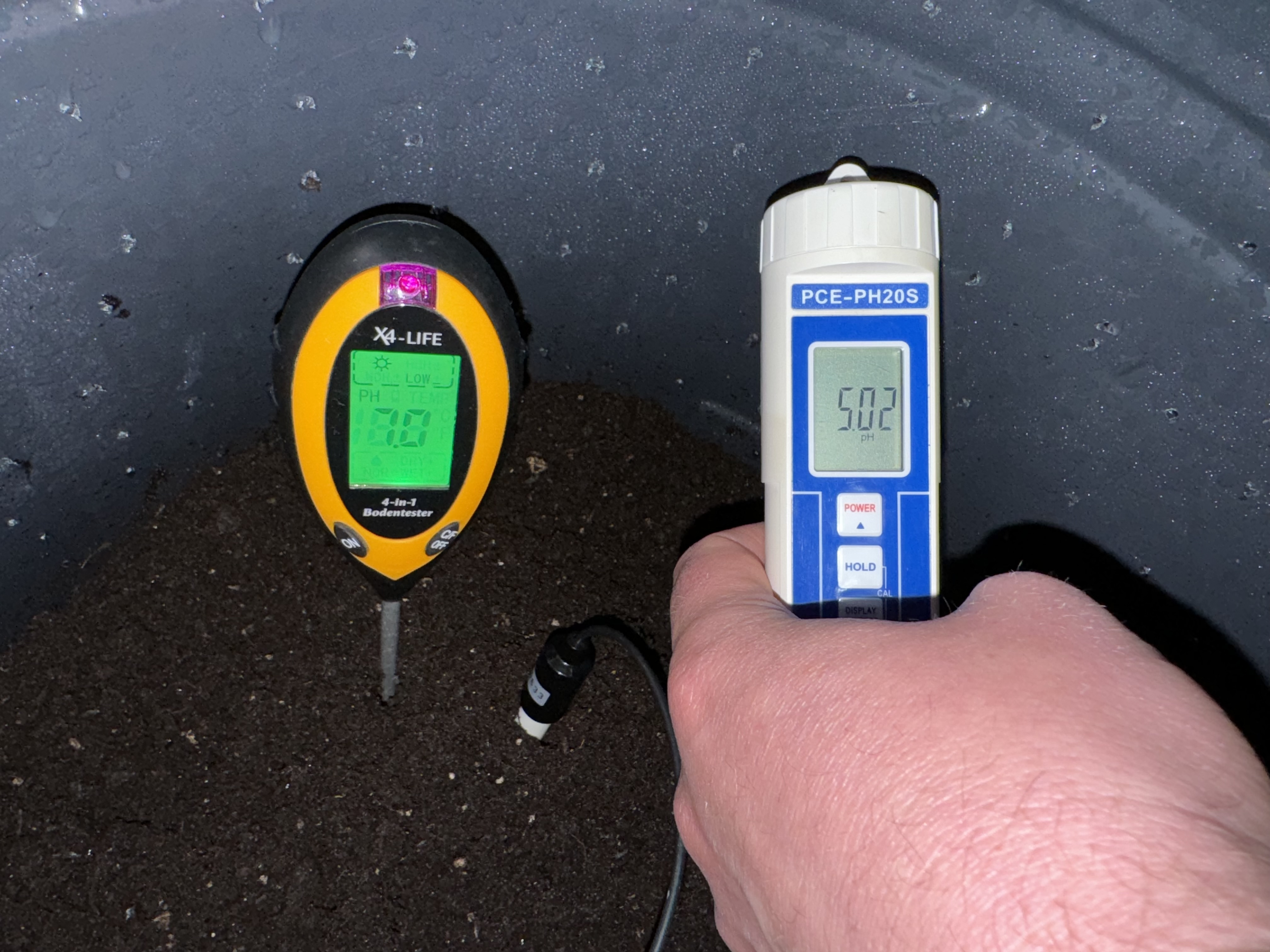 Da ich das Schrott Gerät seit Jahren hier rum fliegen habe und mittlerweile auch ein uneingeschränkt zu empfehlendes Gerät besitze (PCE PH20s), möchte ich die hier getroffenen Aussagen mal belegen. Hier ein direkter Vergleich in 2 verschiedenen Substraten.