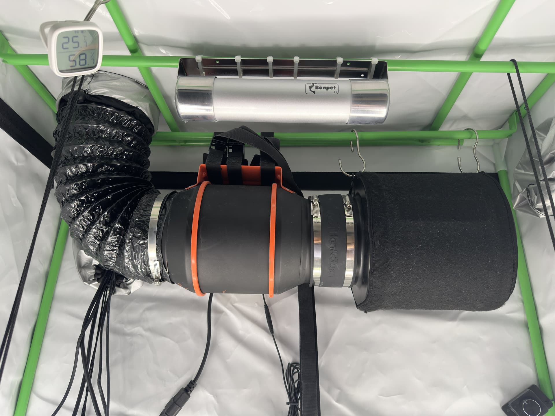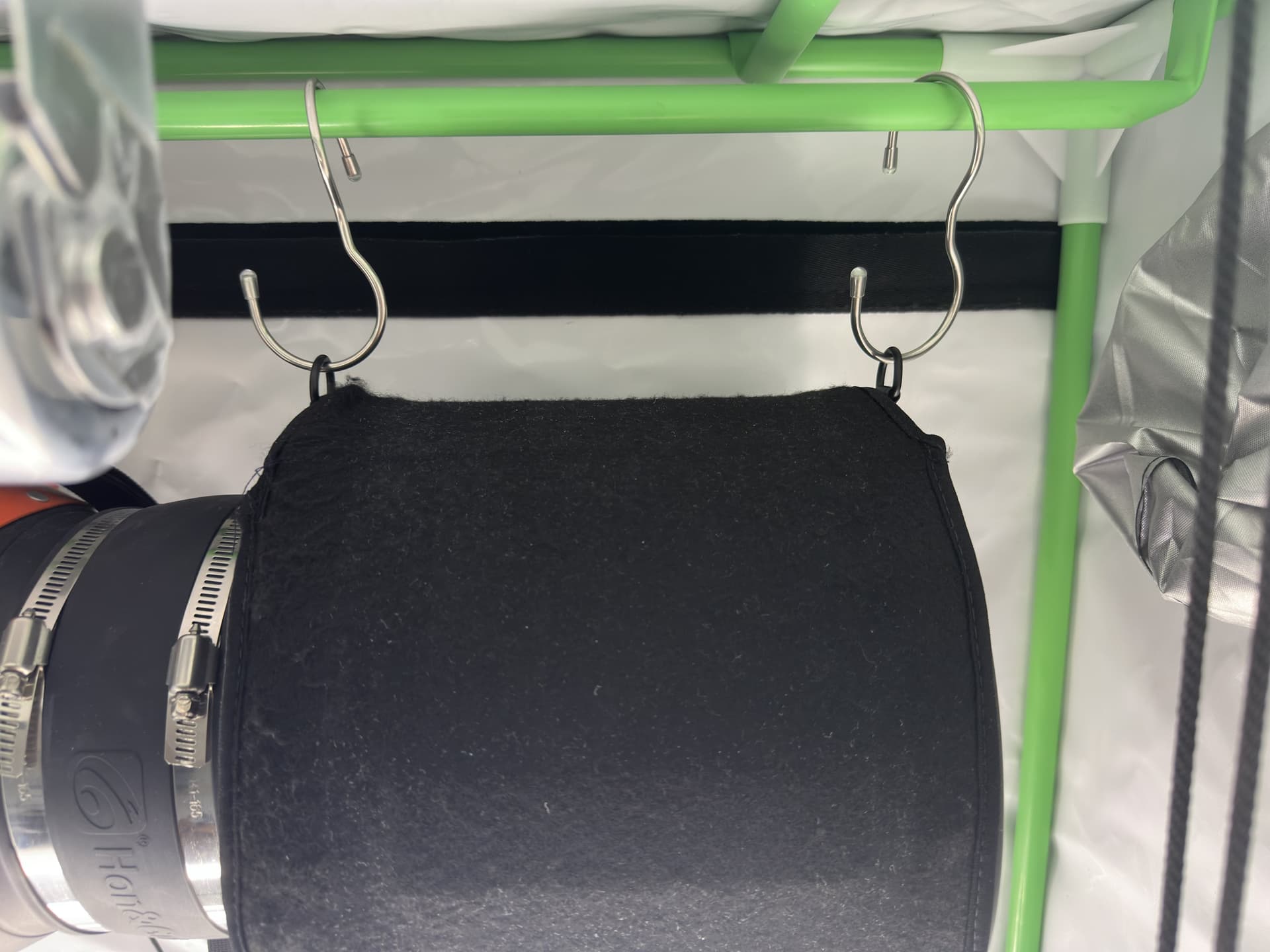 Ich habe diese 90-Grad gewinkelten Haken gefunden, mit welchen man wunderbar den Aktivkohlefilter aufhängen kann. So, dass man ihn super einfach auch wieder abhängen kann, um beispielsweise den Überzug mal auszuwechseln.