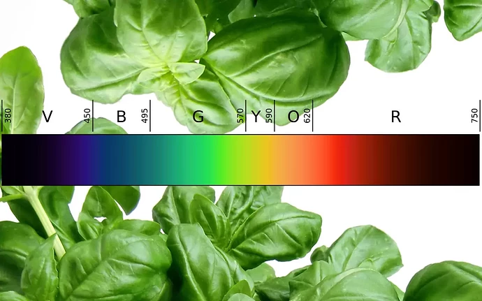 Alle Photonen, die eine Wellenlänge zwischen 400nm und 700nm werden gleichermaßen zu der von der Pflanze nutzbaren Energie gezählt. Beispielsweise ein „grünes Photon ~550nm“ zählt genau so viel wie ein „rotes Photon ~660nm“ Pflanzen können jedoch nicht gleich viel Energie aus den verschiedenen Quellen ziehen. Das grüne Licht wird zum Großteil reflektiert, was auch der Grund ist, dass sie für das menschliche Auge grün sind.