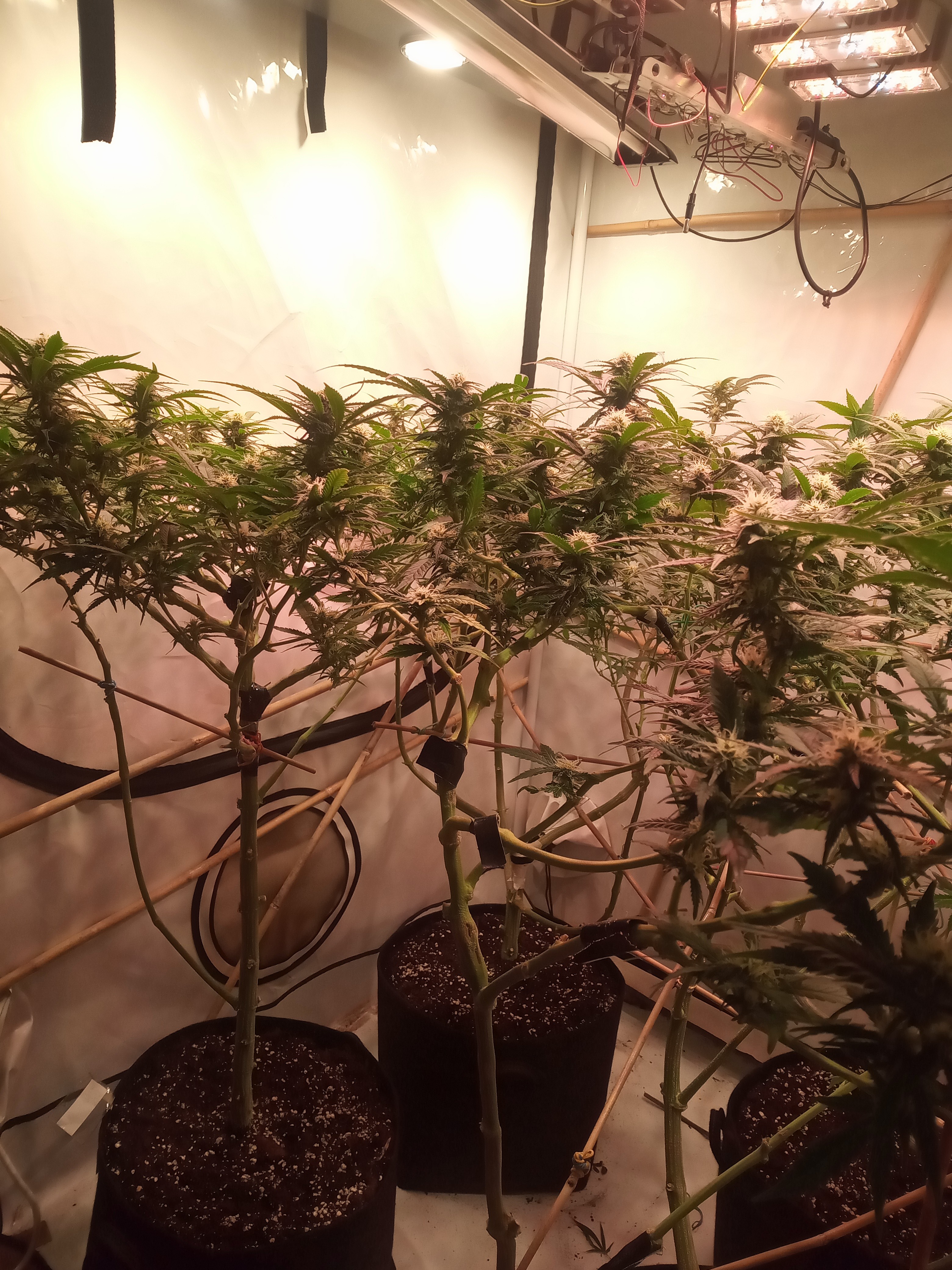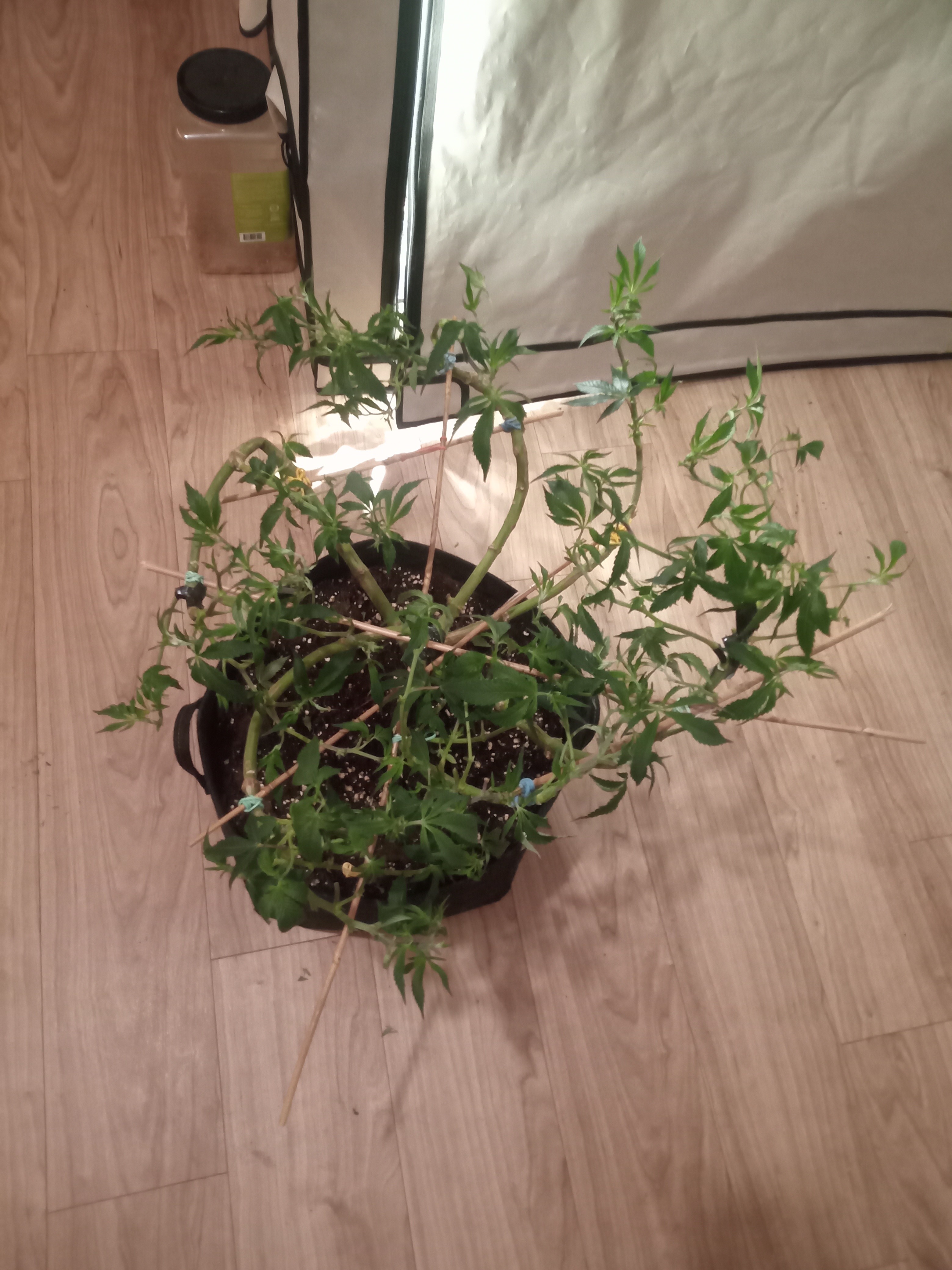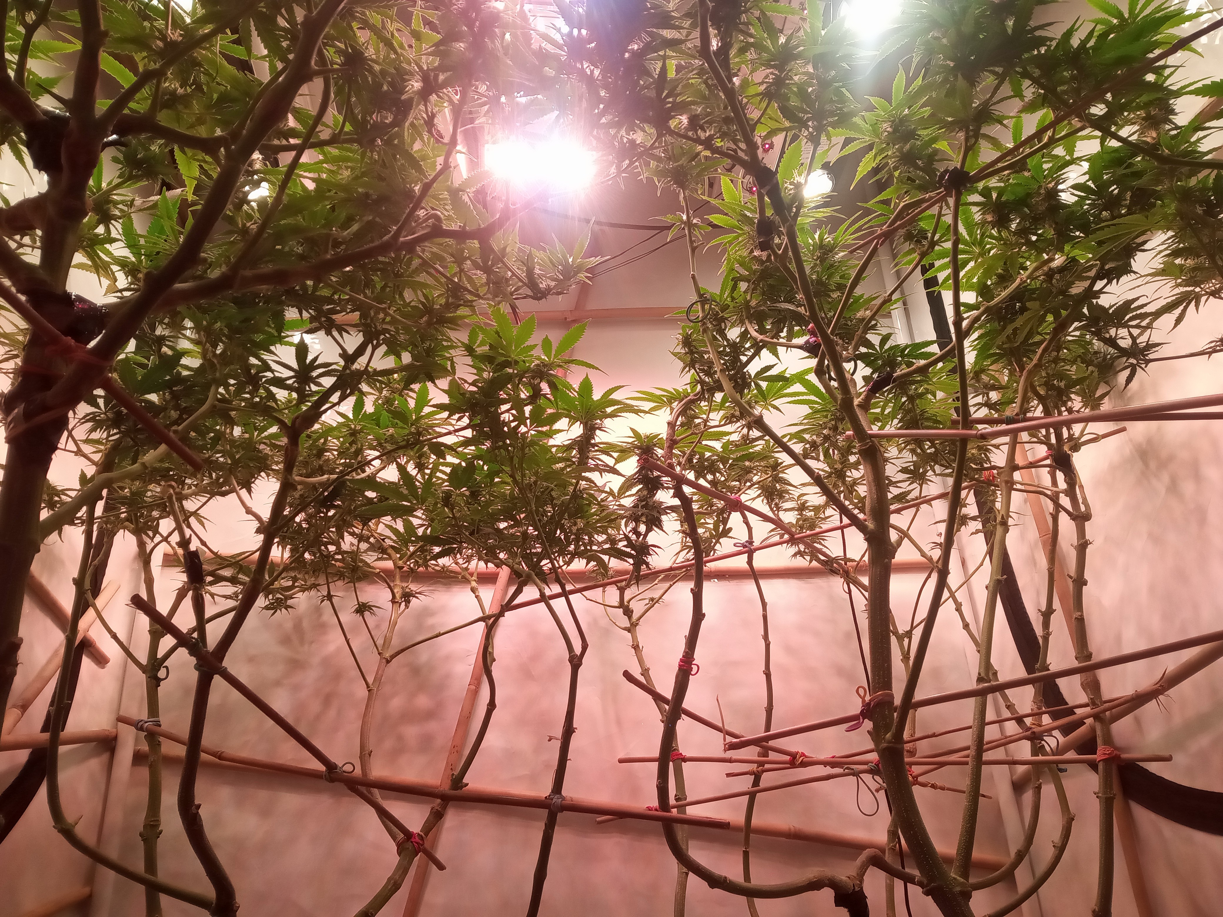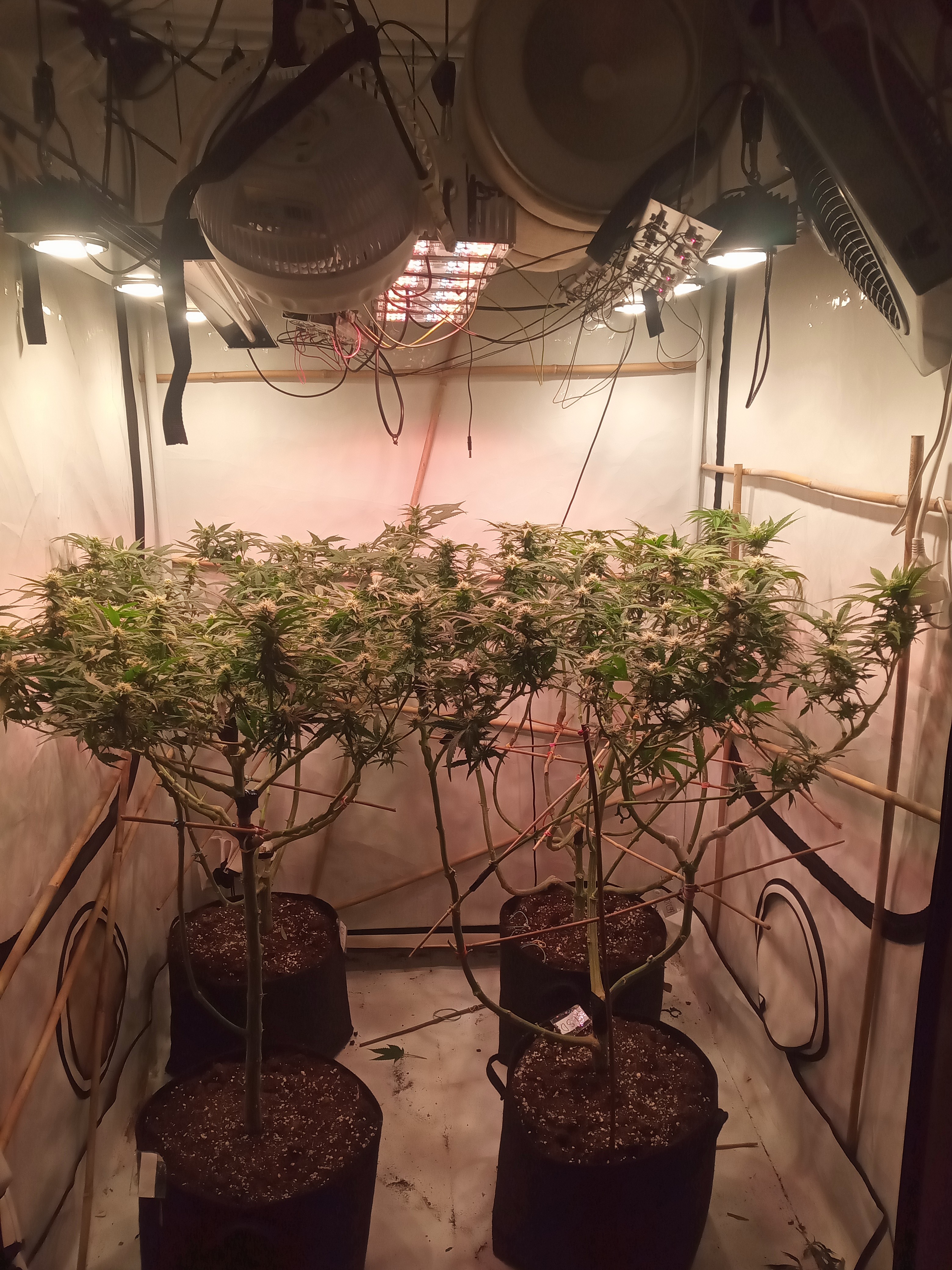Ungewöhnliche Technik. Die Pflanzen werden in Achsialrotation zu einem lateralen Oktagramm trainiert. Ich nehme an, dass hierbei die Lichtausbeute aka Manifolding im Vordergrund steht, allerdings scheinbar ohne die expliziten Vorteile des Manifolding in Form der gleichmäßigen Wuchsverteilung aller Mains durch „Hub-isierung“ der Internodien zu gewährleisten. Da frage ich mich, warum nicht von Beginn an ein Manifold gelegt wurde, bzw. wo der Vorteil dieser Technik liegt. Zeitersparnis?