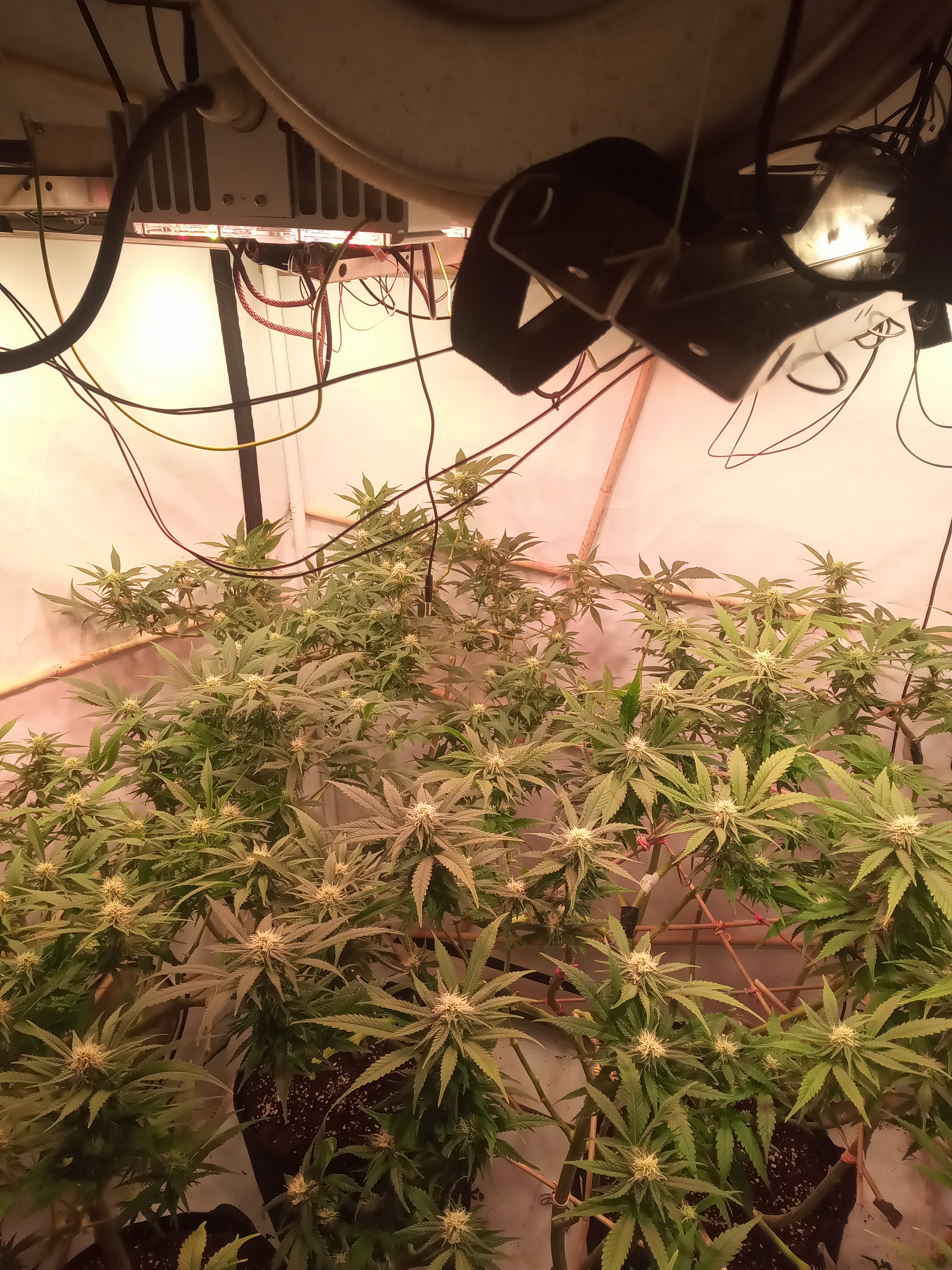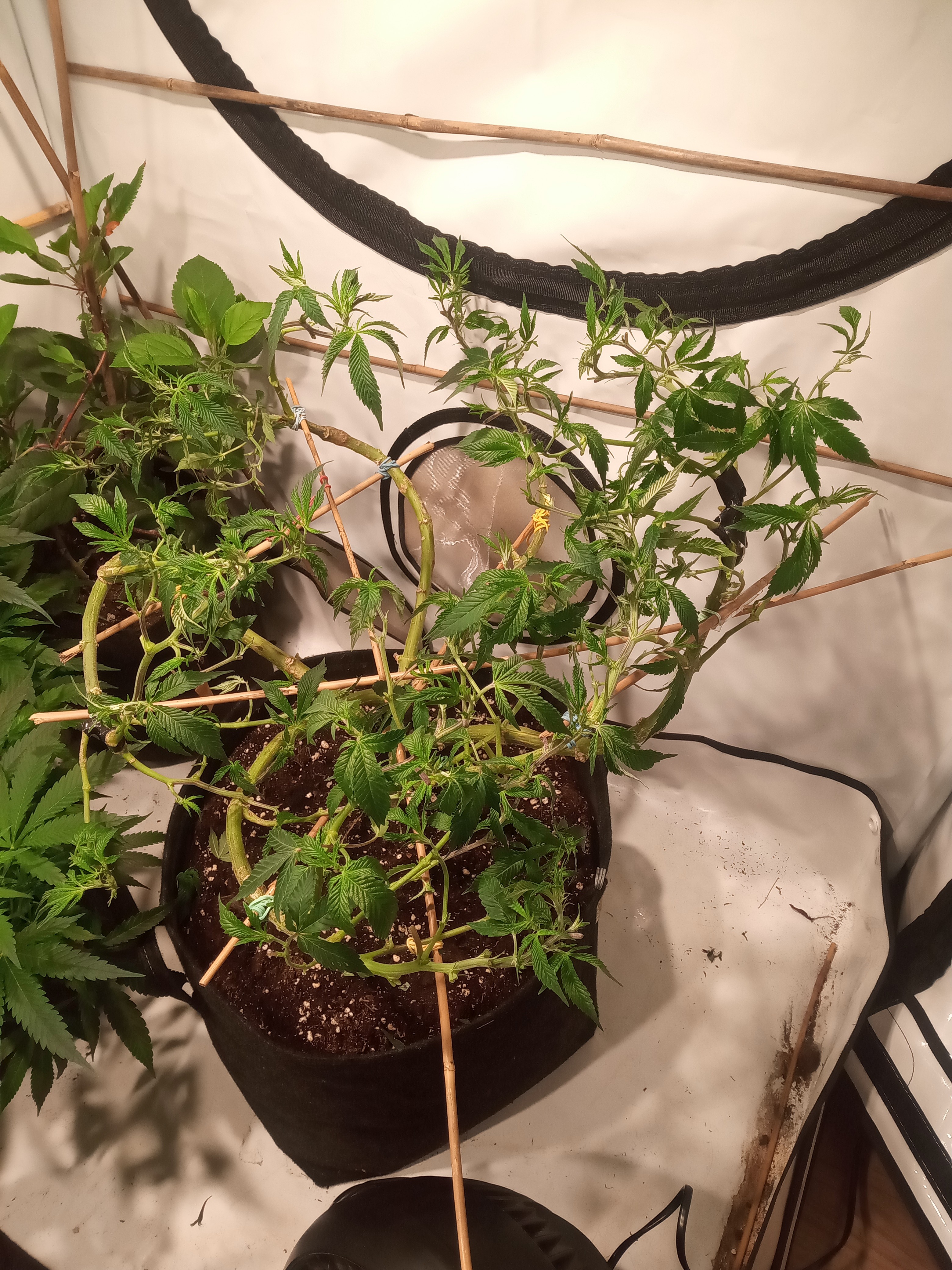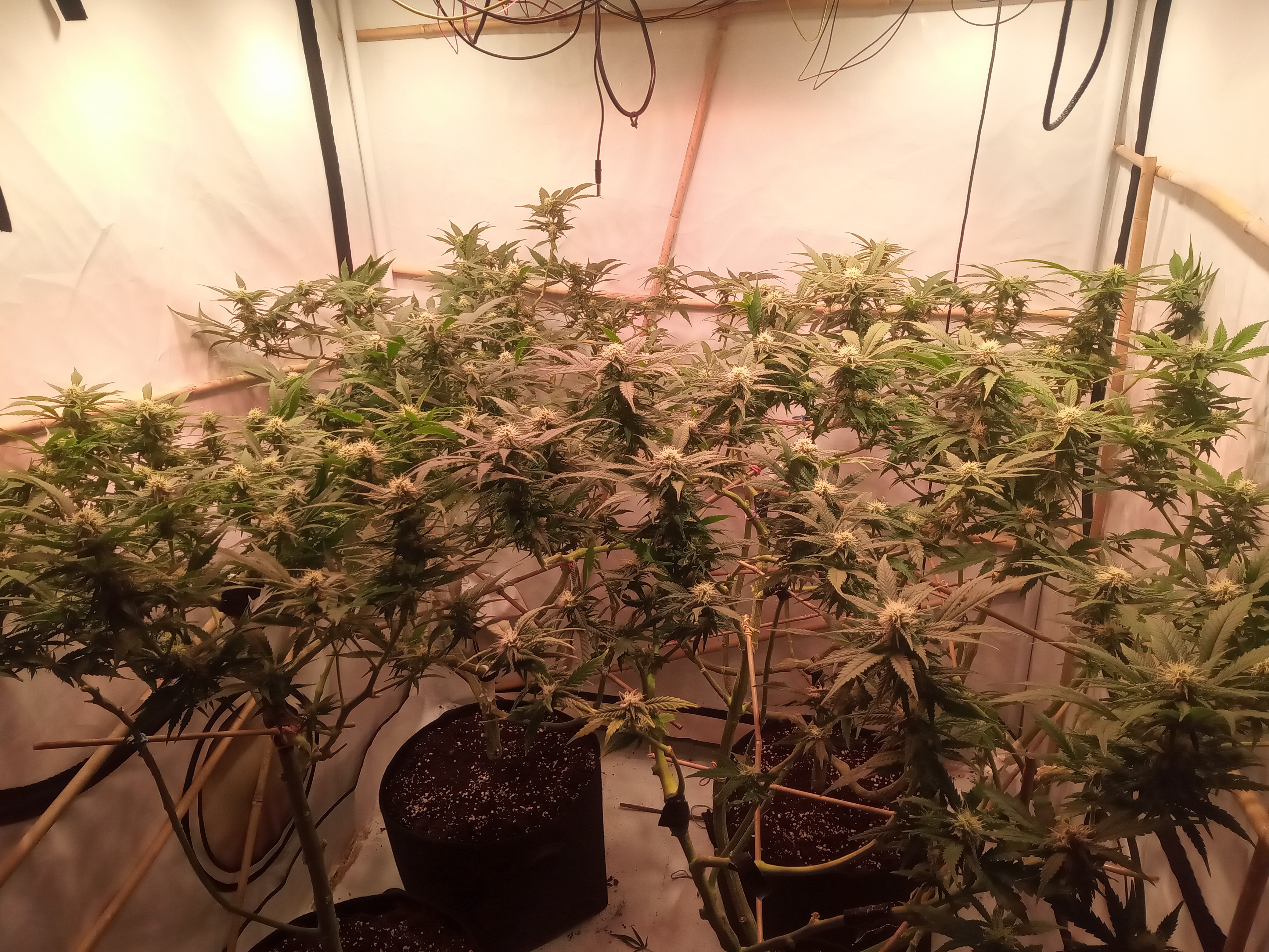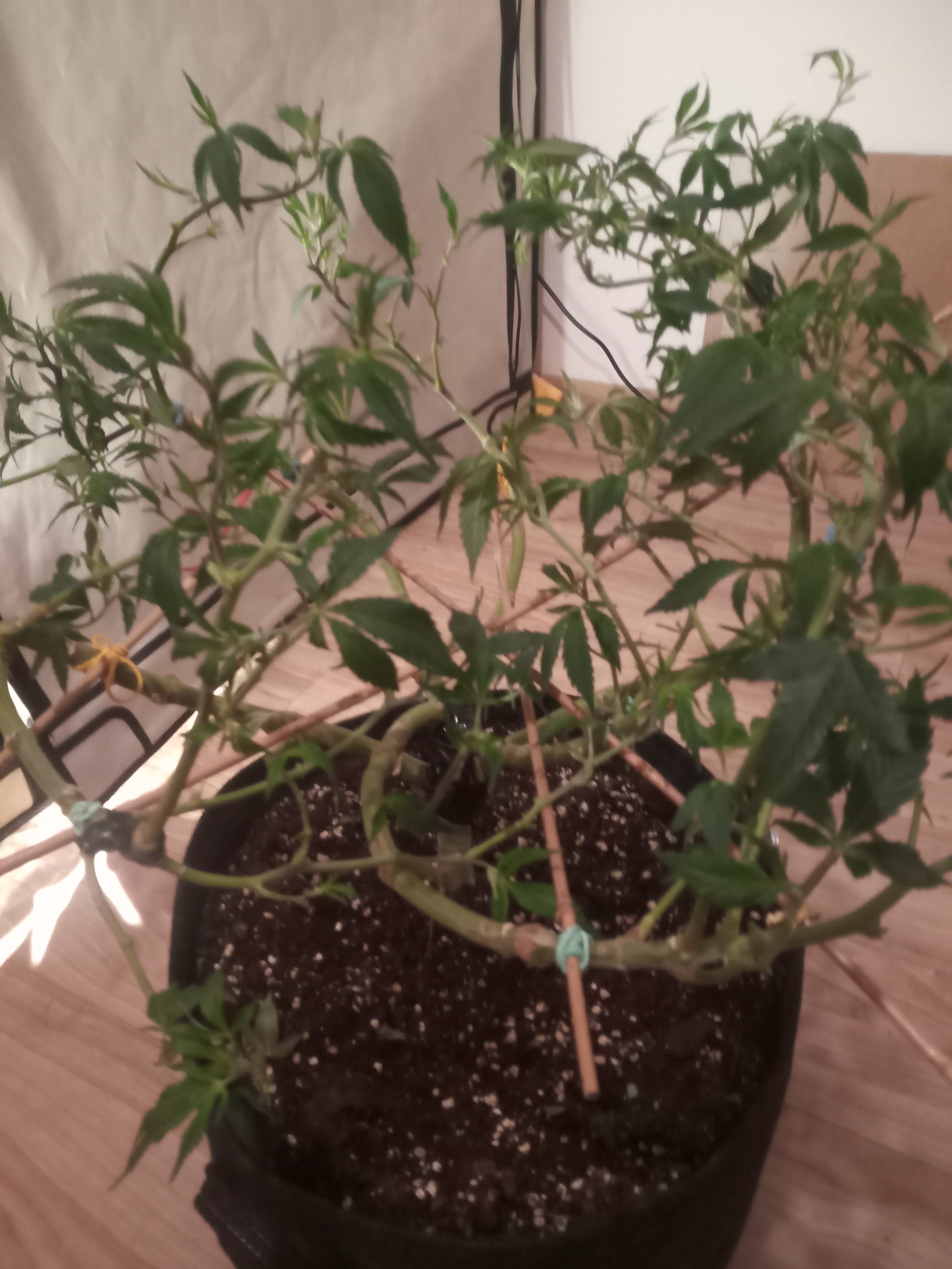 Ungewöhnliche Technik. Die Pflanzen werden in Achsialrotation zu einem lateralen Oktagramm trainiert. Ich nehme an, dass hierbei die Lichtausbeute aka Manifolding im Vordergrund steht, allerdings scheinbar ohne die expliziten Vorteile des Manifolding in Form der gleichmäßigen Wuchsverteilung aller Mains durch „Hub-isierung“ der Internodien zu gewährleisten. Da frage ich mich, warum nicht von Beginn an ein Manifold gelegt wurde, bzw. wo der Vorteil dieser Technik liegt. Zeitersparnis?