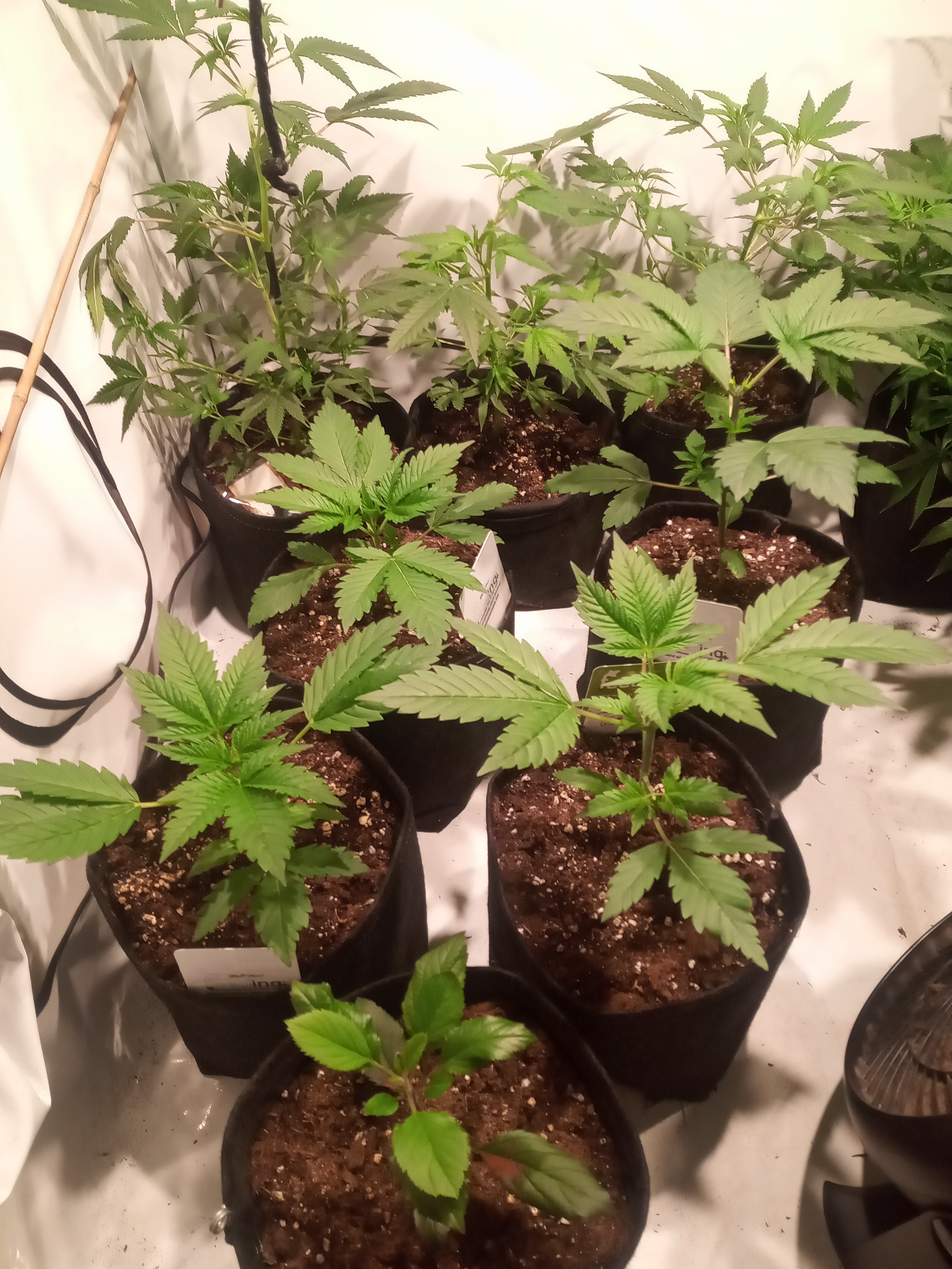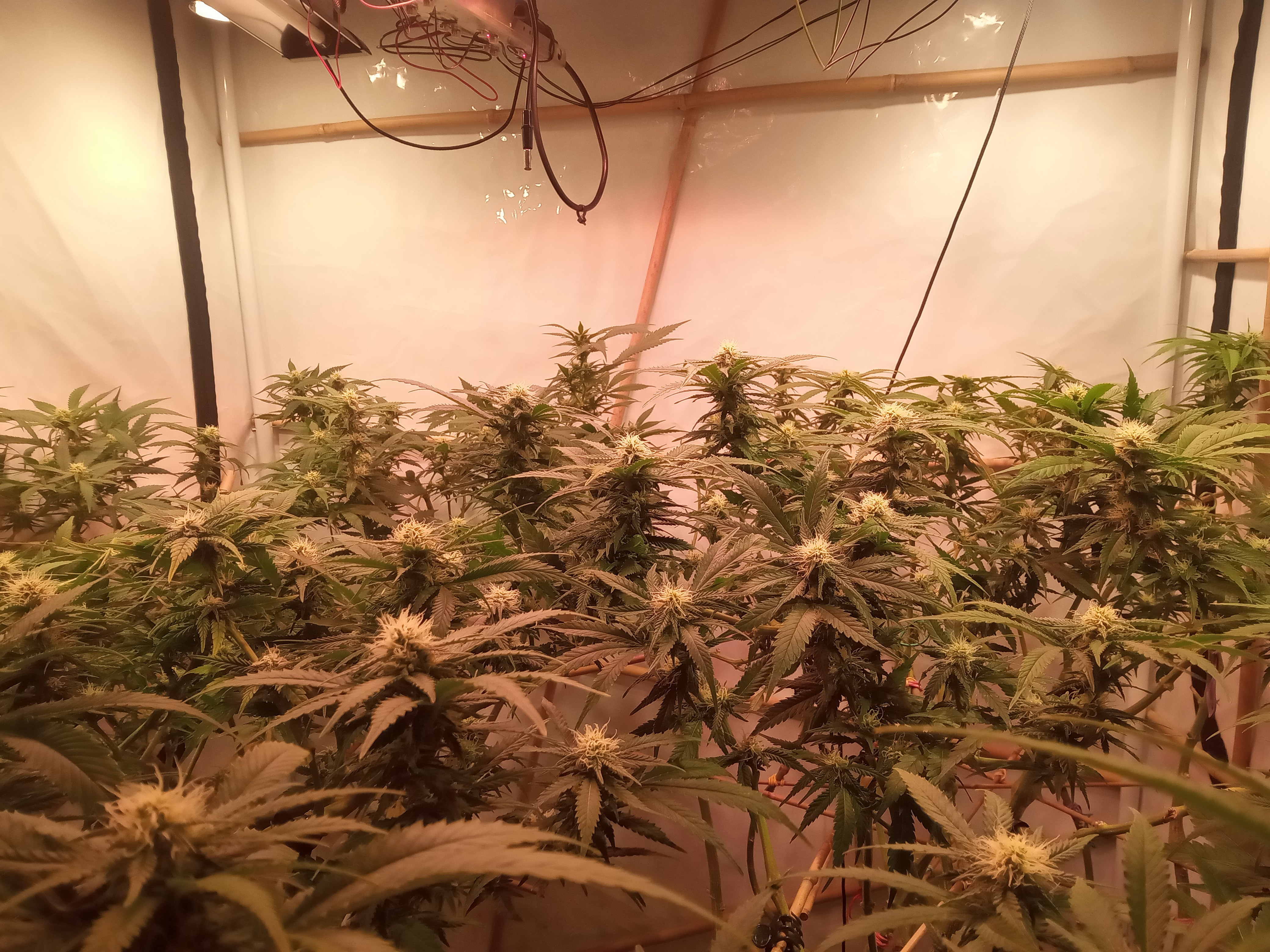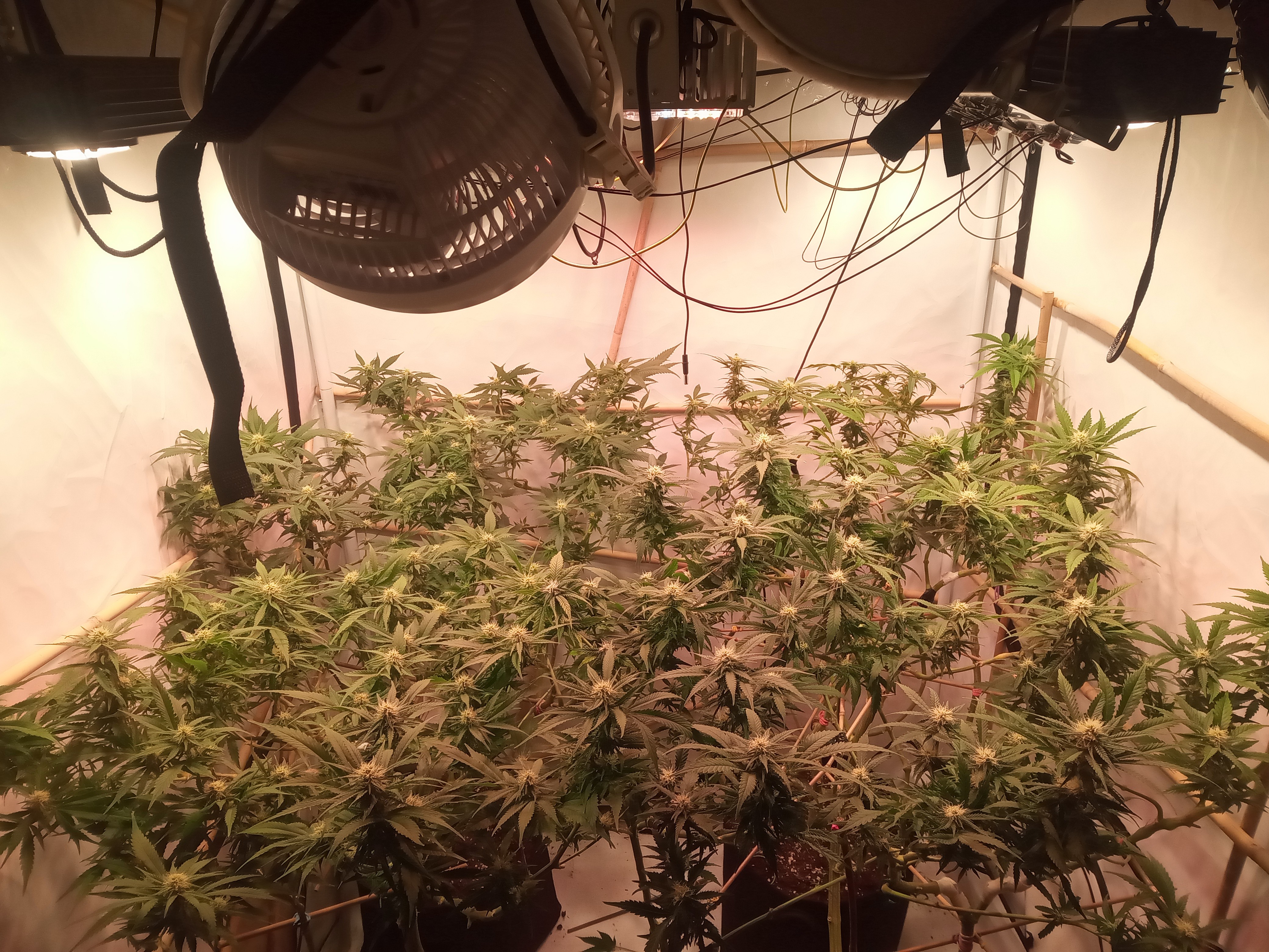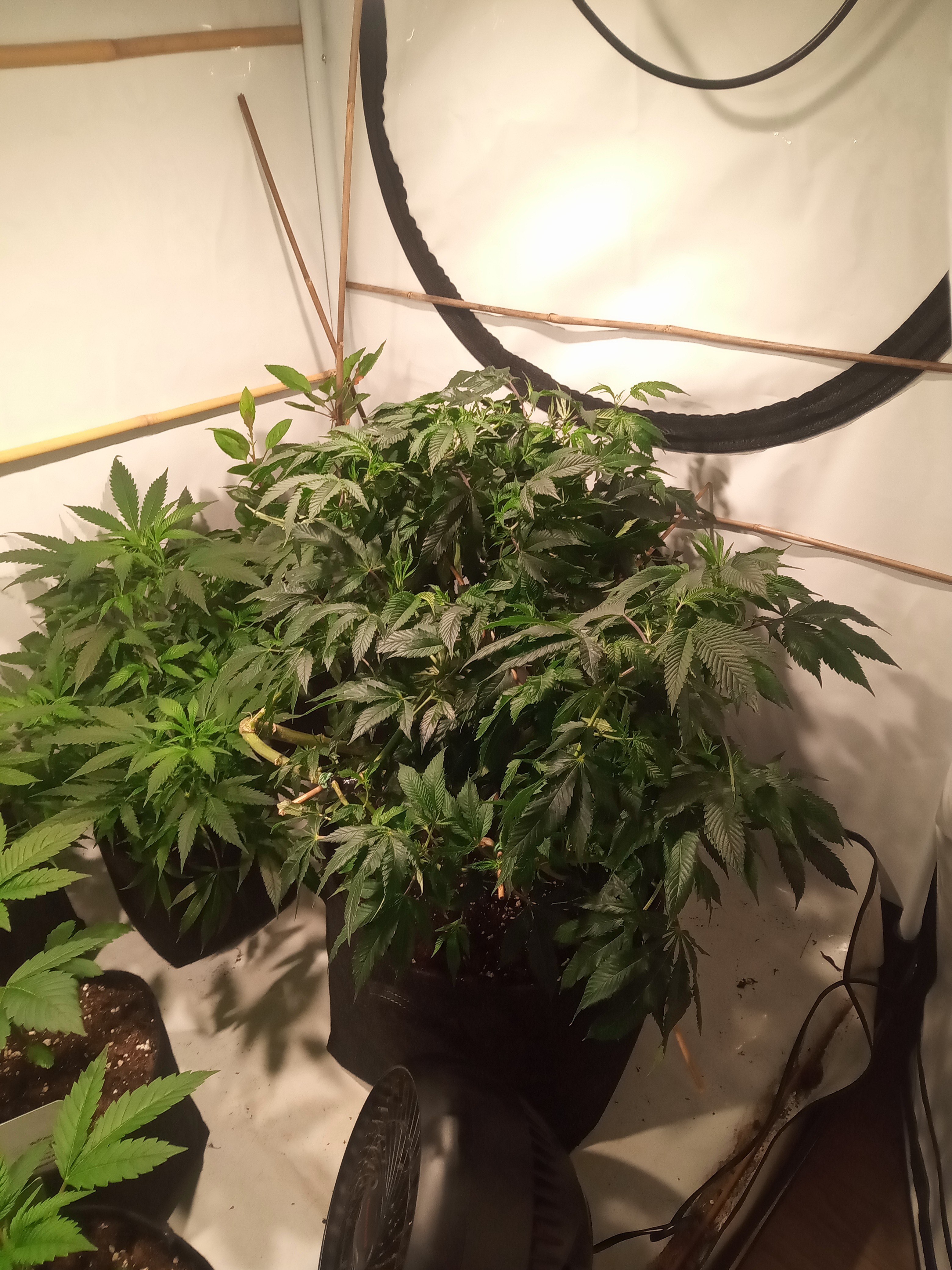 Ungewöhnliche Technik. Die Pflanzen werden in Achsialrotation zu einem lateralen Oktagramm trainiert. Ich nehme an, dass hierbei die Lichtausbeute aka Manifolding im Vordergrund steht, allerdings scheinbar ohne die expliziten Vorteile des Manifolding in Form der gleichmäßigen Wuchsverteilung aller Mains durch „Hub-isierung“ der Internodien zu gewährleisten. Da frage ich mich, warum nicht von Beginn an ein Manifold gelegt wurde, bzw. wo der Vorteil dieser Technik liegt. Zeitersparnis?