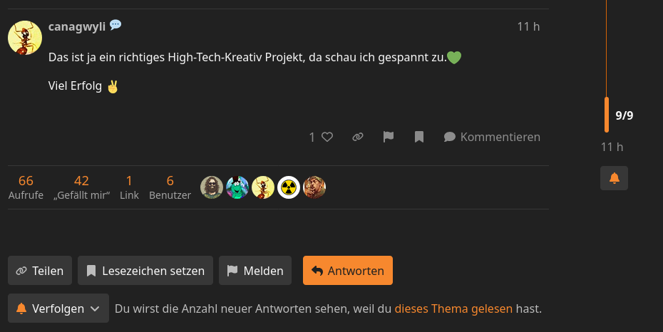So, jetzt ist ein oranger „Antworten“-Button ganz unten drunter. Nur den Eingangspost kann ich nach wie vor nicht kommentieren. Nuja, vielleicht gehört das auch so in diesem Journal-Modus.