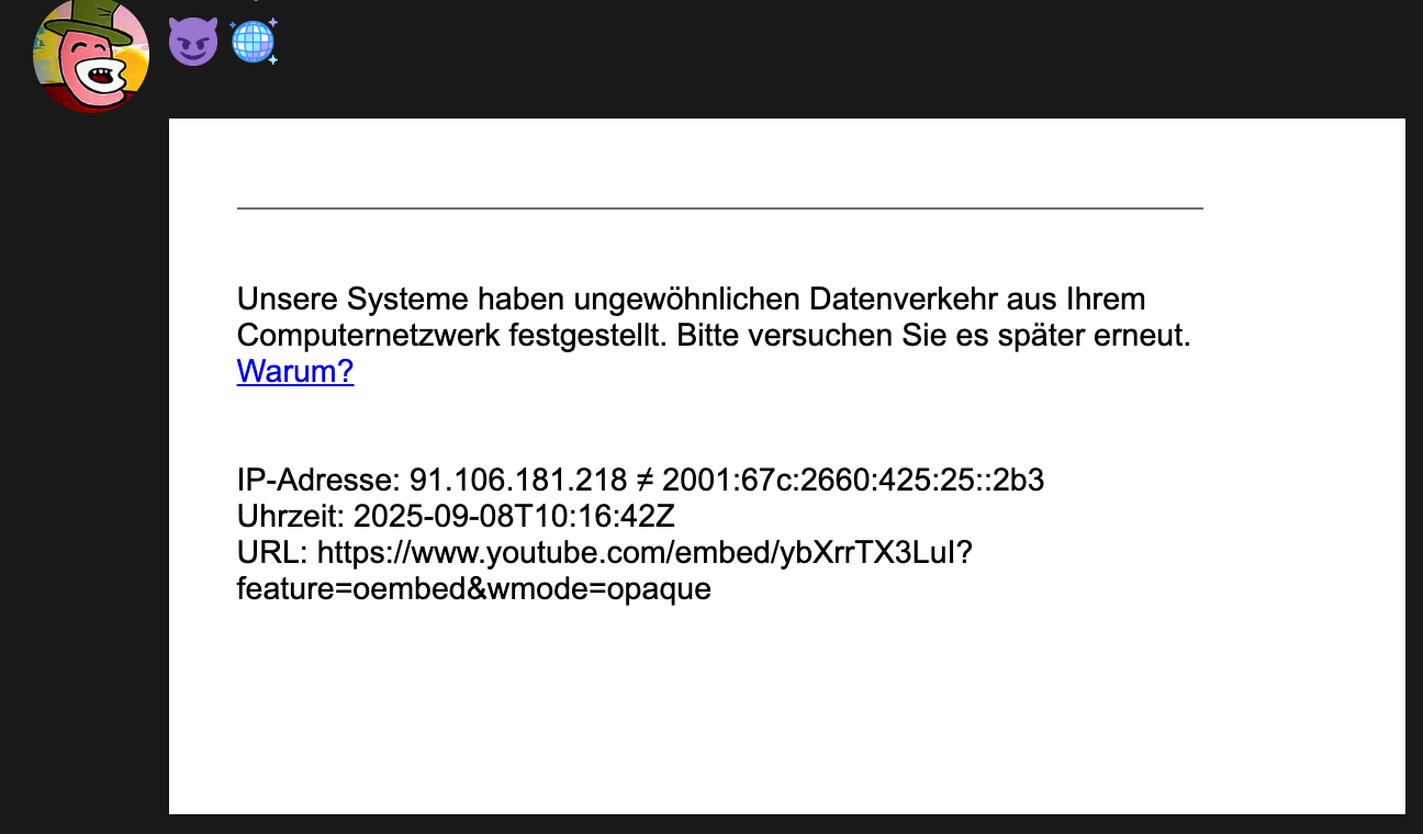 Stört nicht groß, meist geht es nach einiger Zeit wieder normal. Was ich mich nur frage: meint die Meldung meinen Datenverkehr (Opera VPN / edit: IP stimmt nicht überein) oder den des Forums? Also weigert sich YT, mir die Inhalte zu zeigen, oder dem Forum? Seht ihr diese Meldung auch öfter?