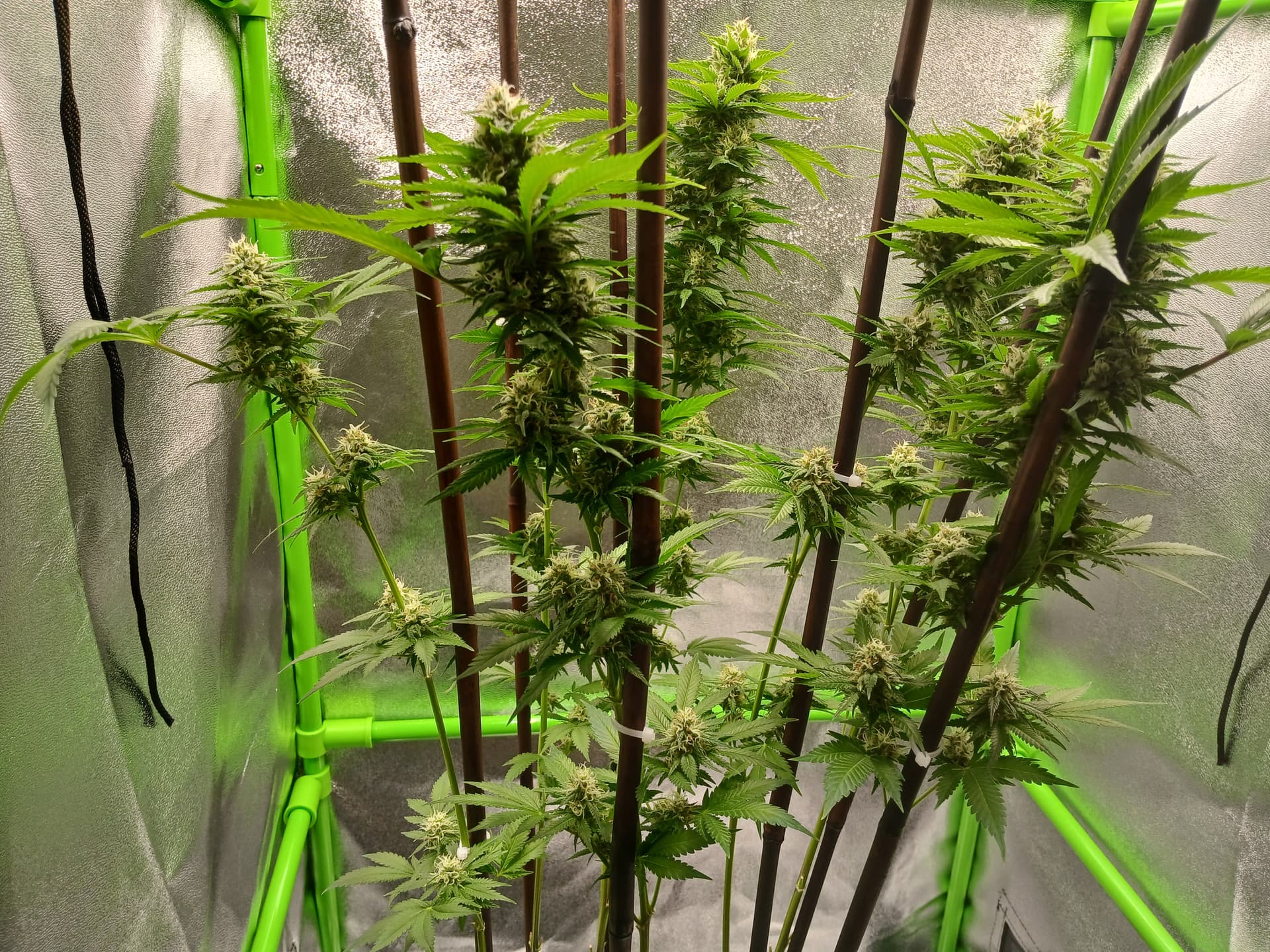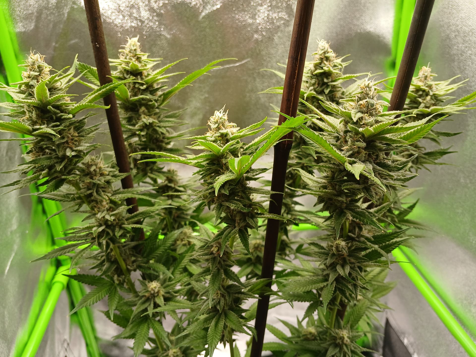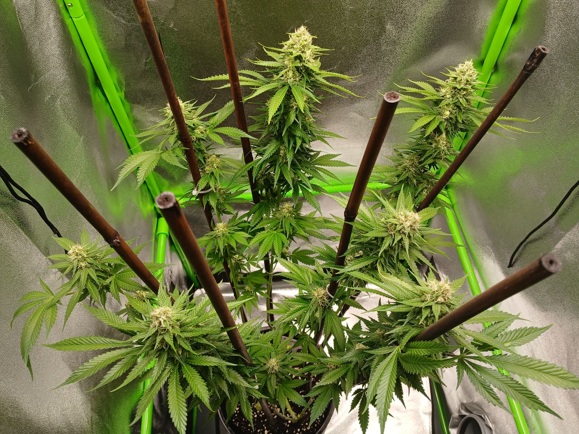 Ich werde jetzt eifach nur noch auf eine Bestimmte Zahl von Triebe gehen in dem ich einfach Toppe und mit den Seitentrieben arbeite. Werde auch nicht mehr flach legen mal sehen wie das so wird.
