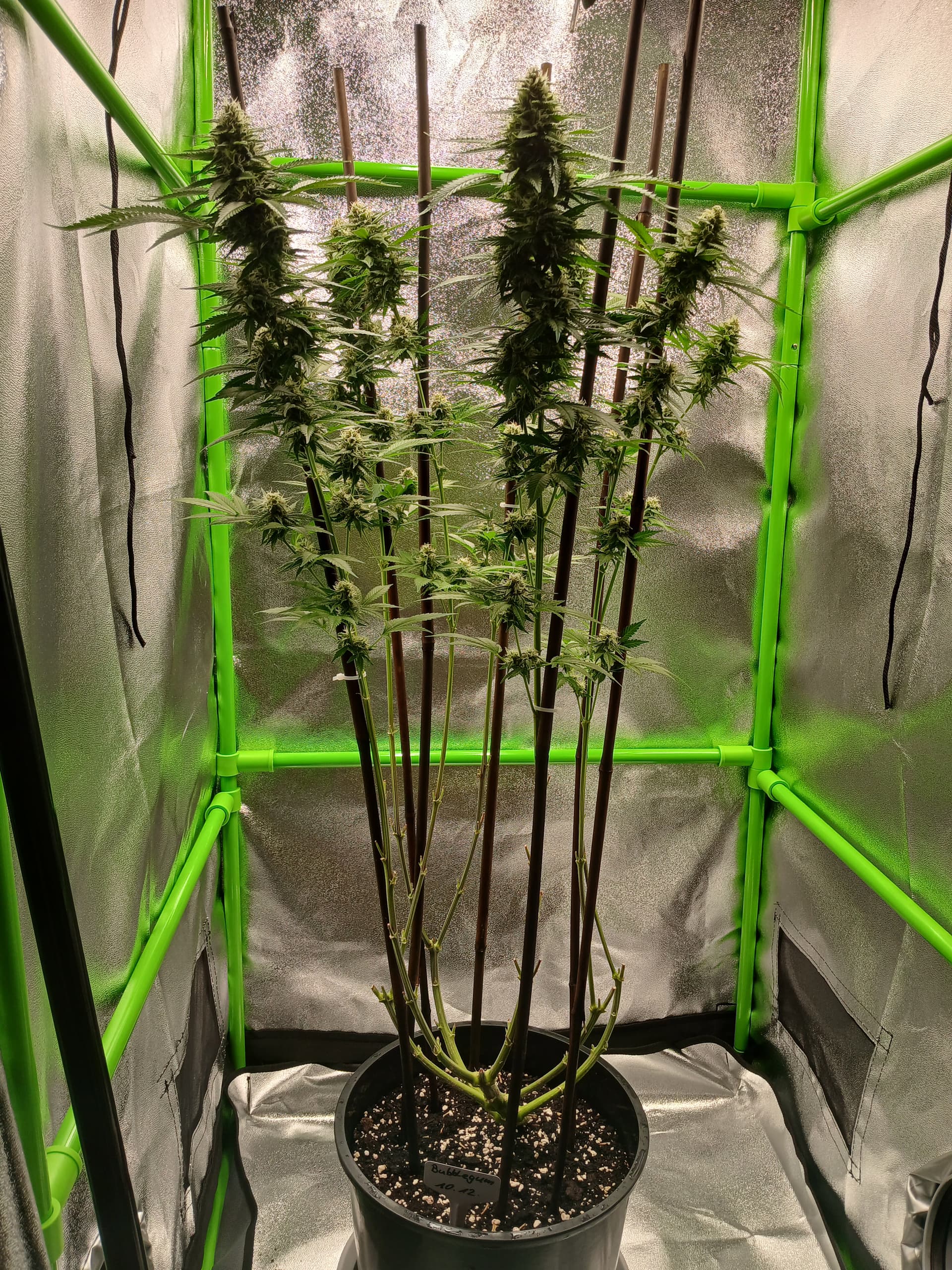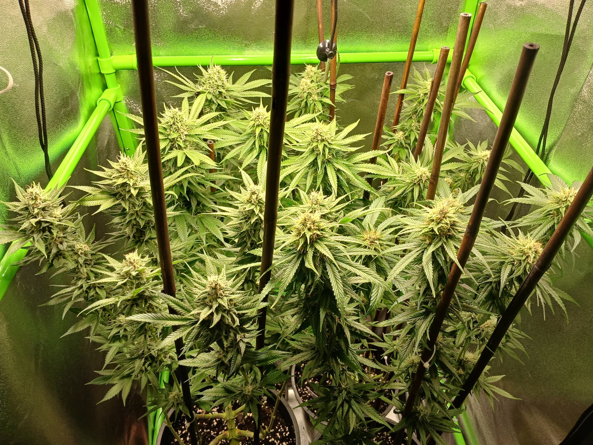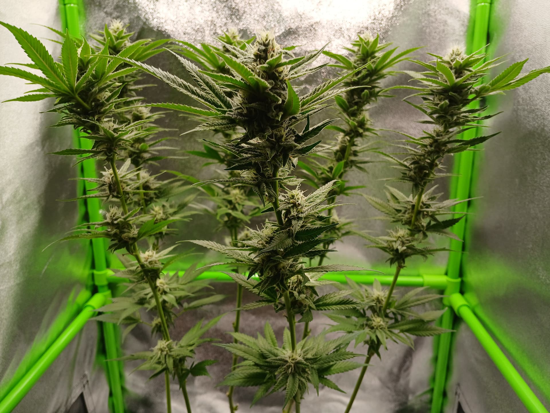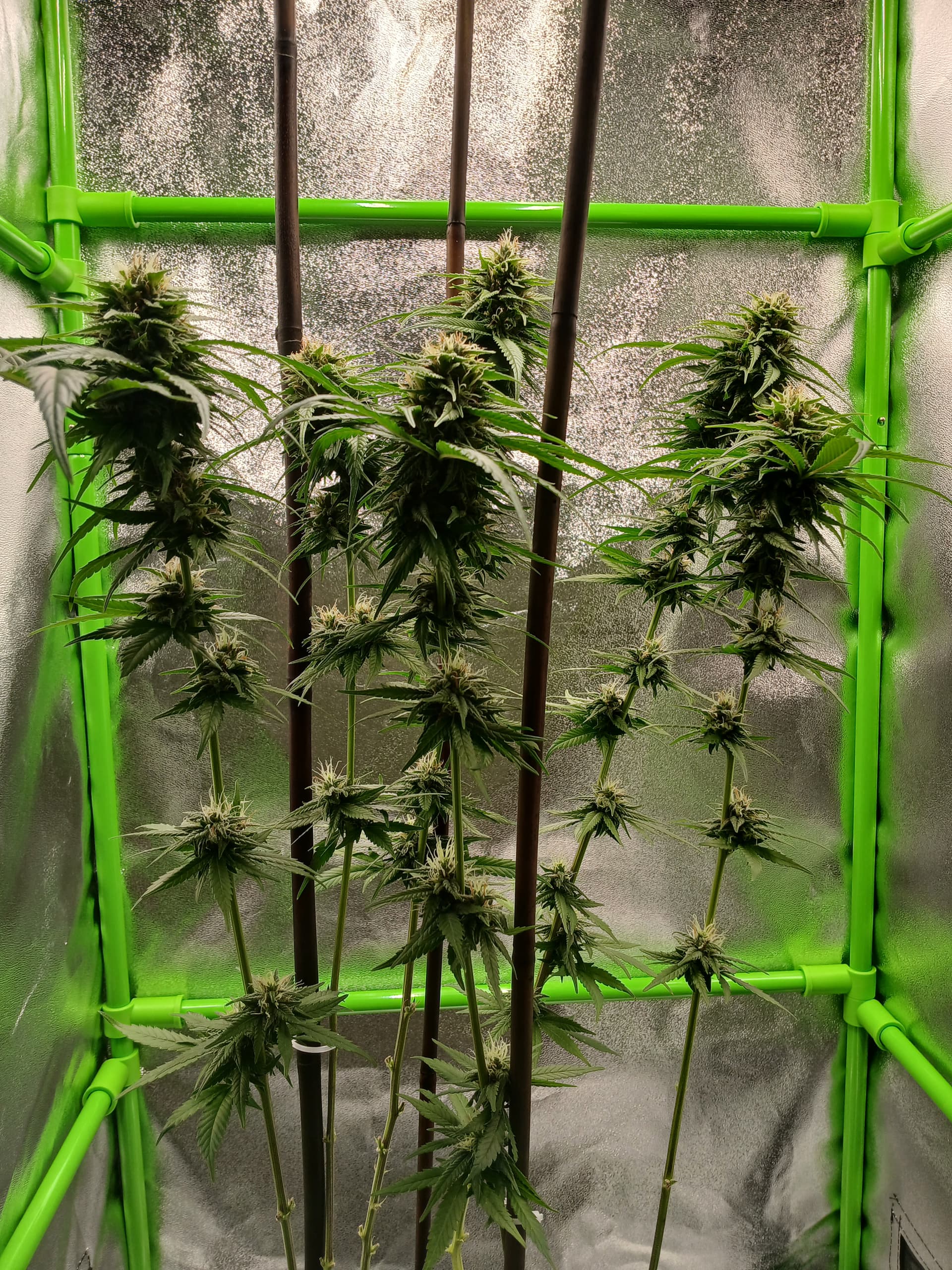 Ich werde jetzt eifach nur noch auf eine Bestimmte Zahl von Triebe gehen in dem ich einfach Toppe und mit den Seitentrieben arbeite. Werde auch nicht mehr flach legen mal sehen wie das so wird.