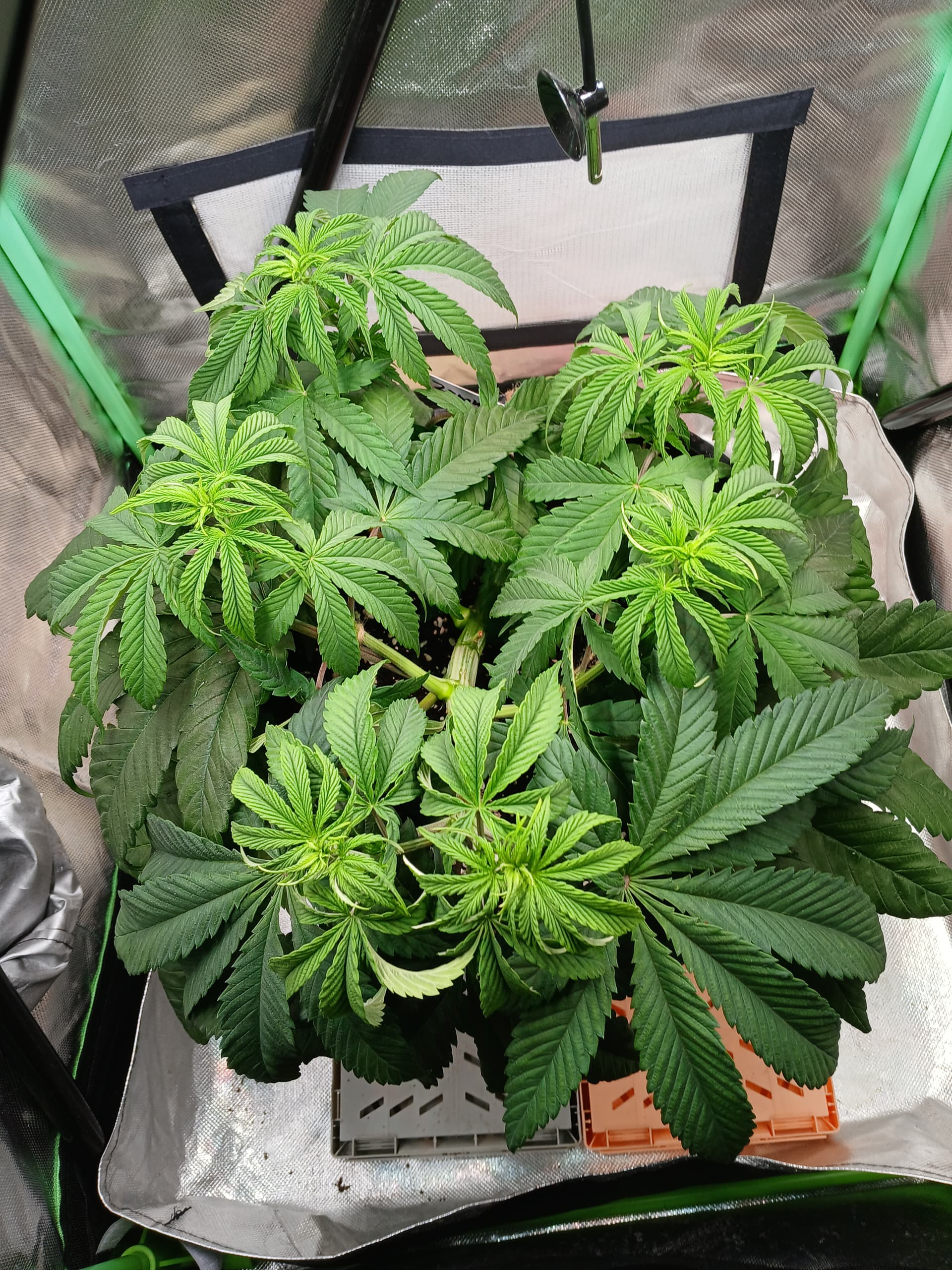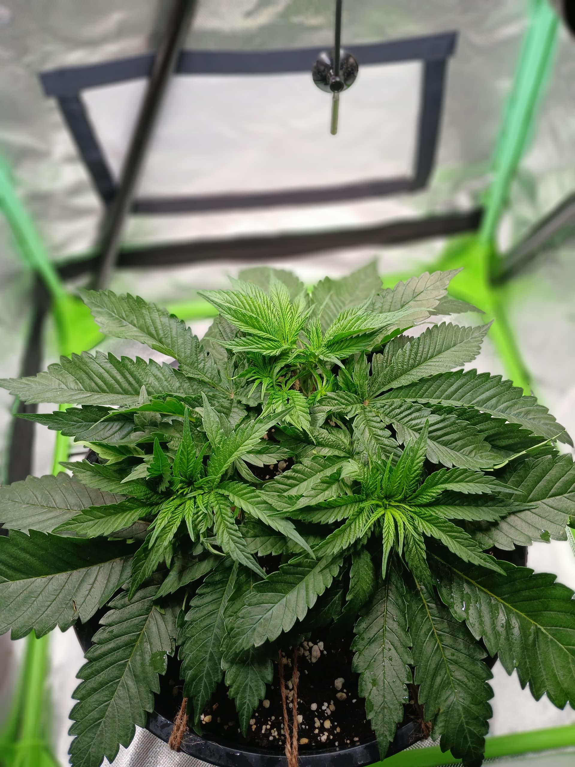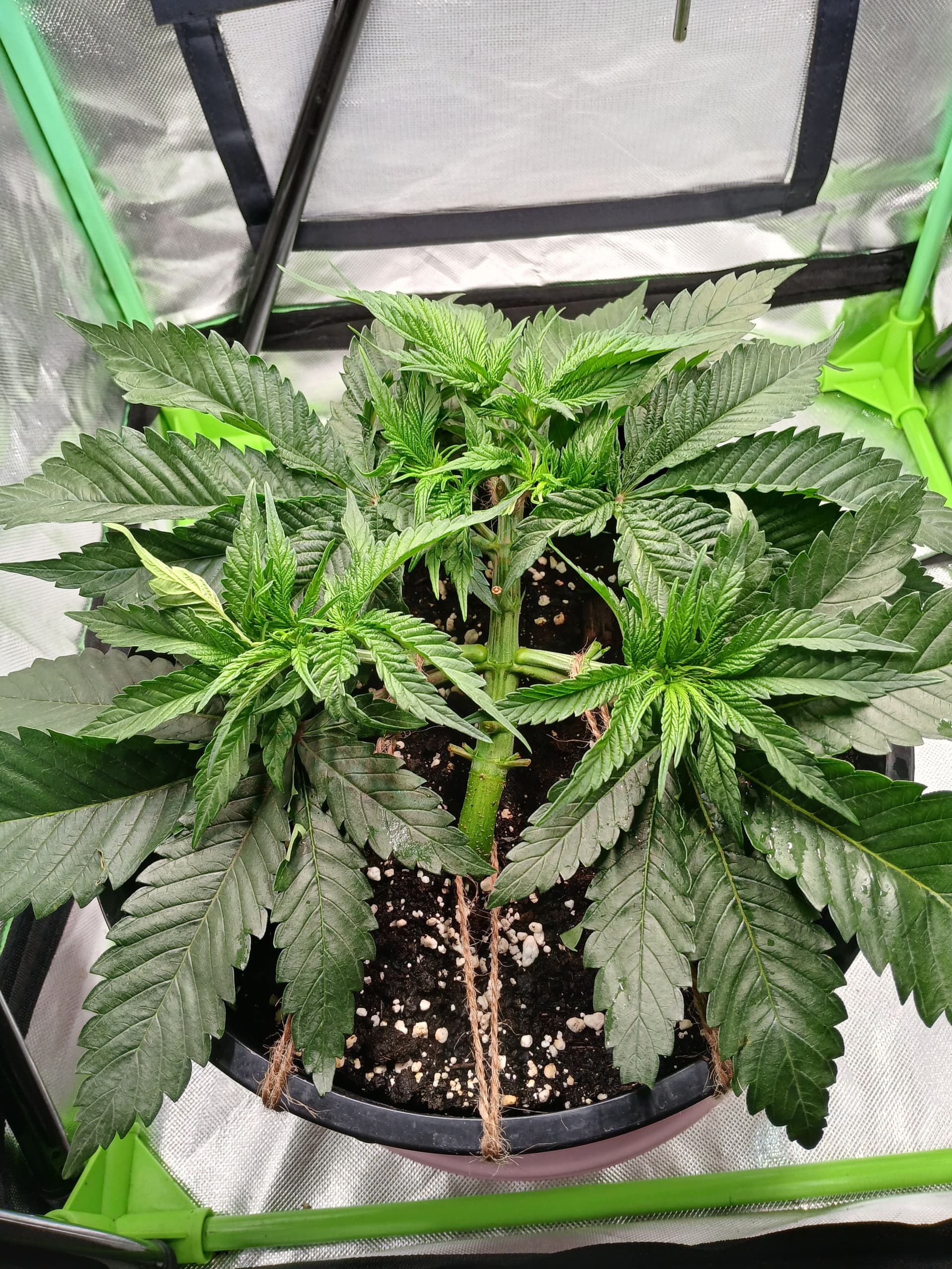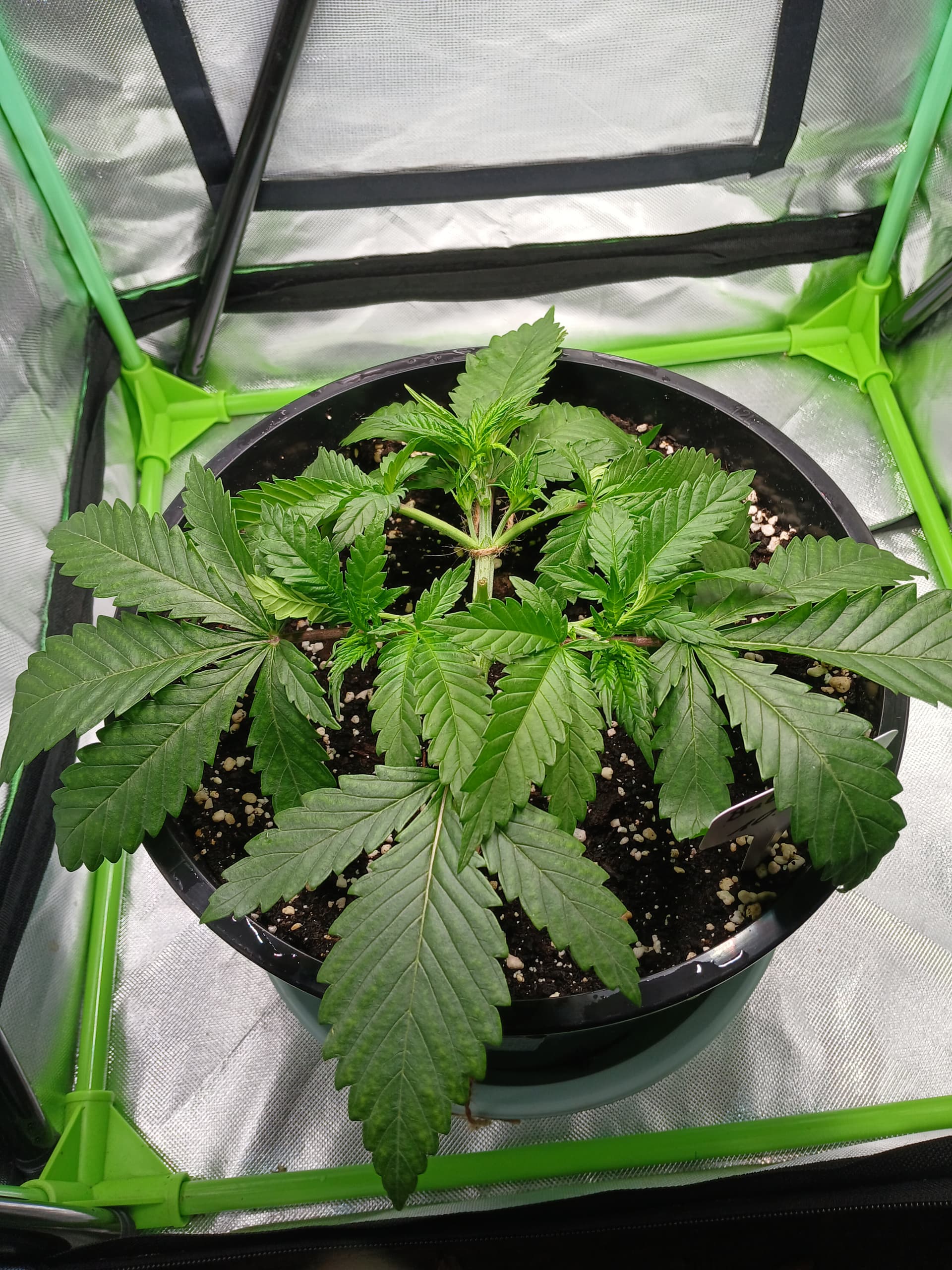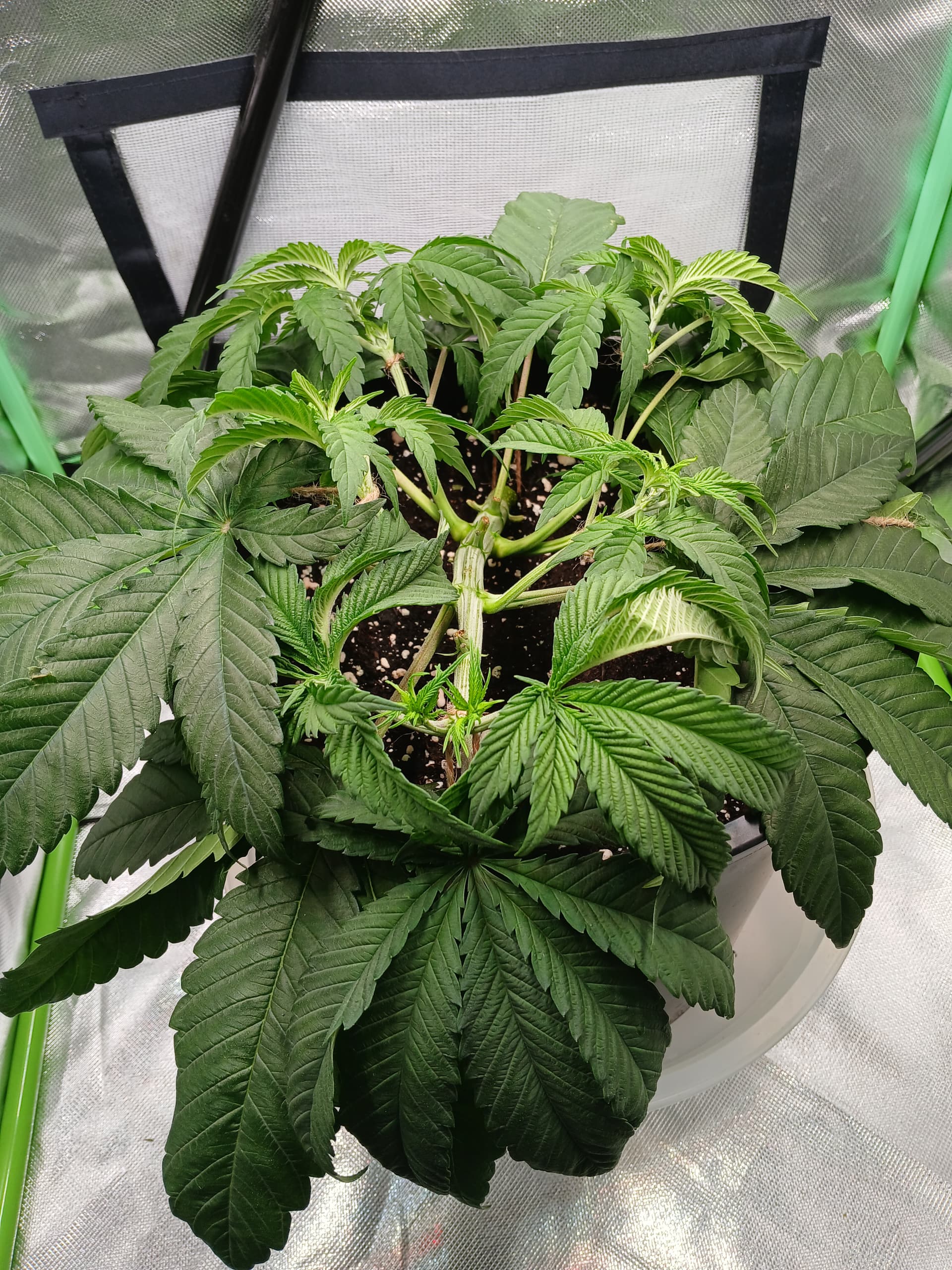 Dann hoffe ich das die Nachzüglerin auch am Haupttrieb toppen kann. Und so dann mit Seitentriebe Training in 3 Wochen endlich auf Blüte gehen kann. Dieser Versatz ist echt grenzwertig für ein Homogenes Wuchsbild.