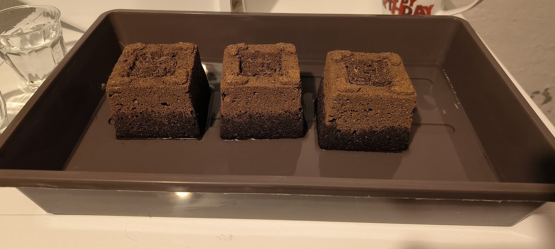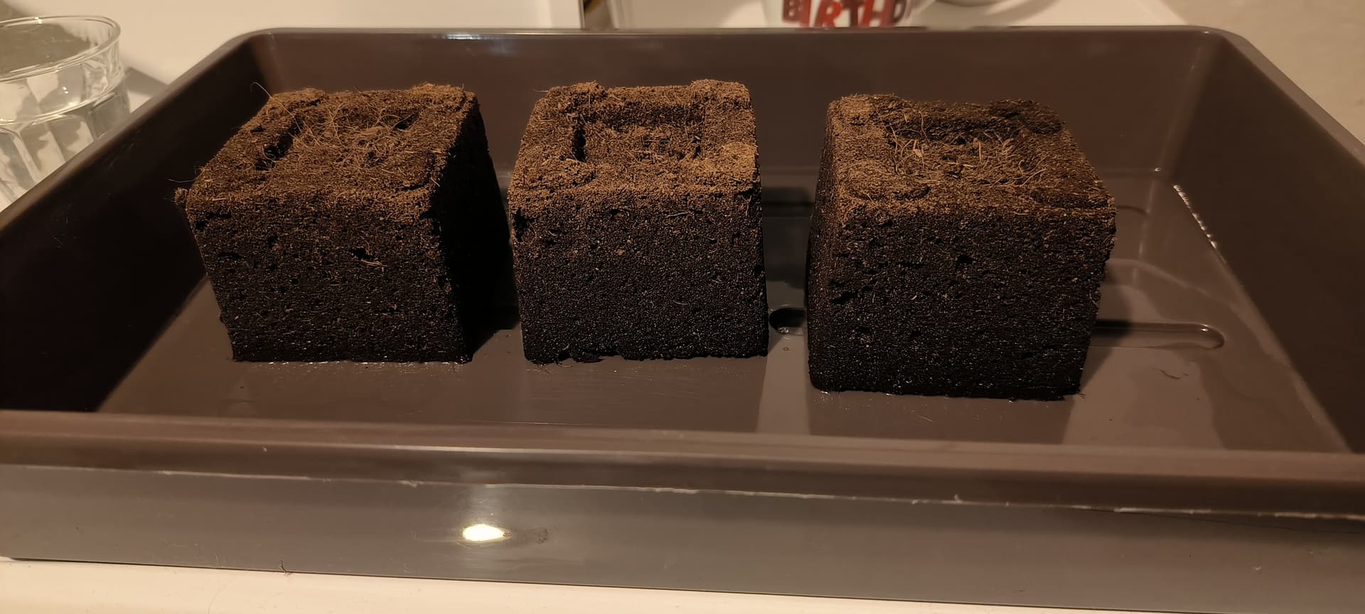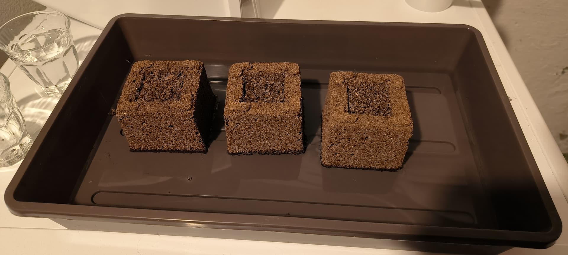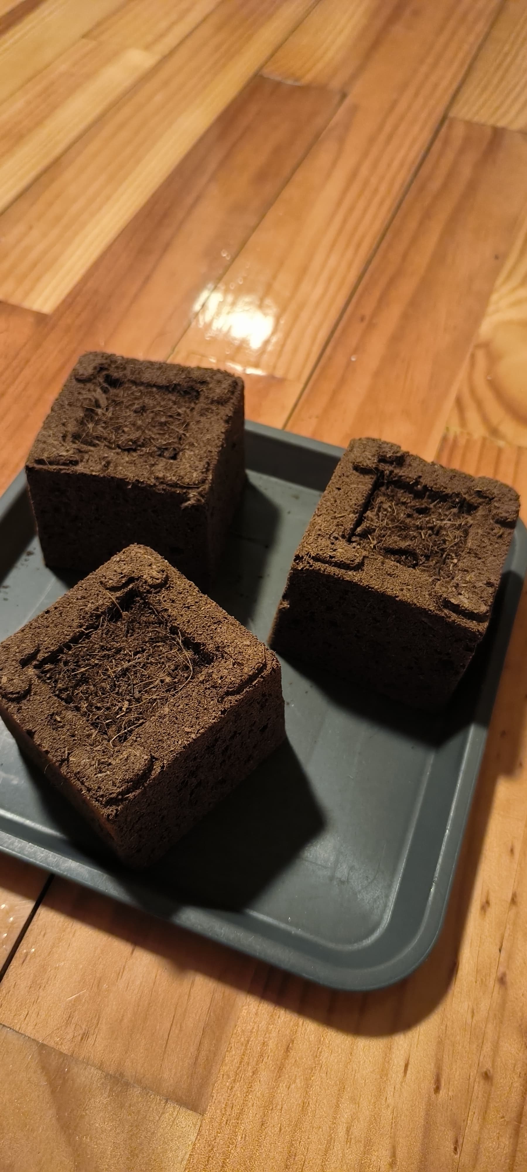 Die Eazy Blocks wurden vorher in eine Schale mit Wasser gestellt damit sie sich vollsaugen konnten und von oben wurde auch ein bisschen was gegossen damit die Erde feucht ist.