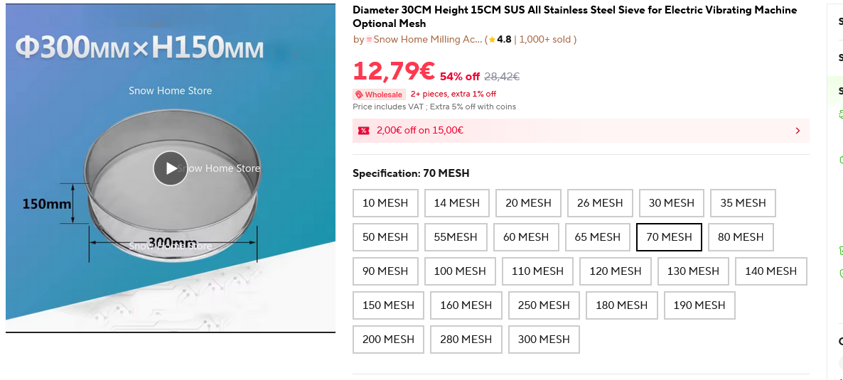 Mein kumpel vom dem ich das ding erworben hab hatte sich schon in china verschiedenen siebe gekauft (~15€) und somit hatte ich ein 70, 90, 120,140 und 160 micron sieb zur verfügung.