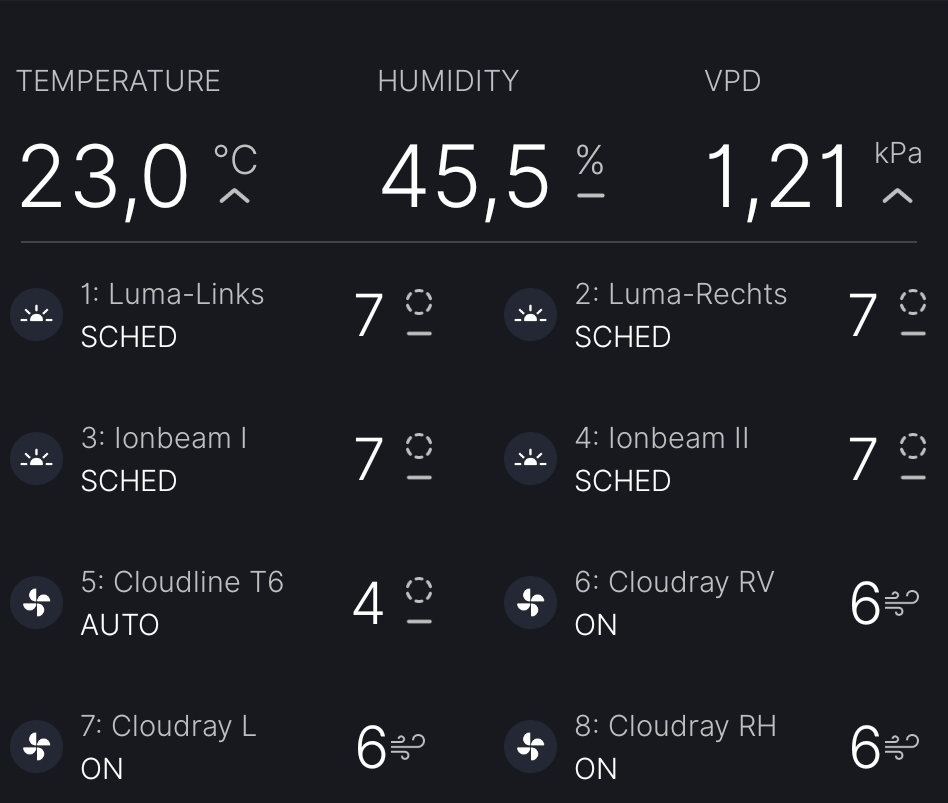 Temperaturen liegen bei Nacht 18-20° und 55% RLF, Tag zwischen 24-28° wenn die beiden Lumateks auf 80% laufen, mit 15Minuten Sonnenaufgang/Sonnenuntergang, dann mal eine Zeitlang laufen und die RLF geht von 55% paar prozent runter.