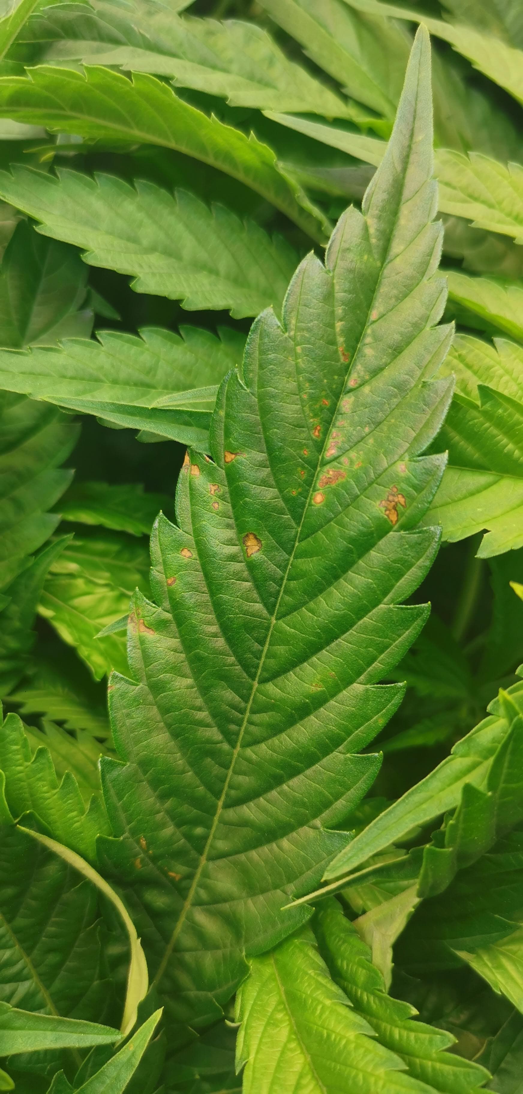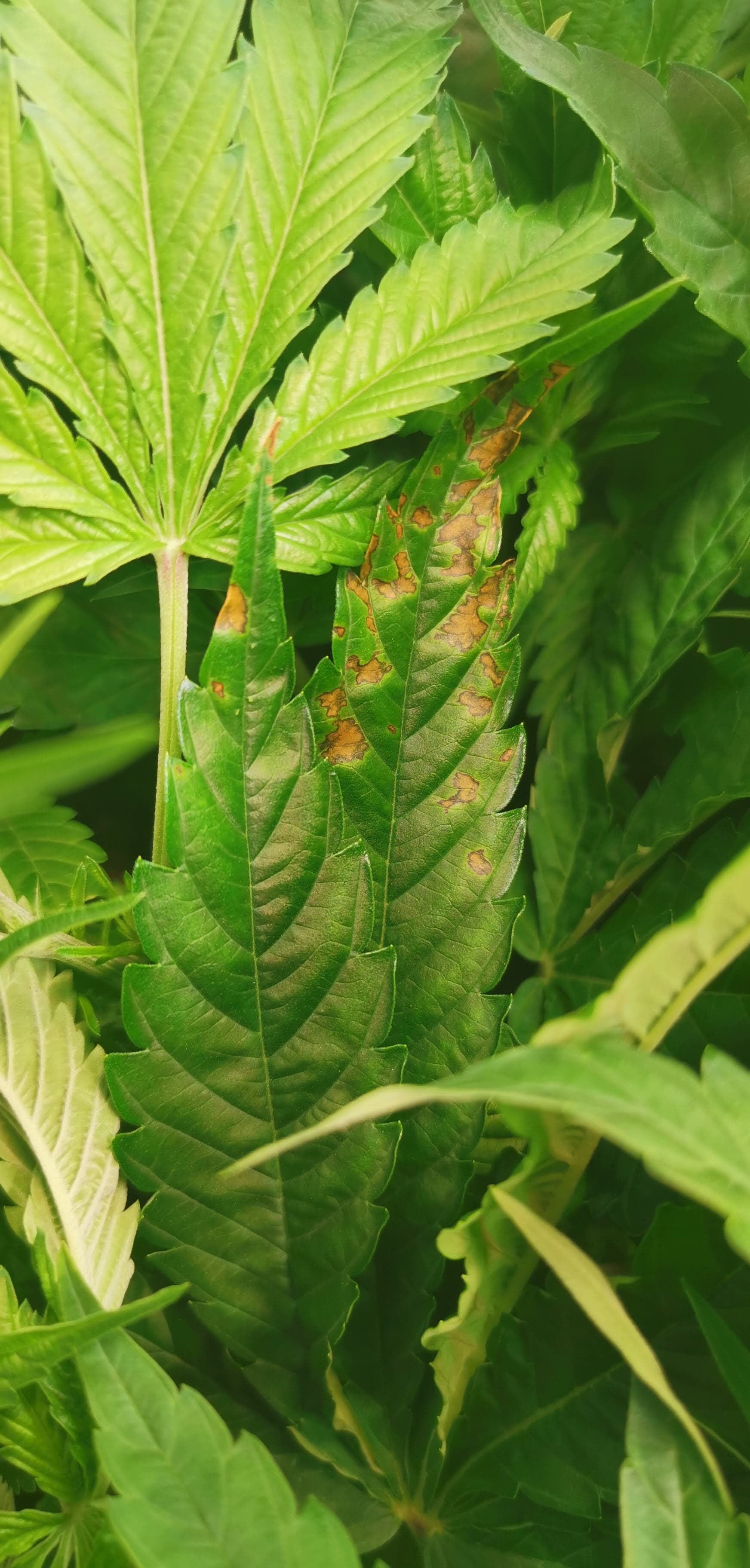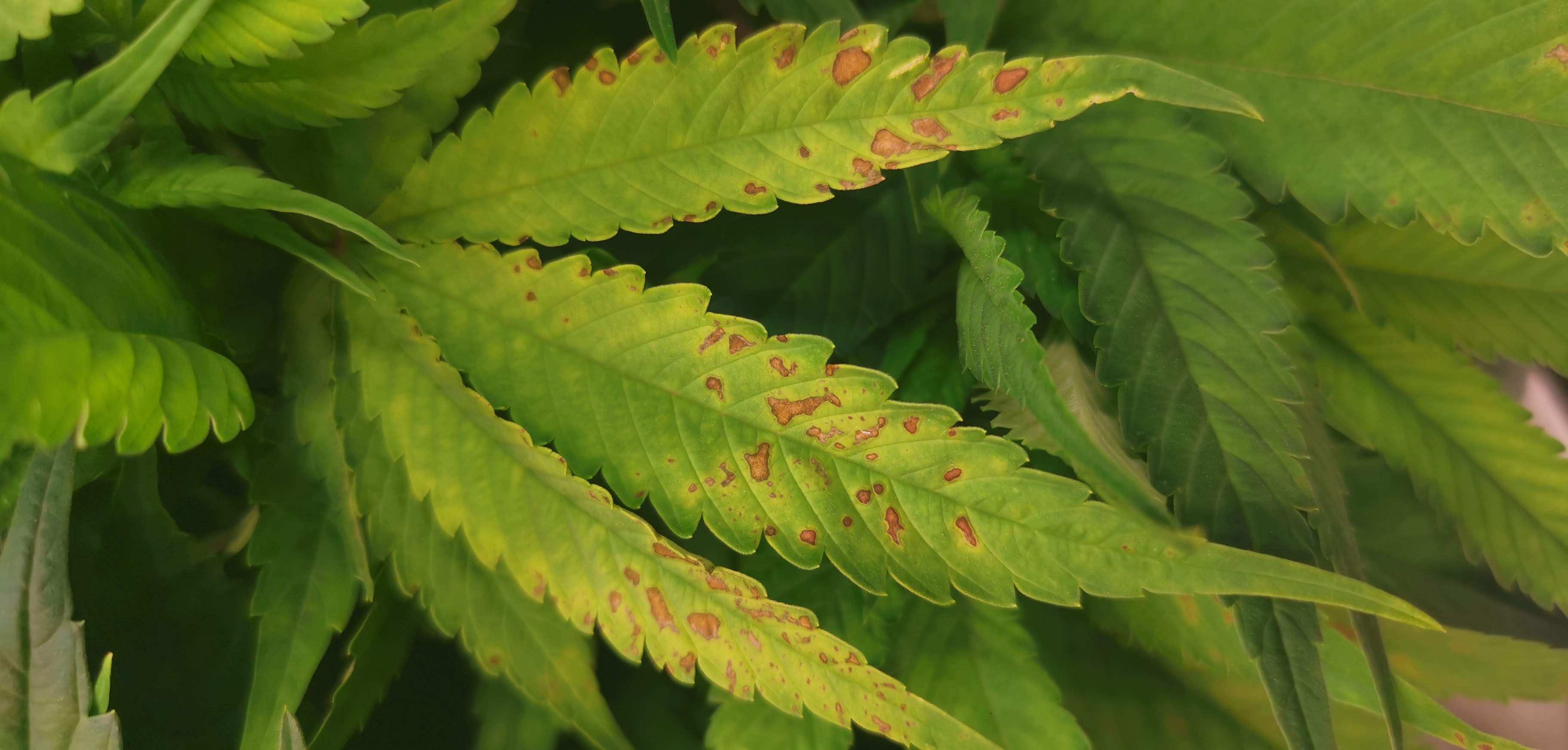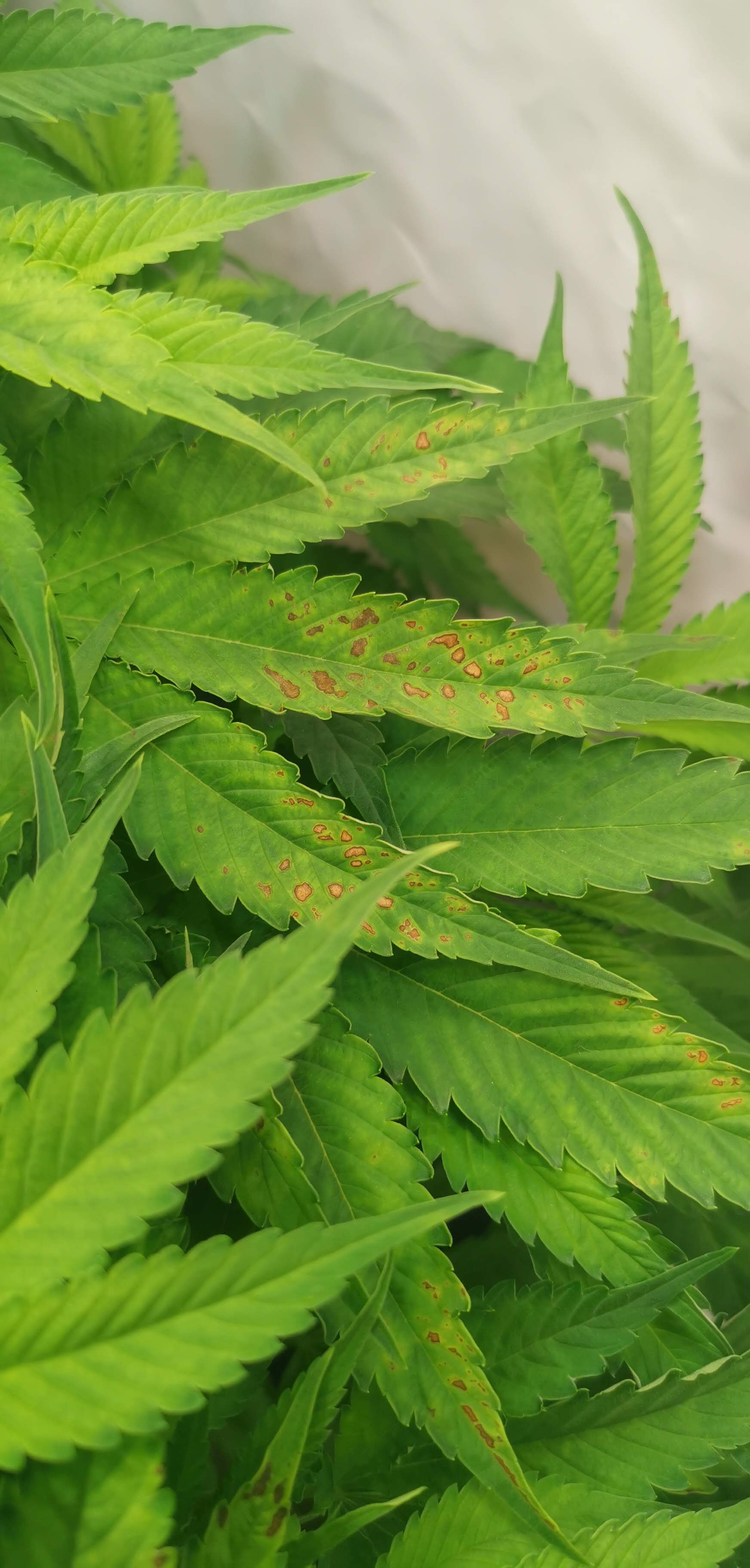 Jetzt (BT3) sind die Flecken jedoch auf allen Pflanzen zu finden, jedoch am meisten auf der Pflanze Nr. 4. Diese Pflanze scheint jetzt auch langsamer zu wachsen als die anderen Pflanzen, obwohl sie im gesamtem Grow immer am schnellsten von allen gewachsen ist. Zudem haben die Verfärbung der Blätter und die rostigen Flecken die letzten Tage stark zugenommen. Hier sind tagesaktuelle Bilder von allen Pflanzen (hauptsächlich Nr. 4):