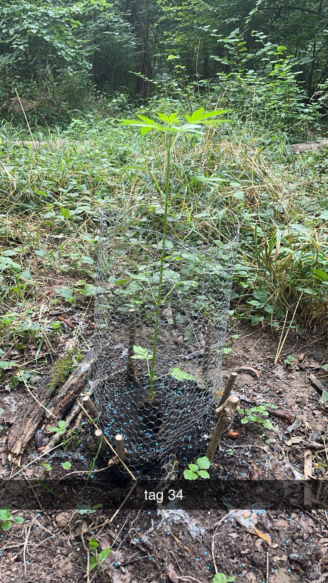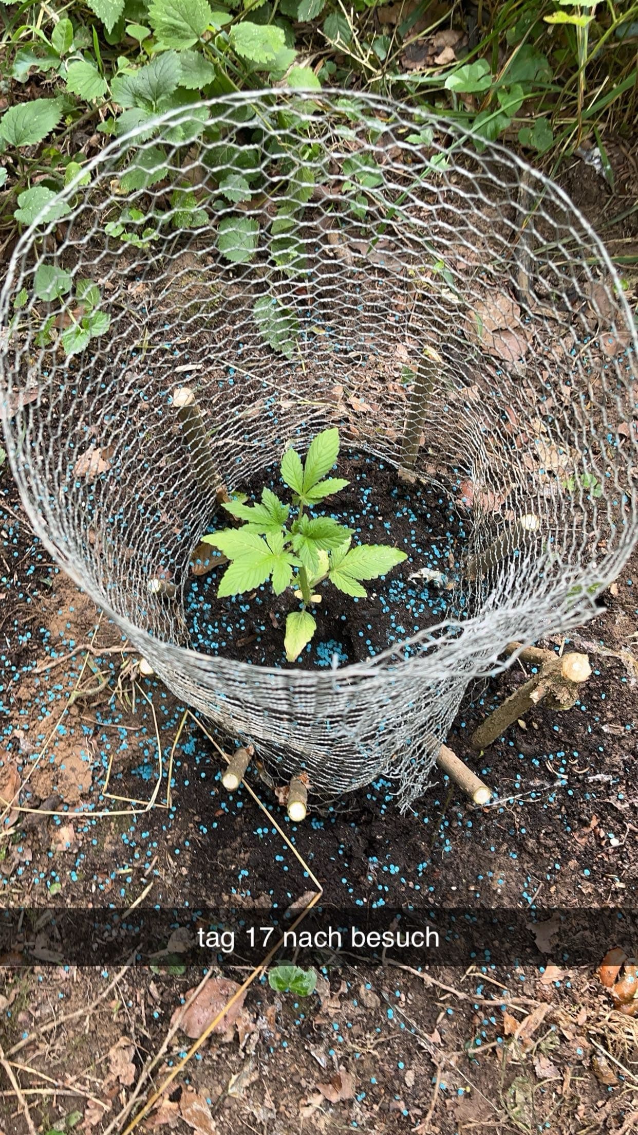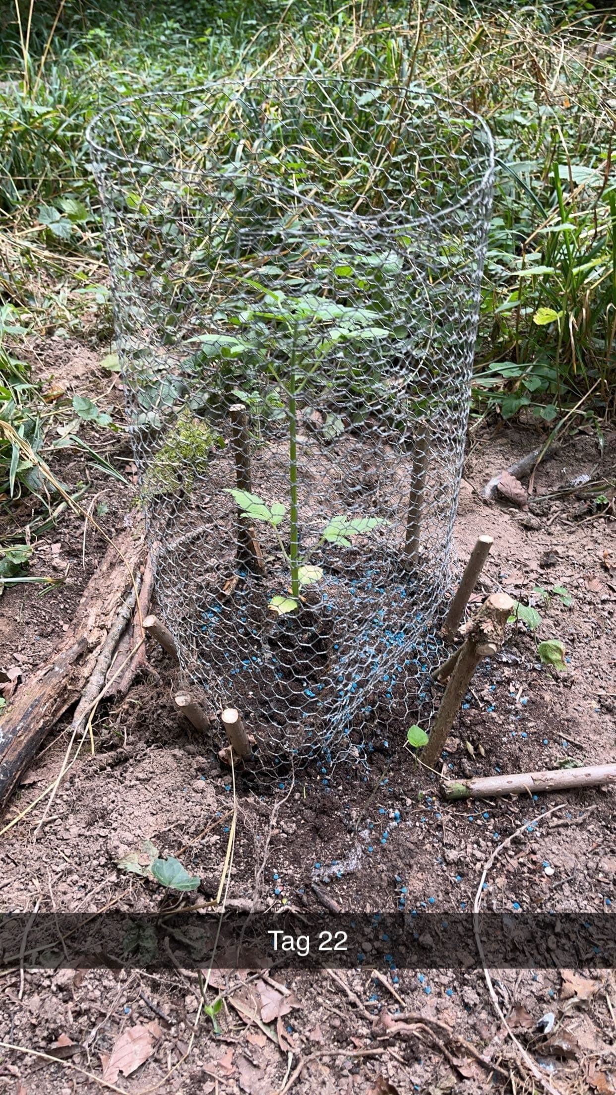 Gestern den Spot besucht über einen neuen Weg, aber gesehen worden, daher zurück zum alten. Das übertrieben viele Schneckenkorn hat geholfen es war ein kreisrunder Friedhof an Schnecken. Hühnerdraht angebracht und mit gezweigten Ästen befestigt. Die Pflanze hat sich gut eingewöhnt und scheint in der Höhe zuzulegen. Dennoch schätze ich gibt es wenig direkte Sonne am Spot. Dünger mit Wasser wurde gegeben und neues Schneckenkorn, welches erstaunlich regenfest ist. Umbedingt Antibrumm für die Zukunft alles voll mit Schnaken.