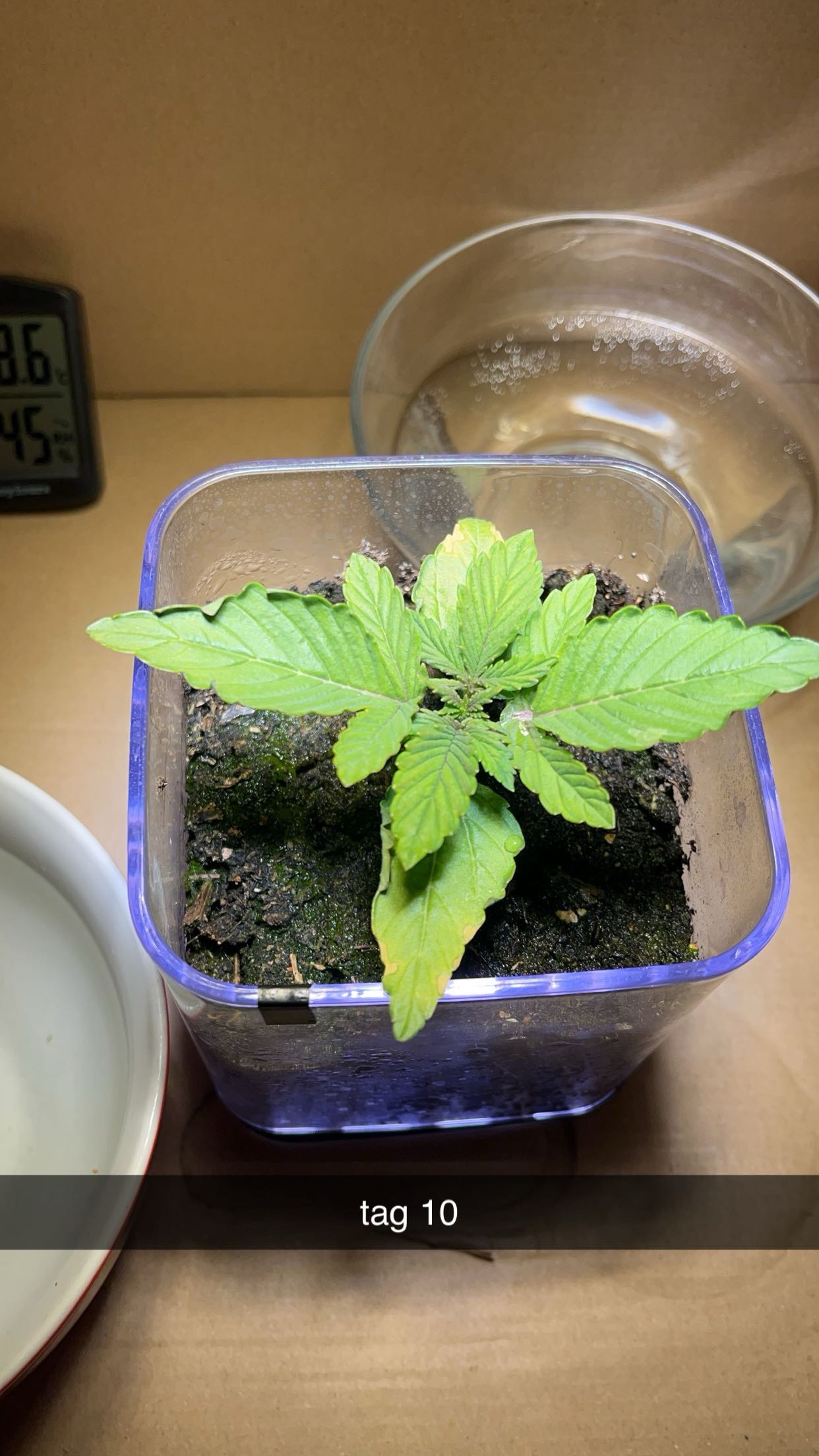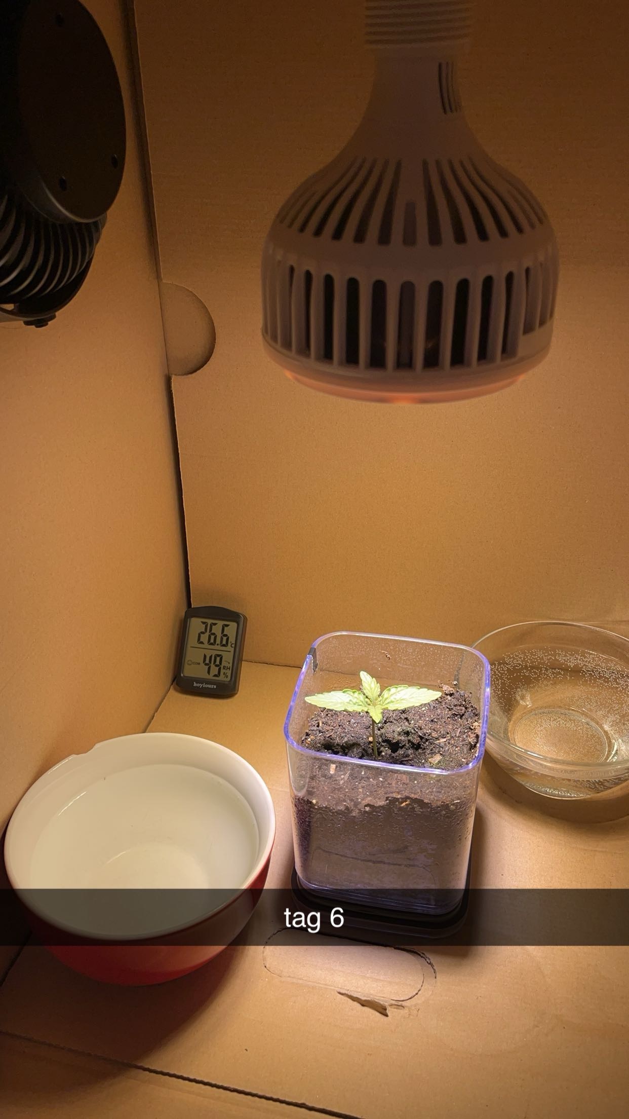 Nur noch die Königin lebt, die Prinzessin war im inneren Matsch. Alles auf eine Karte. Ohne Abluft herrschen 28°C und 50% LF. Die Blätter sind an den Rändern leicht nach oben gebogen, vermutlich Hitzestress. Sonst haben die Blätter eine schöne grüne Farbe. Ohne Keimblätter sind es 4 Blätter und weitere 6 am wachsen. Es wurde eine zweite Wasserschale für eine höhere LF platziert (Es sind 40-50% und es sollten 50-70% sein, eher sehe ich die Temperatur als ein Problem).