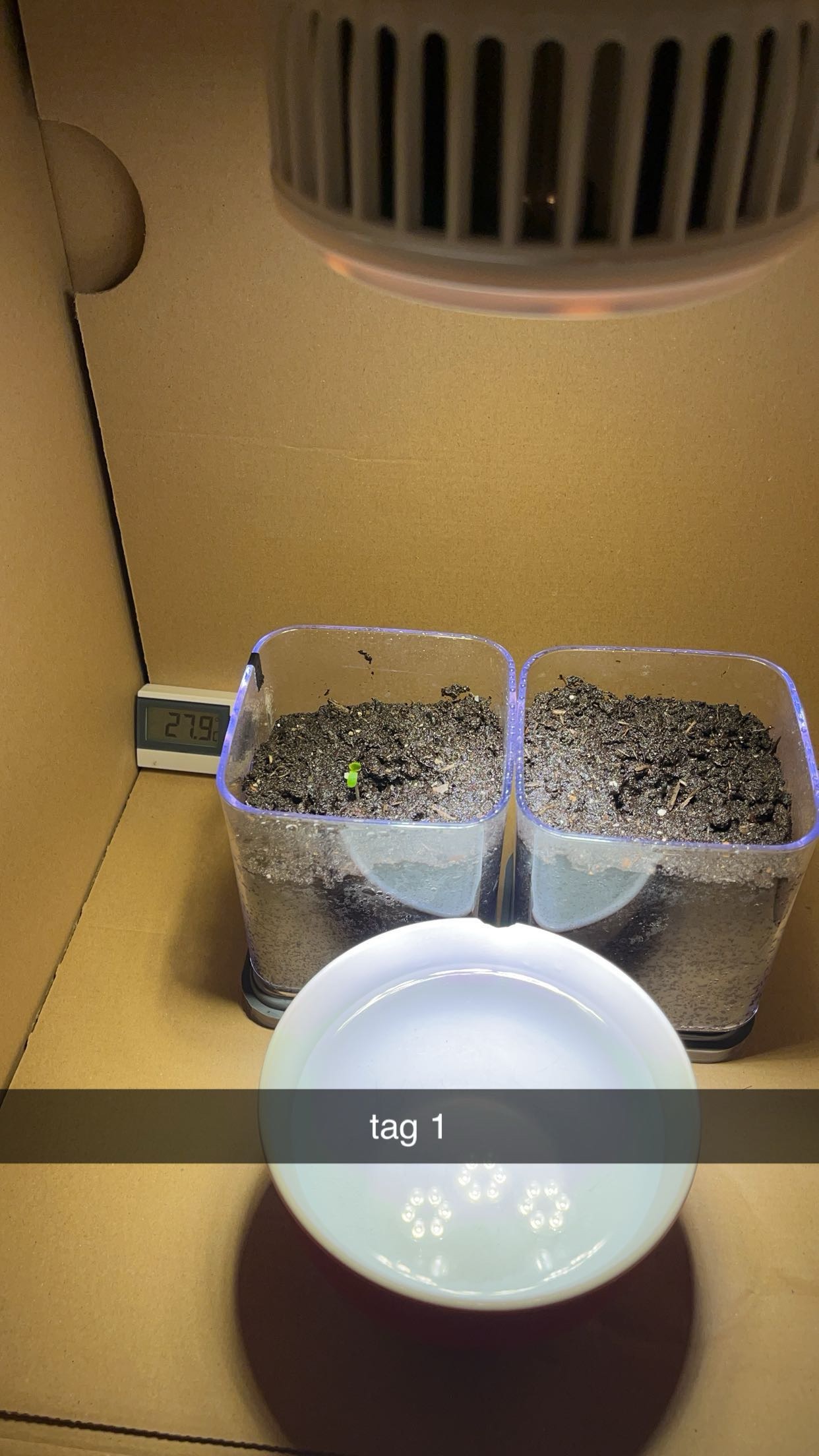28.06. Erste künstliche Sonne trifft auf die Erde. Gegenläufiger Lichtzyklus um die hohen Temperaturen im Growroom auszugleichen (29°C). Bedenken das die Samen nicht keimen oder dass die Erde austrocknet. Licht zu stark, Box zu klein, Lüfter zu laut.