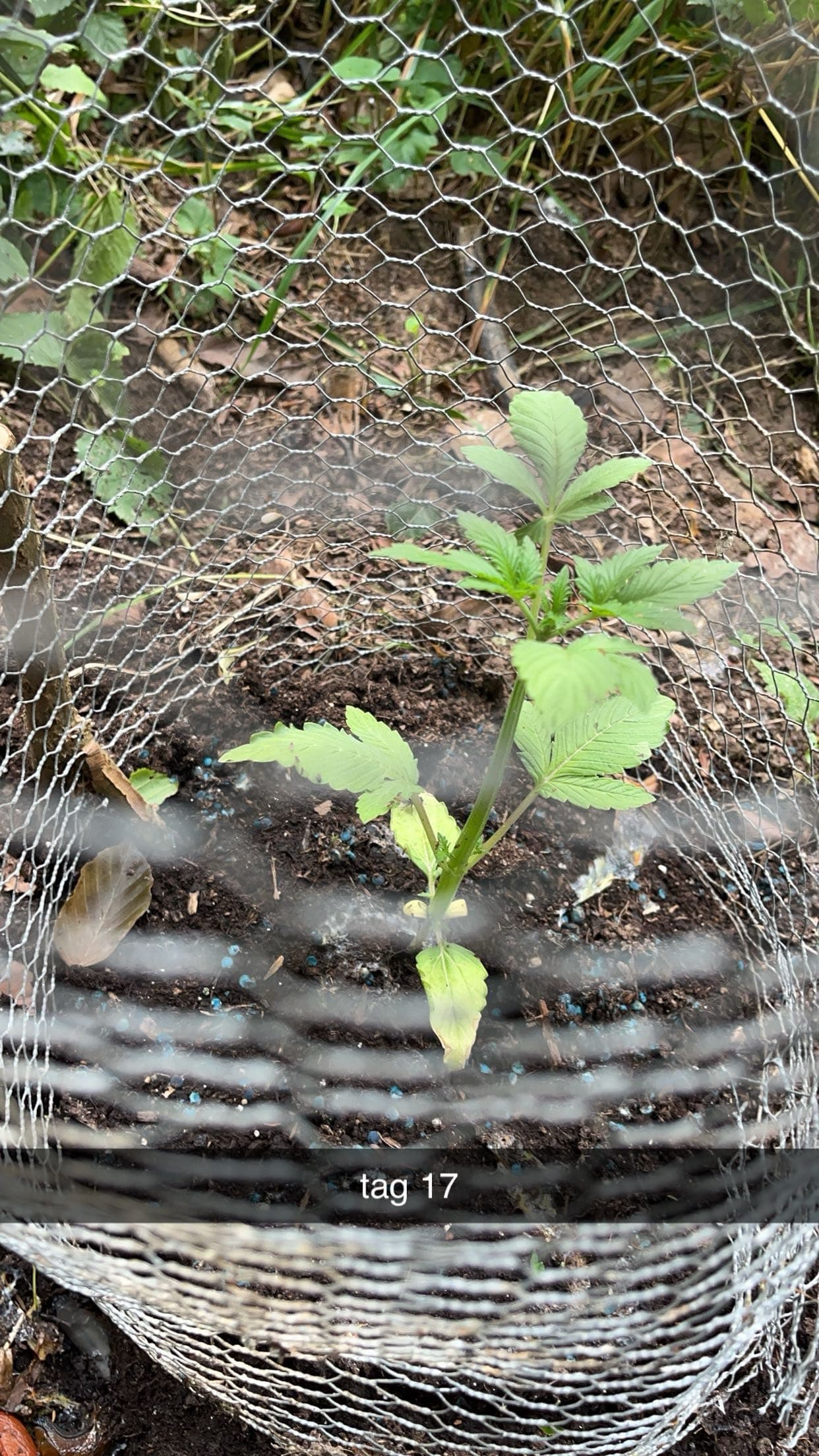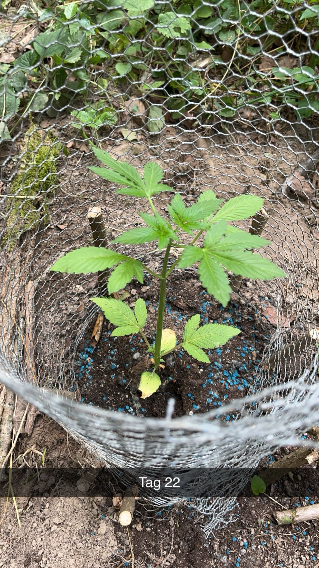 Gestern den Spot zum dritten Mal besucht. Es sah so aus als ob ein Tier den Hühnerdraht seitlich angegraben hatte. Das Tier hat es aber nicht ins Innere geschafft. Den Draht gerichtet das Loch gefüllt und mit weiteren Stöcken verstärkt. Das Antibrumm hat Wunder geholfen. Das Schneckenkorn aufgefrischt nachdem es deutlich weniger wurde., Es hält schätzungsweise 5 Tage. Ich denke der Spot erhält nicht viel direktes Sonnenlicht. Sie ist deutlich gewachsen von 10cm auf 25cm dadurch hat sie recht kark gewirkt, obwohl die Blattanzahl mehr geworden ist. Nächstes Mal die Pflanze genauer betrachten und nach Schädlingen schauen. Bisher läuft es zufriedenstellend.
