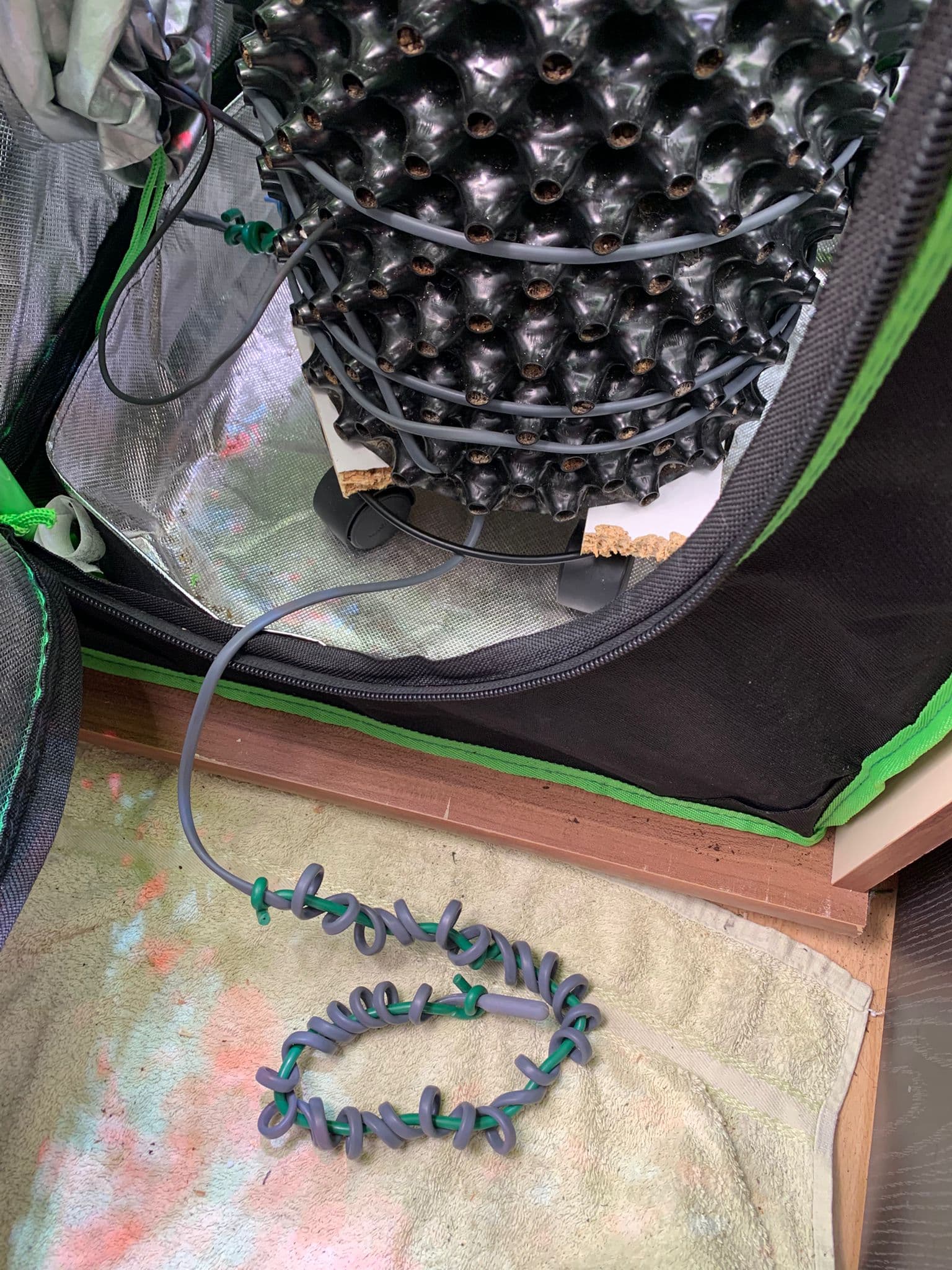 Um den Stress der Pflanze zu minimieren wurde ein Thermostat und ein Heizkabel verwendet. Ein Thermostat misst die Erdtemperatur mit einer Sonde, welche ich durch ein Loch des Airpots auf mittlerer Topf-Höhe positioniert habe. Wenn die Erdtemperatur unter 18 °C fällt aktiviert das Thermostat ein Heizkabel (eigl. für Terrarien gedacht). Das Heizkabel selbst ist ein paar Windungen um den Topf gelegt. Der Rest des Heizkabels habe ich in einer Art „Heizschleife“ unter den leicht erhöhten Topf gelegt. So kann die Wärme von unten nach oben in die Erde steigen.