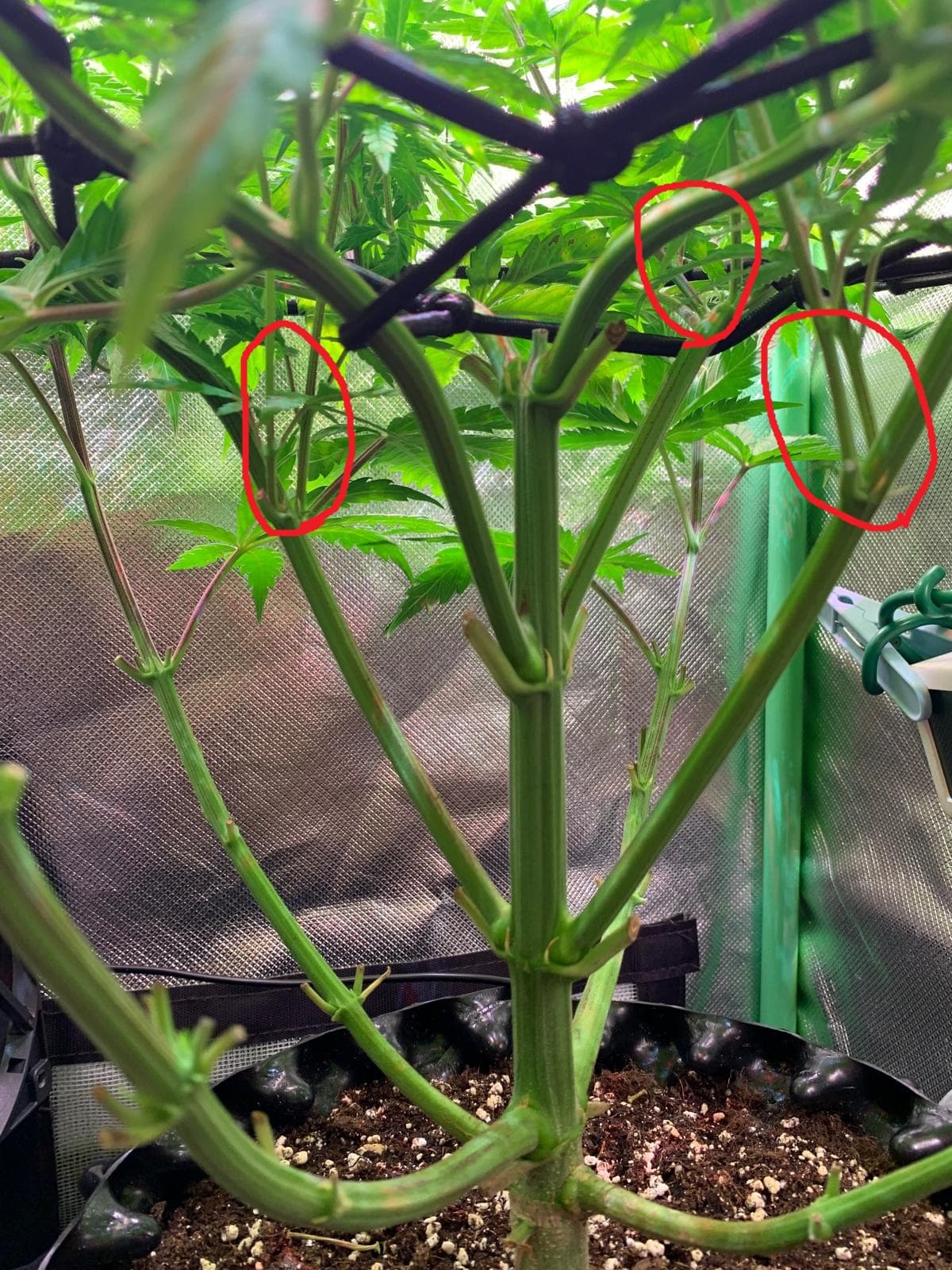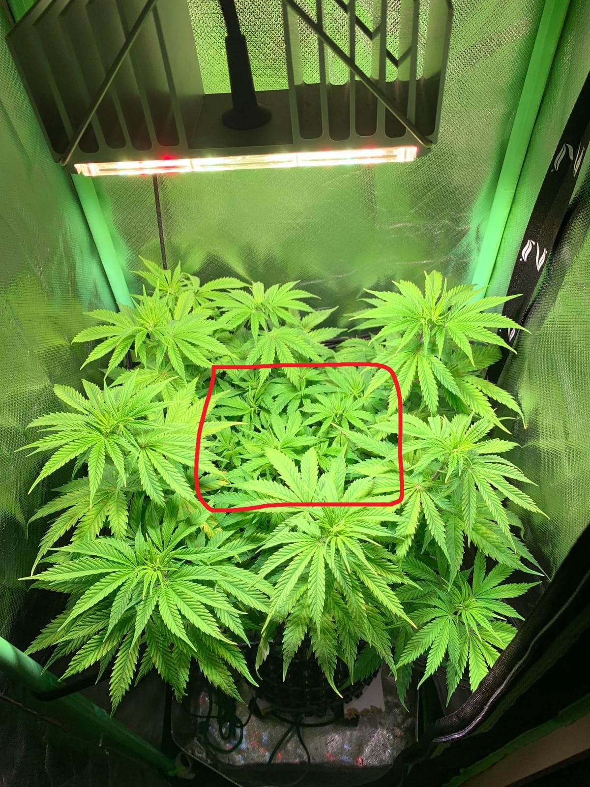 Die Queen ist jetzt schon sehr buschig und kommt so langsam in den Strech der Blüte. Die Hauptbuds befinden sich jetzt alle außerhalb, wodurch in der Mitte viele kleine Triebe das Licht gesucht haben (rot markiert). Eigentlich füllen sie die Lücke an der Stelle gut aus und bekommen hervorragend gut Licht und entwickelt sich auch gut.