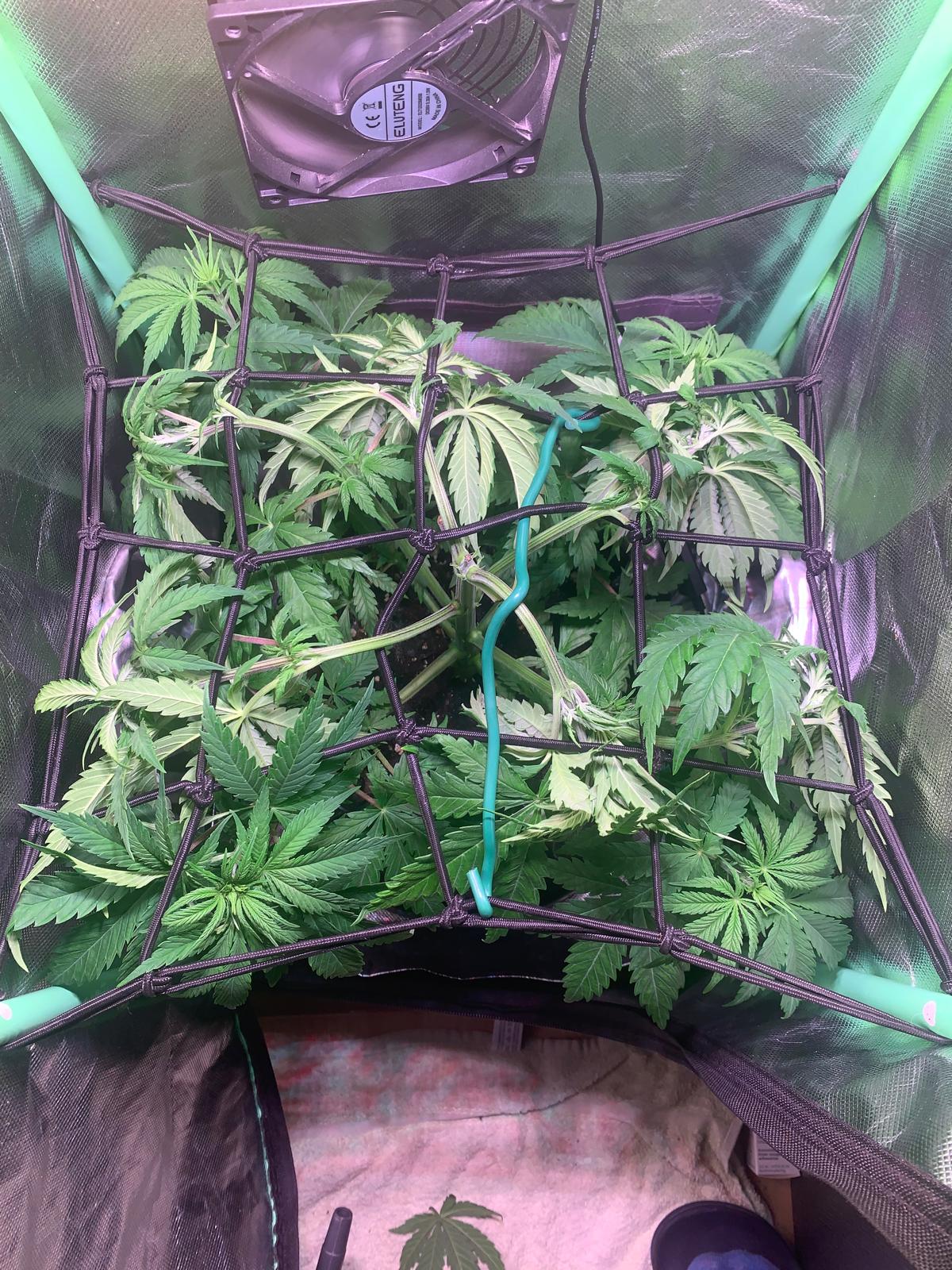 Die Queen wurde ins Scrog-Netz geflechtet um alle Buds später auf eine Höhe zu bringen. Damit versuche ich außerdem maximalen Ertrag auf dem kleinem Raum (40x40 cm) zu erziehlen.