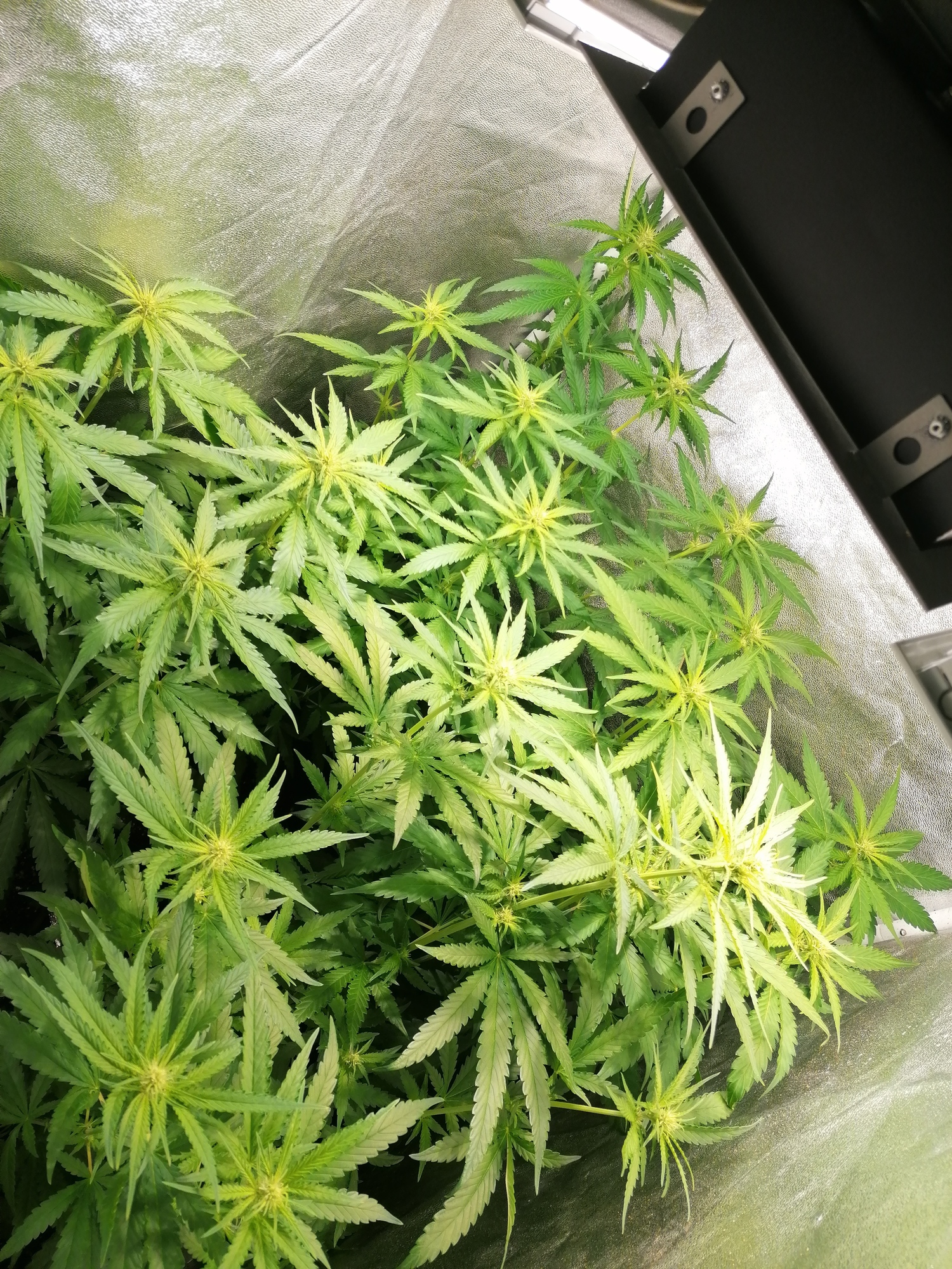 Bemerkungen zum Grow: die Strain scheint sehr temperaturfest zu sein, ist im Gegenzug aber etwas empfindlich, was Dünger angeht. Topping steckt sie gut weg, man sollte es aber bei einem Mal belassen - auch bei längerer Vegi wachsen die Pflanzen dann nur unnötig in die Höhe, bleiben aber relativ dünn. Auch in Sachen Wasser ist die Strain etwas zickig: gießt man zu häufig, bilden sich sofort Adlerkrallen, und wartet man nur einen Tag zu lang, bleibt kein einziges Blatt schlaff hängen, sondern die fallen einfach aus, ohne einem direkt anzuzeigen, dass es am Wasser gelegen haben muss. Ertrag scheint auch ganz nett zu sein, ich denke da dürften wir wieder bei weit über 100g liegen, was für mich okay ist (wenn ich mit Bildern meines ersten Grows vergleiche).