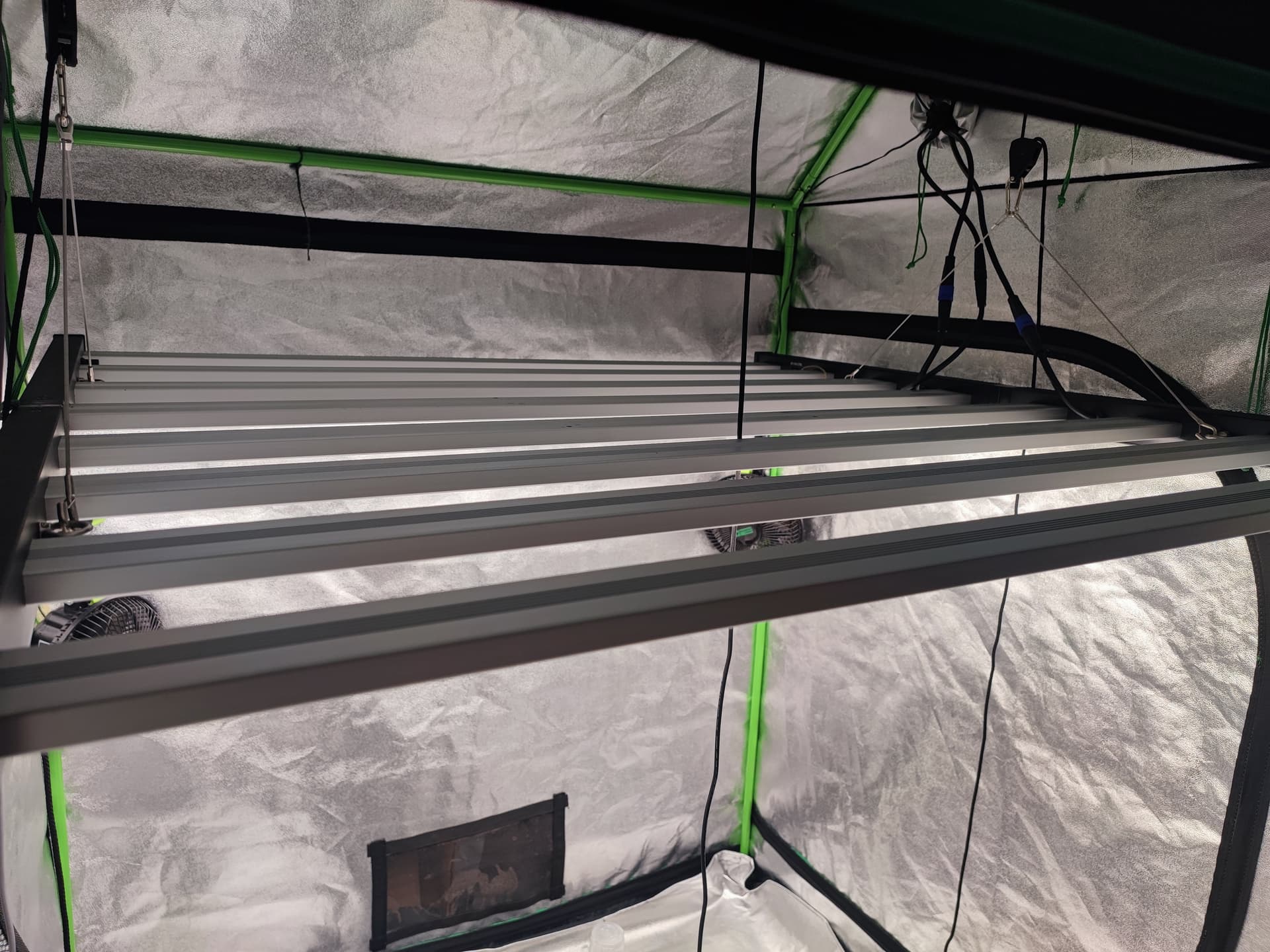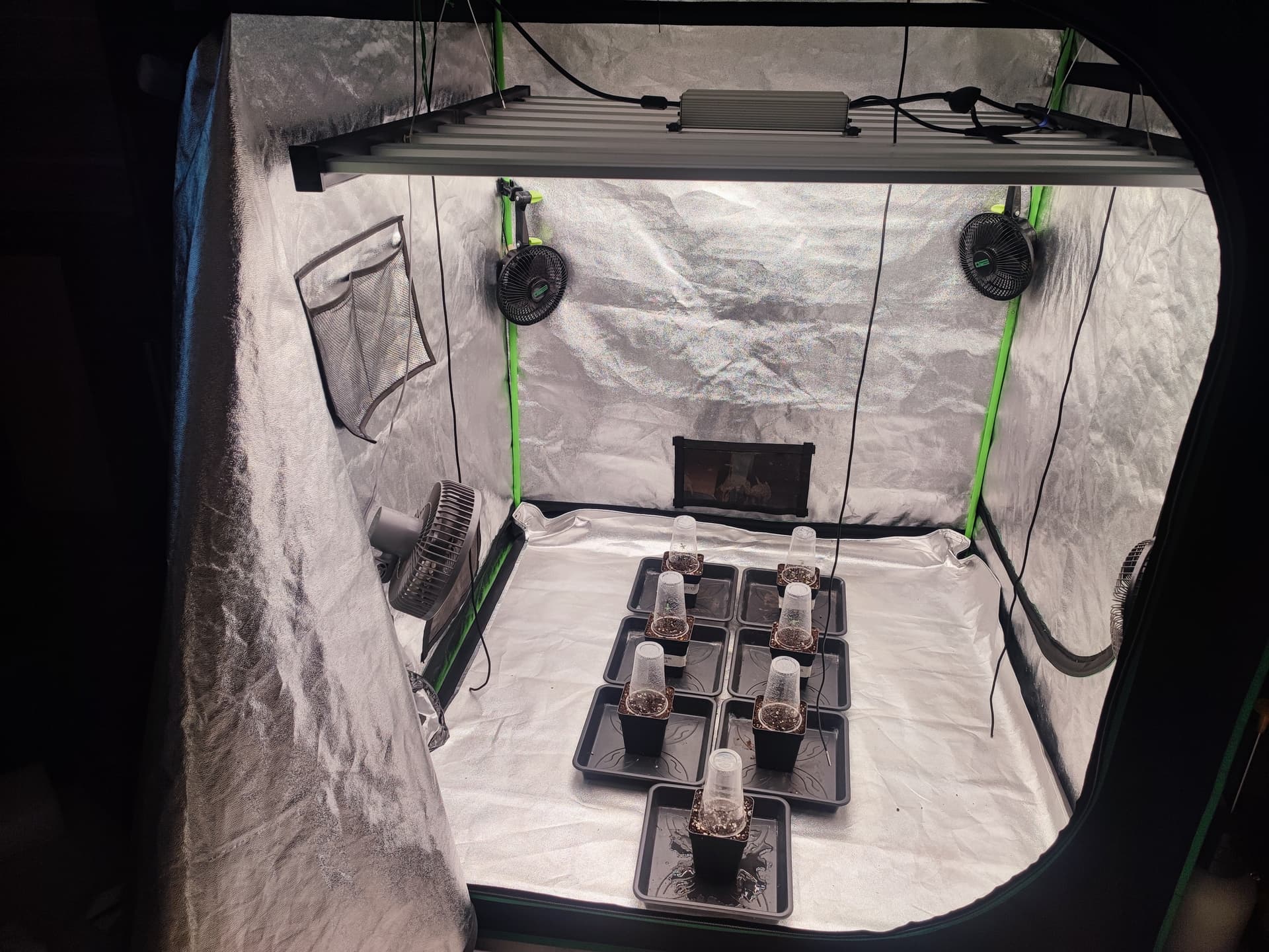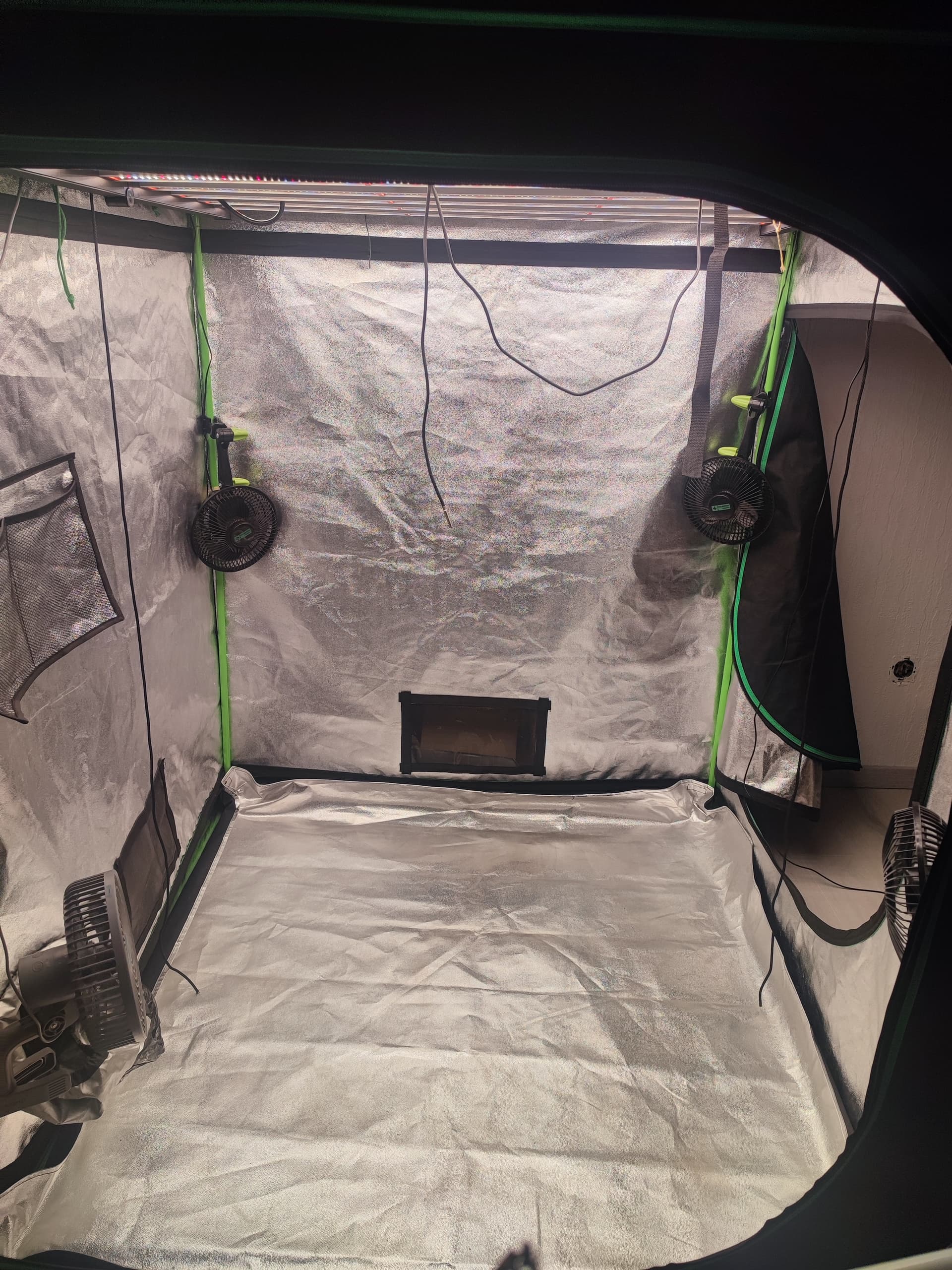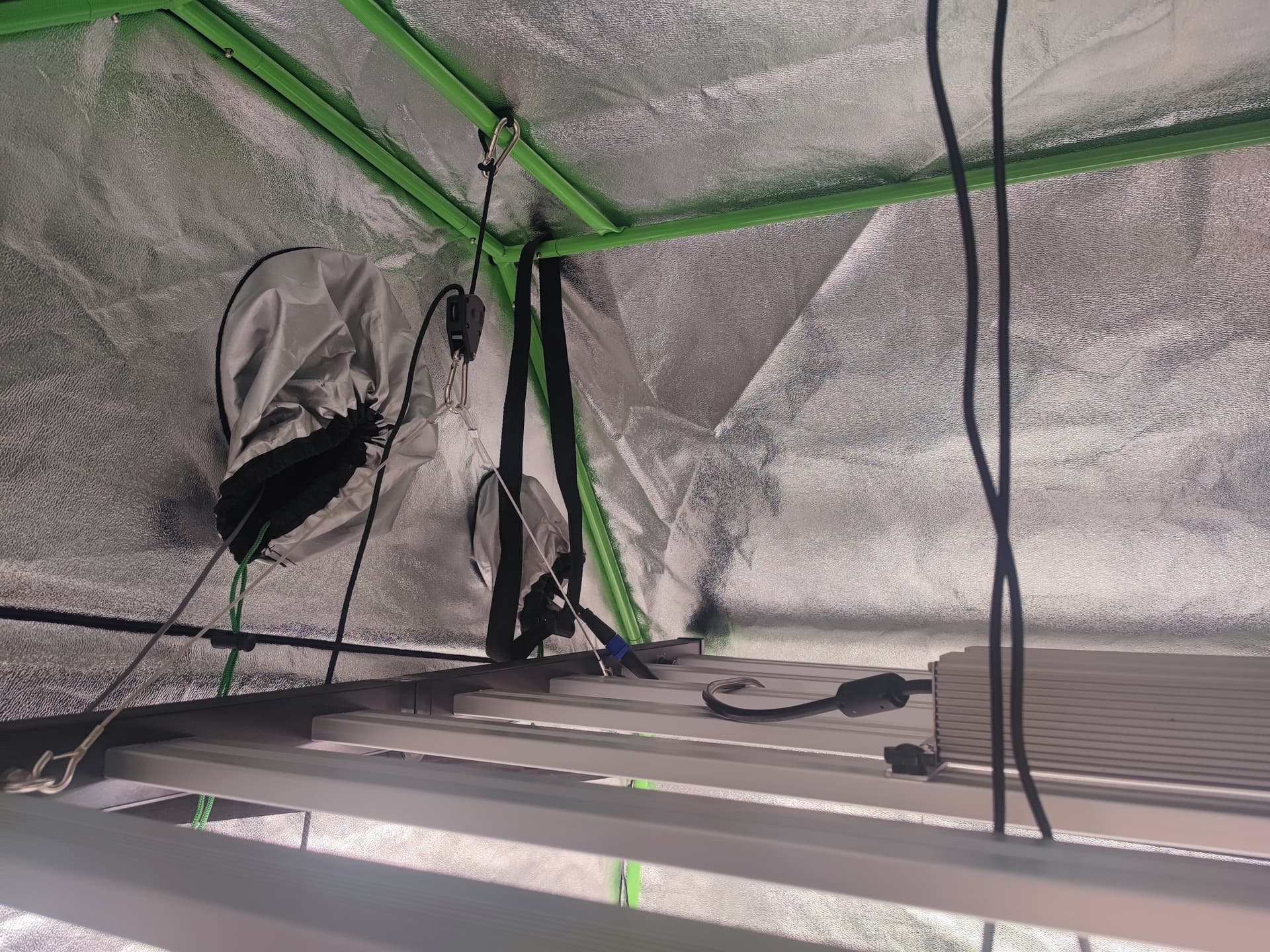 Location: Indoor Growbox*: 120120180 Dachschräge Beleuchtung: PHLIZON FD6000 640 W Vollspektrum-Daisy-Chain-dimmbares LED-Wachstumslicht mit Samsung 281B Belüftung: MarsHydro inline smartfresh 150mm @ 402 cfm/ 690m³/h inkl App-Steuerung mit hygrometer und Temperatur sensor. Umluft: 3 x ghp 5w Clip-Ventilator und