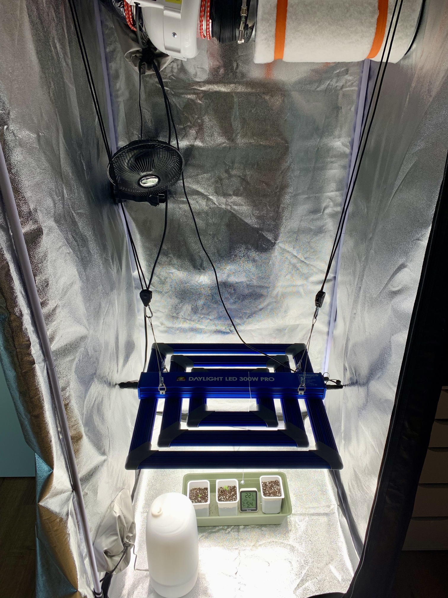 Der Grow findet in einem 60x60x160 Zelt statt. Beleuchtet wird mit einer SANlight Evo 3-60 die bei 40cm Abstand und 100% ca. 900-1.000 PPFDe liefert (Quelle: https://www.sanlight.com/news/par-test-und-ppfd-plots-der-sanlight-evo-serie)