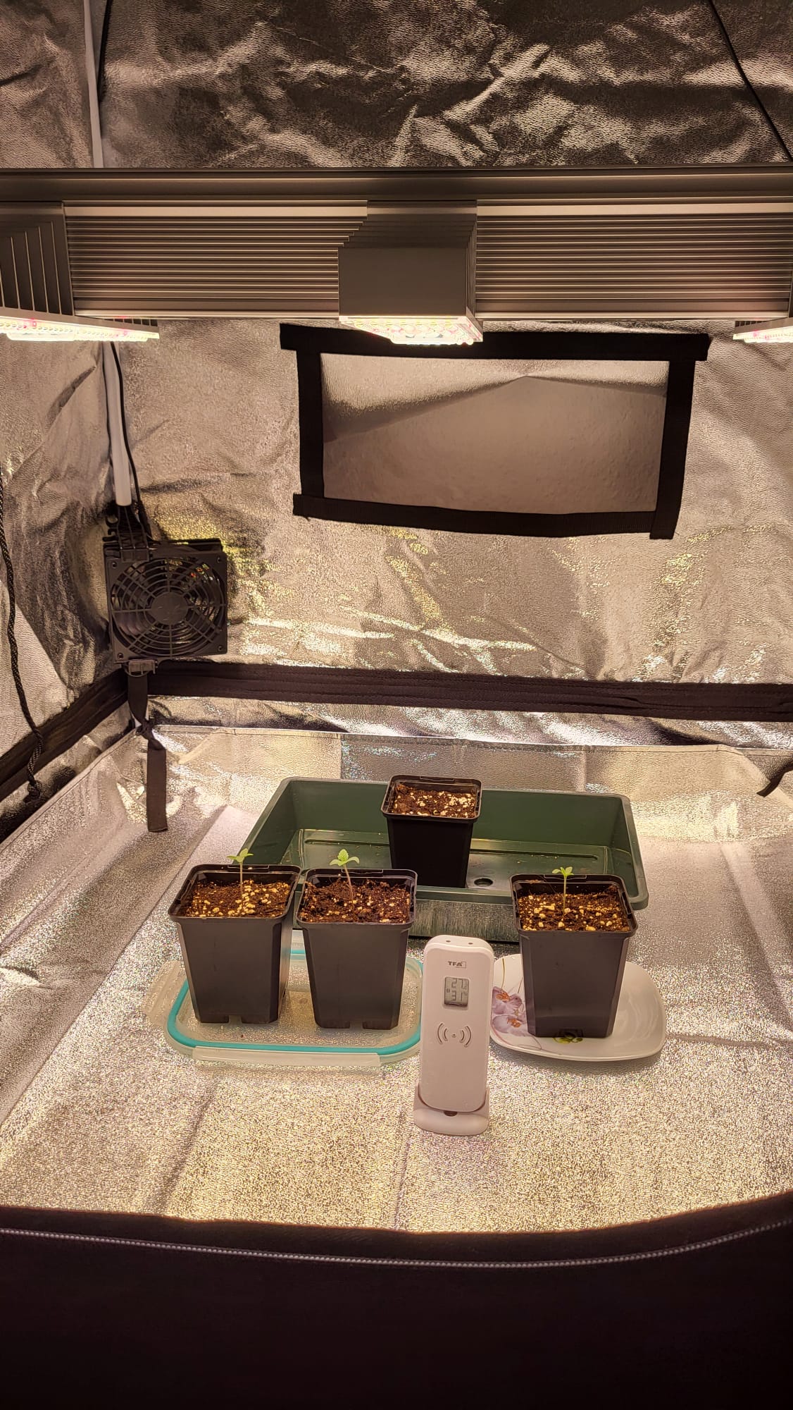 Ich bin noch ziemlich am Anfang meines ersten Grows. Am Freitag haben sich meine ersten 3 Pflanzen gezeigt, gestern die vierte und letzte.