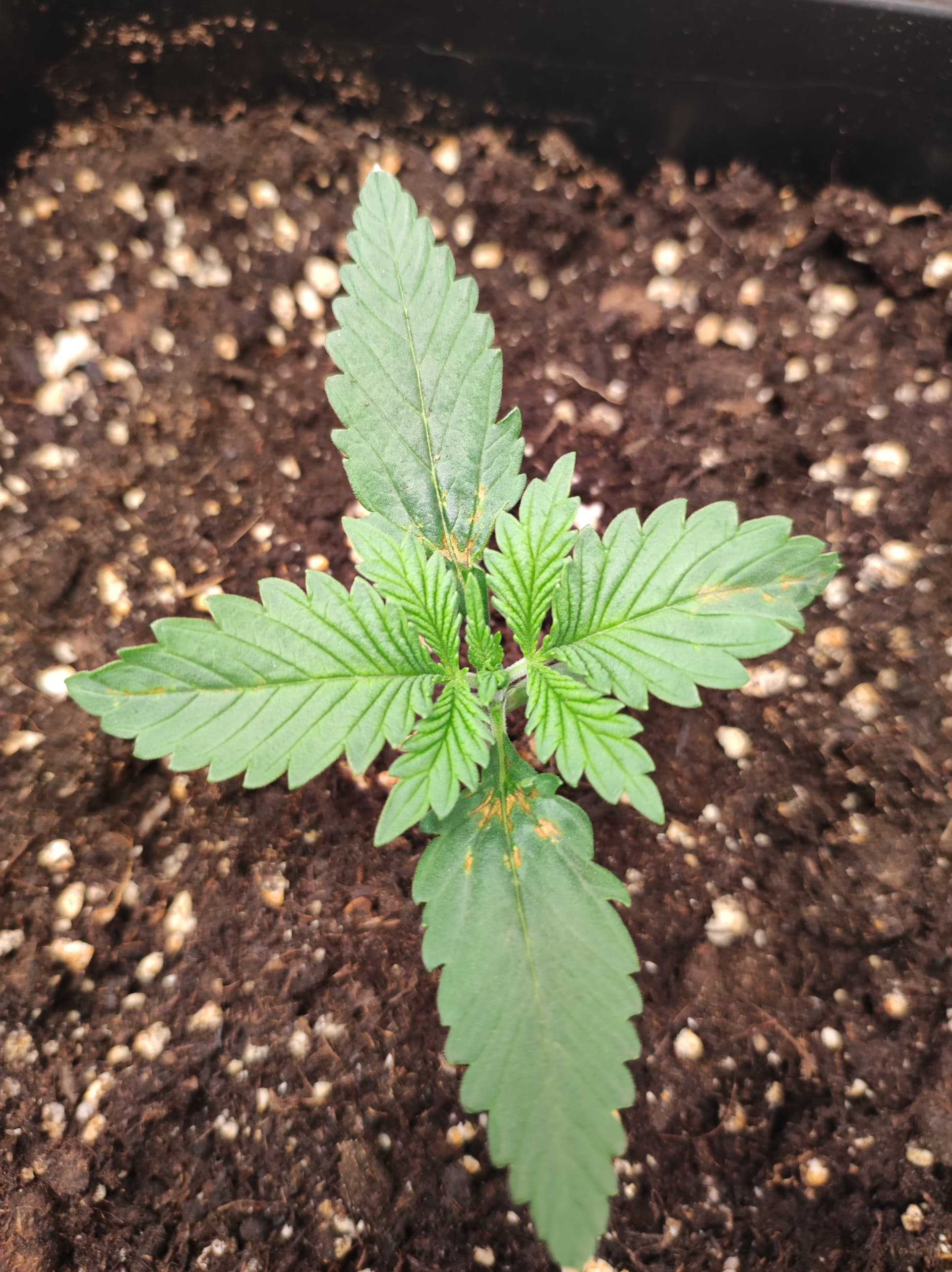 meine ladys sind etz (wurden in wasser eingeweicht als samen 24std dann in jiffys gepackt und in anzucht box gehalten bis die köpfe raus waren danach direkt in end topf 11 l plastik gesetzt ab da is tag 1 für mich) 10 tage alt ca bin mir ja net mal sicher ab wann man tag 1 zählt hahahha so ehm ja meine frage an euch könnt ihr anhand der bilder abschätzen wie weit die sind und ich hab bei 2 der damen flecken auf den blättern die mir sorgen machen