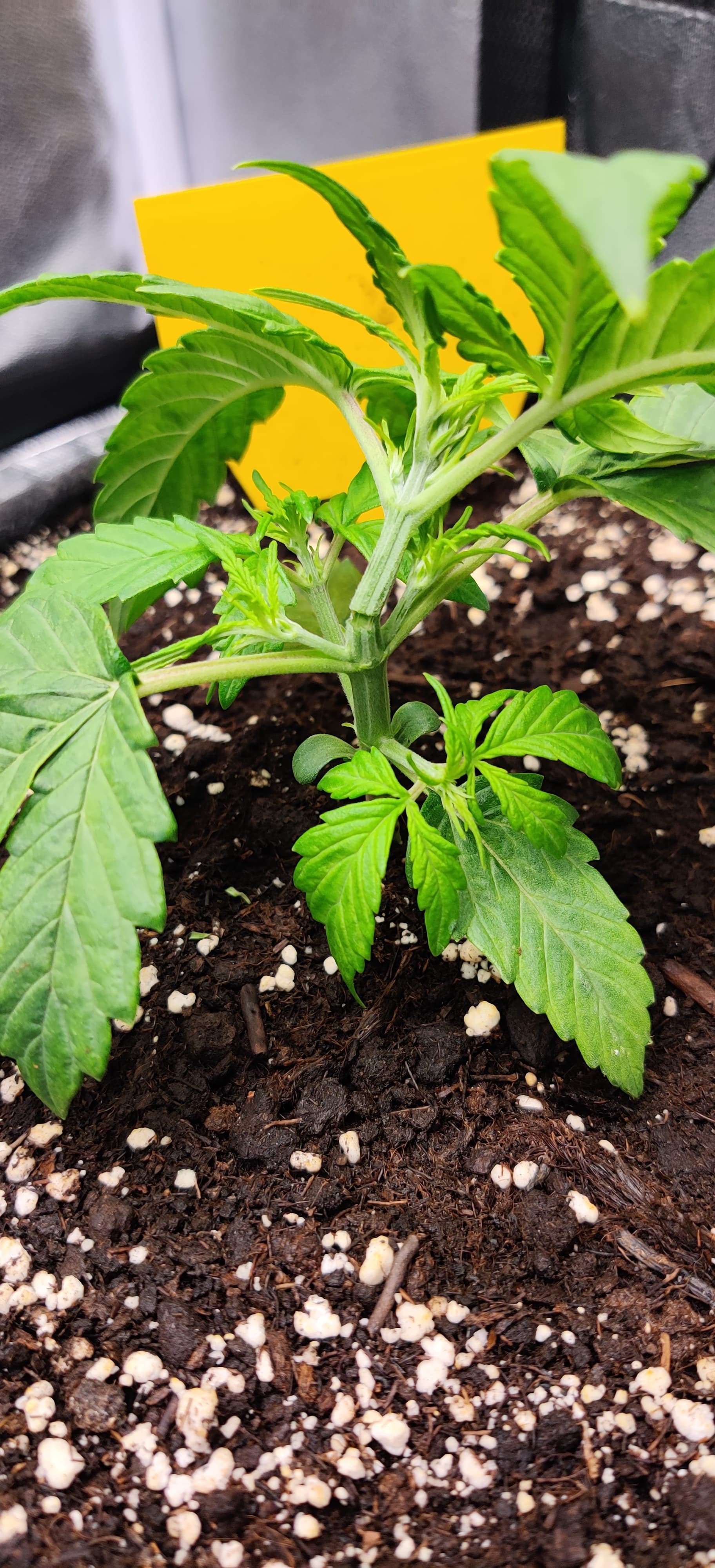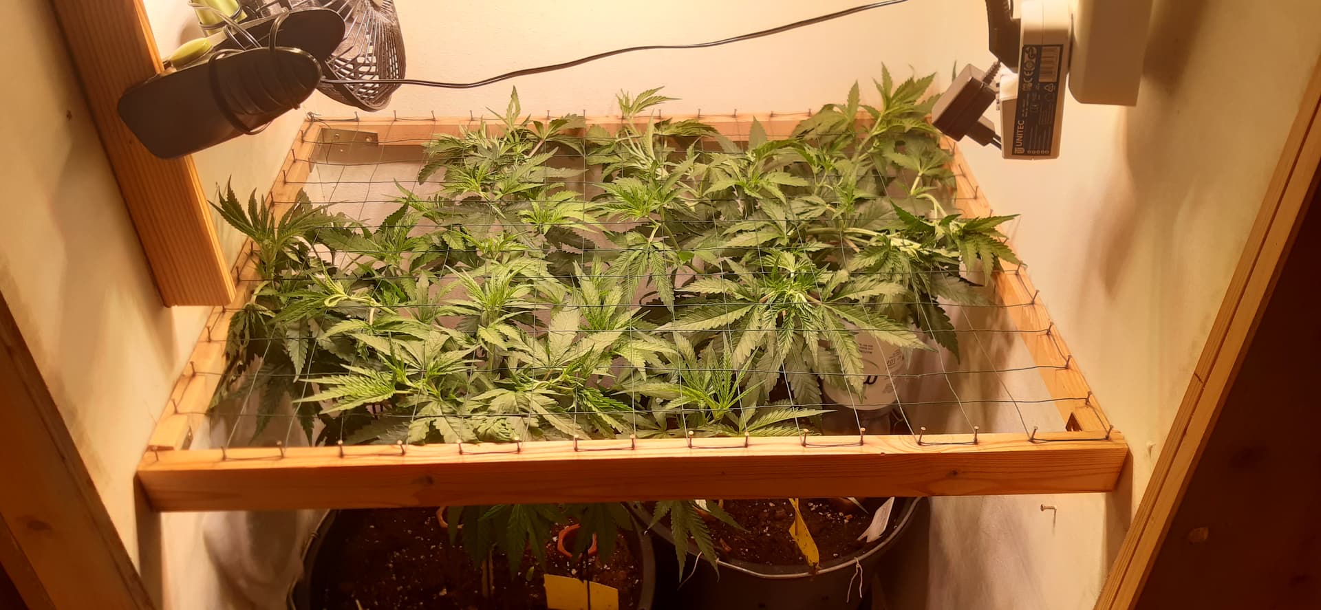 N’Abend, kleines/großes Problemchen bei mir, und zwar wollte ich meine Zweitpflanze (Dosidos Auto, aktuell VT4) ein bisschen LST unterziehen. Da ich nur so einen blöden dünnen Draht habe ist mir der Hauptstamm wie der Zufall es so wollte kurz über der 2ten Nodie halb durchgebrochen…