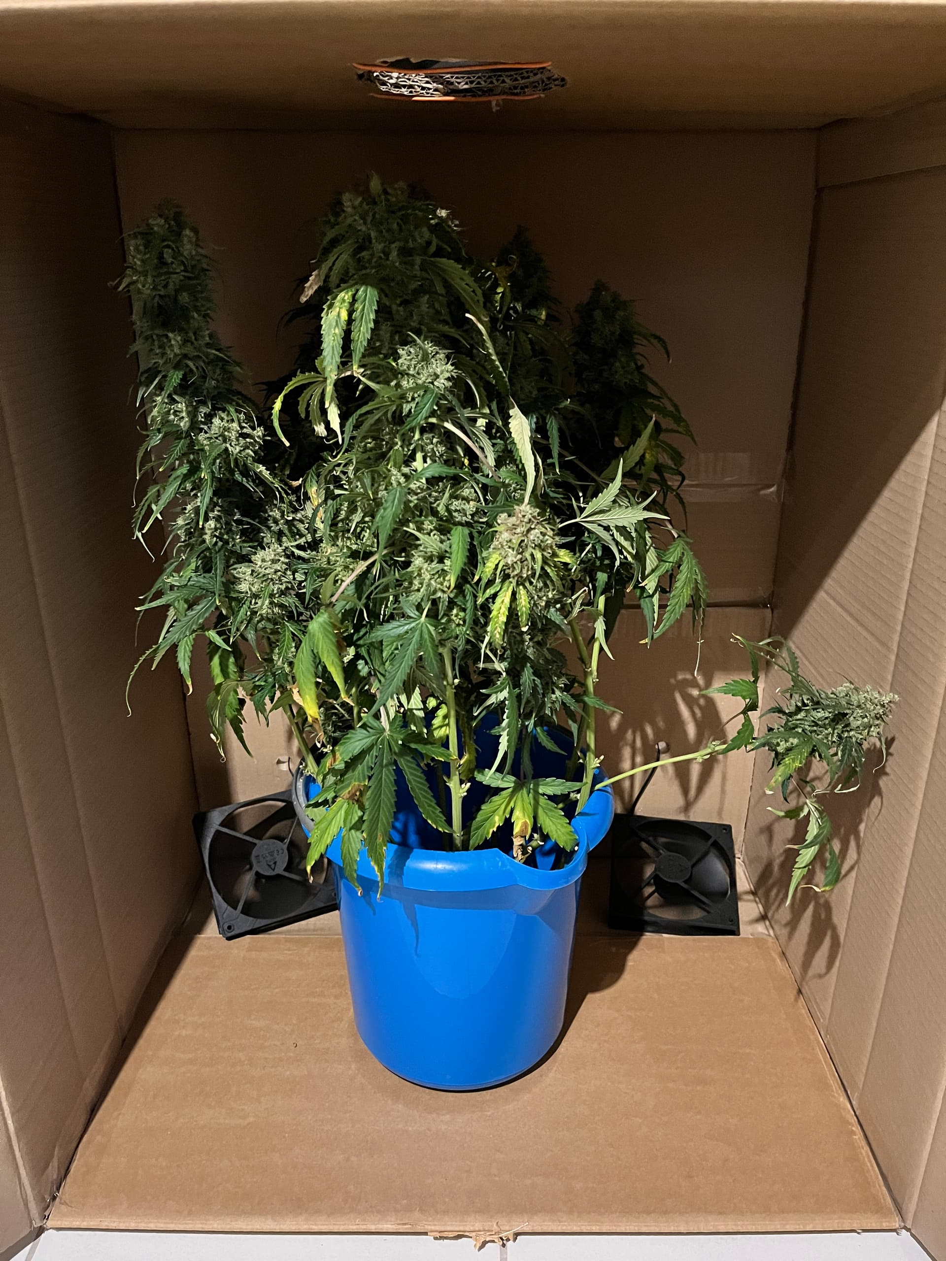 Da im Zelt noch eine weitere Pflanze steht und ich hier etwas von „Trocknen im Karton“ gelesen habe wollte ich das nun auch so machen.