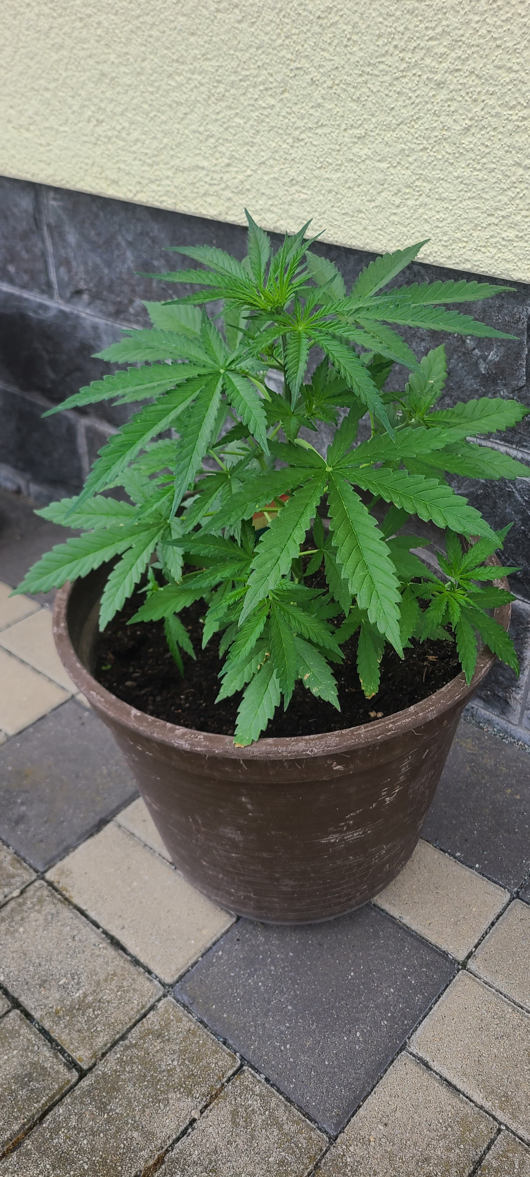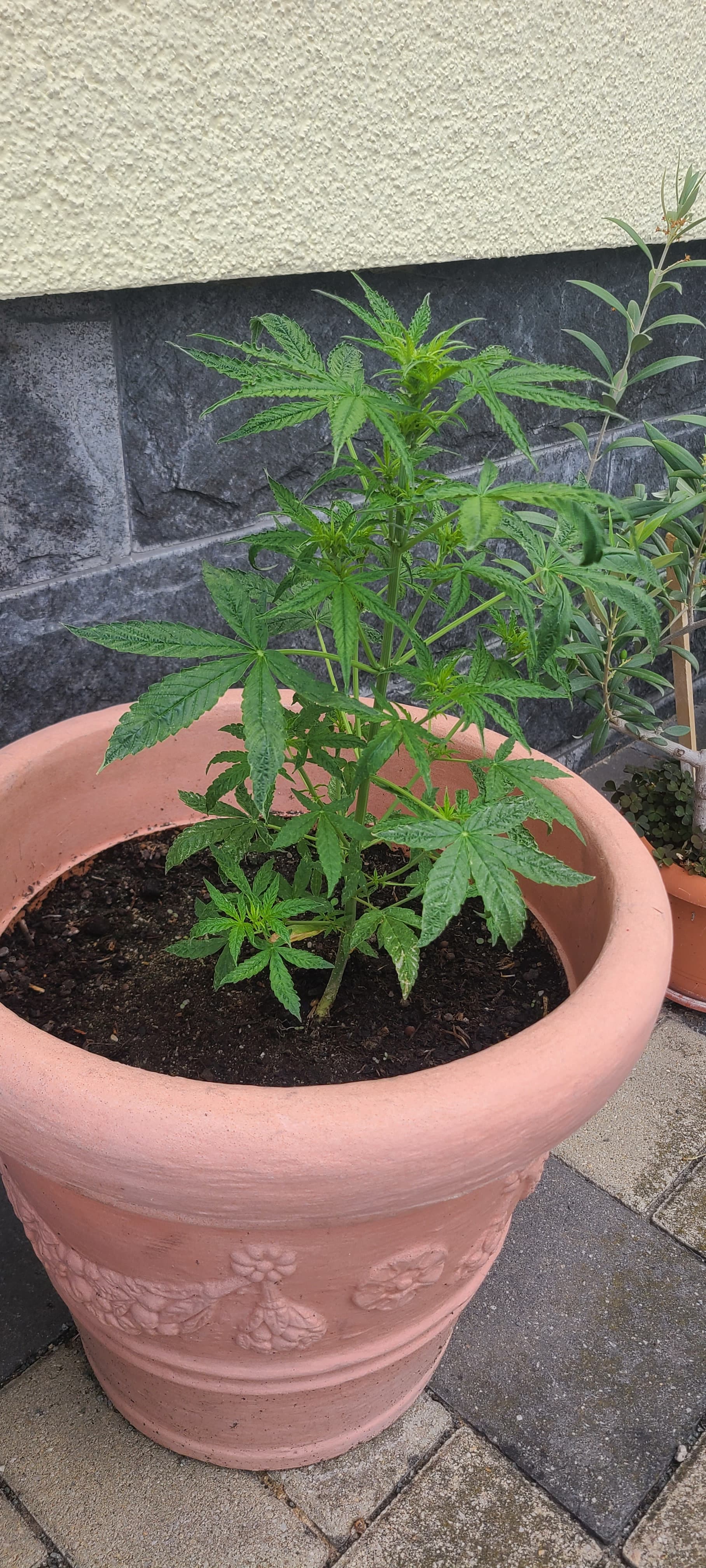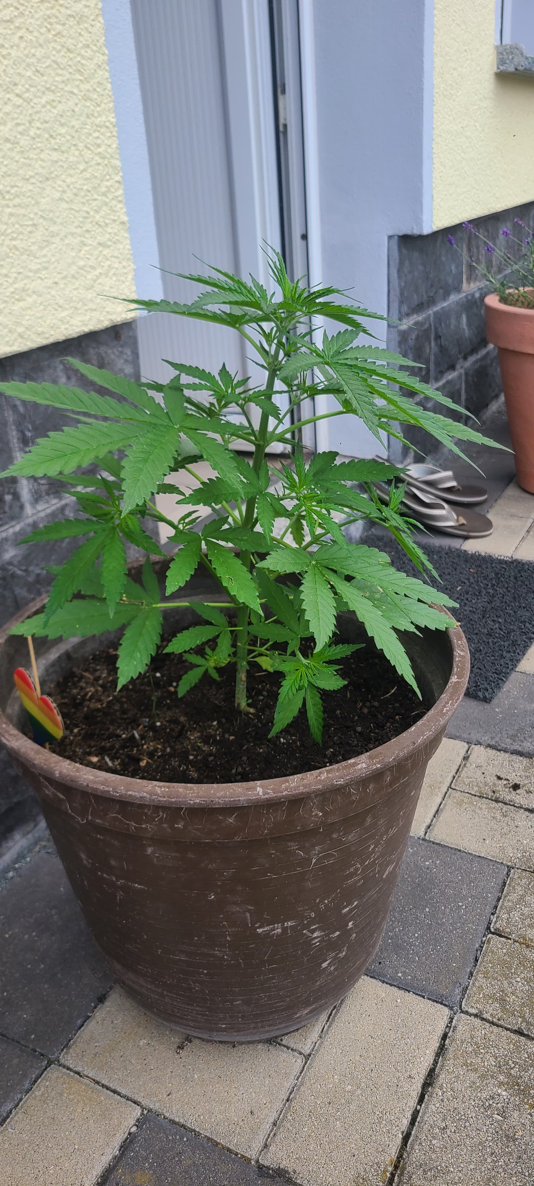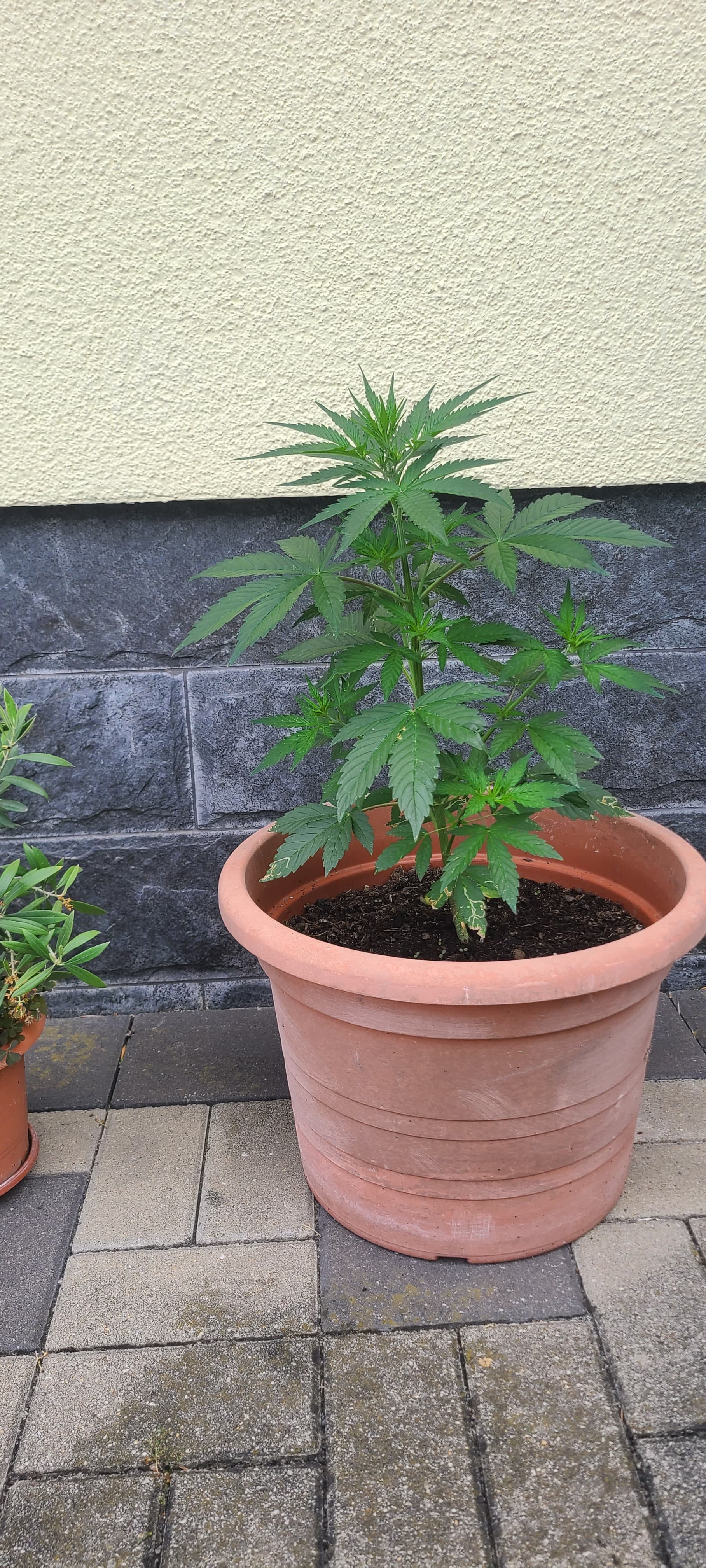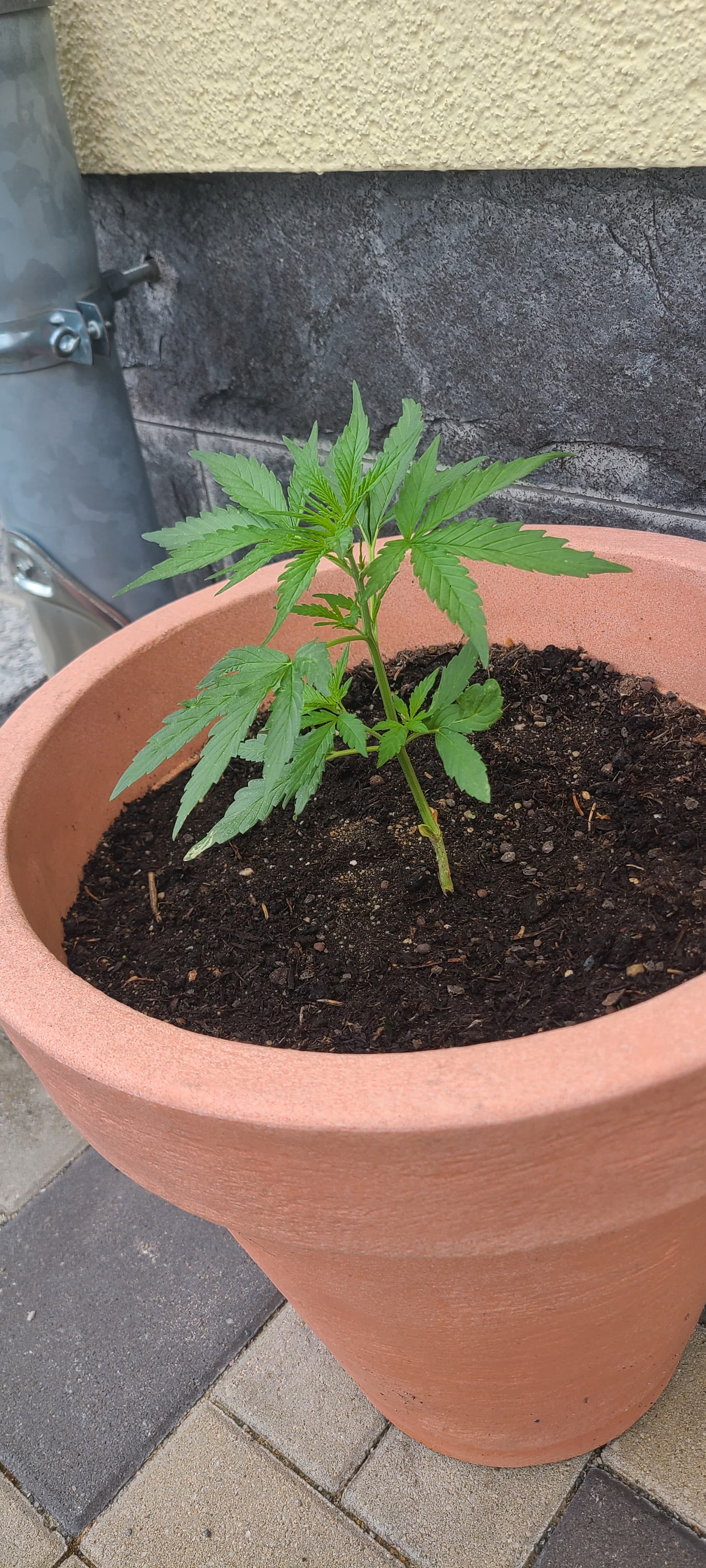 Meine Pflanzen sind jetzt ende 5. Woche und sie stehen bei uns vorm Haus. Ich hab sie drinnen großgezogen und dann draußen in 20L Töpfe eingepflanzt, als sie 2-3 cm groß waren.