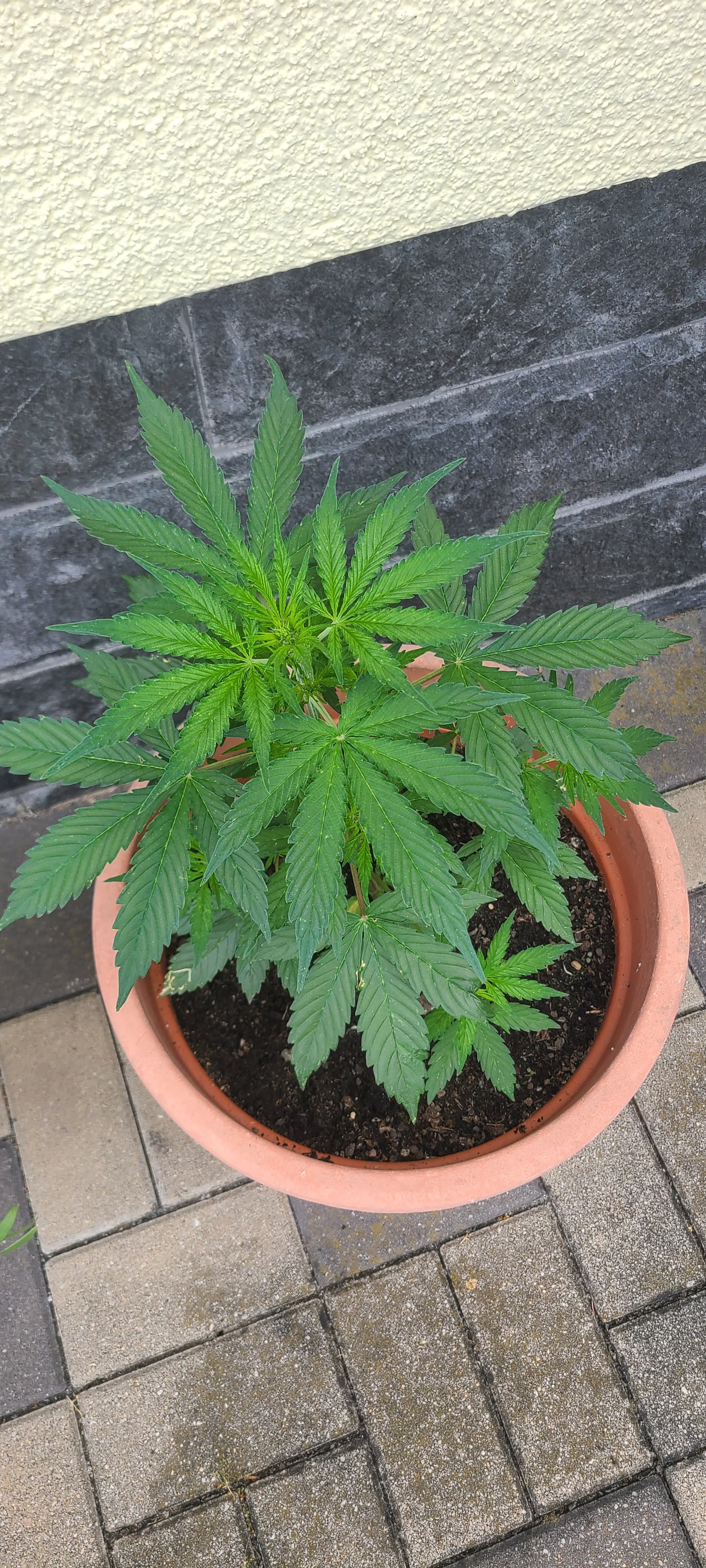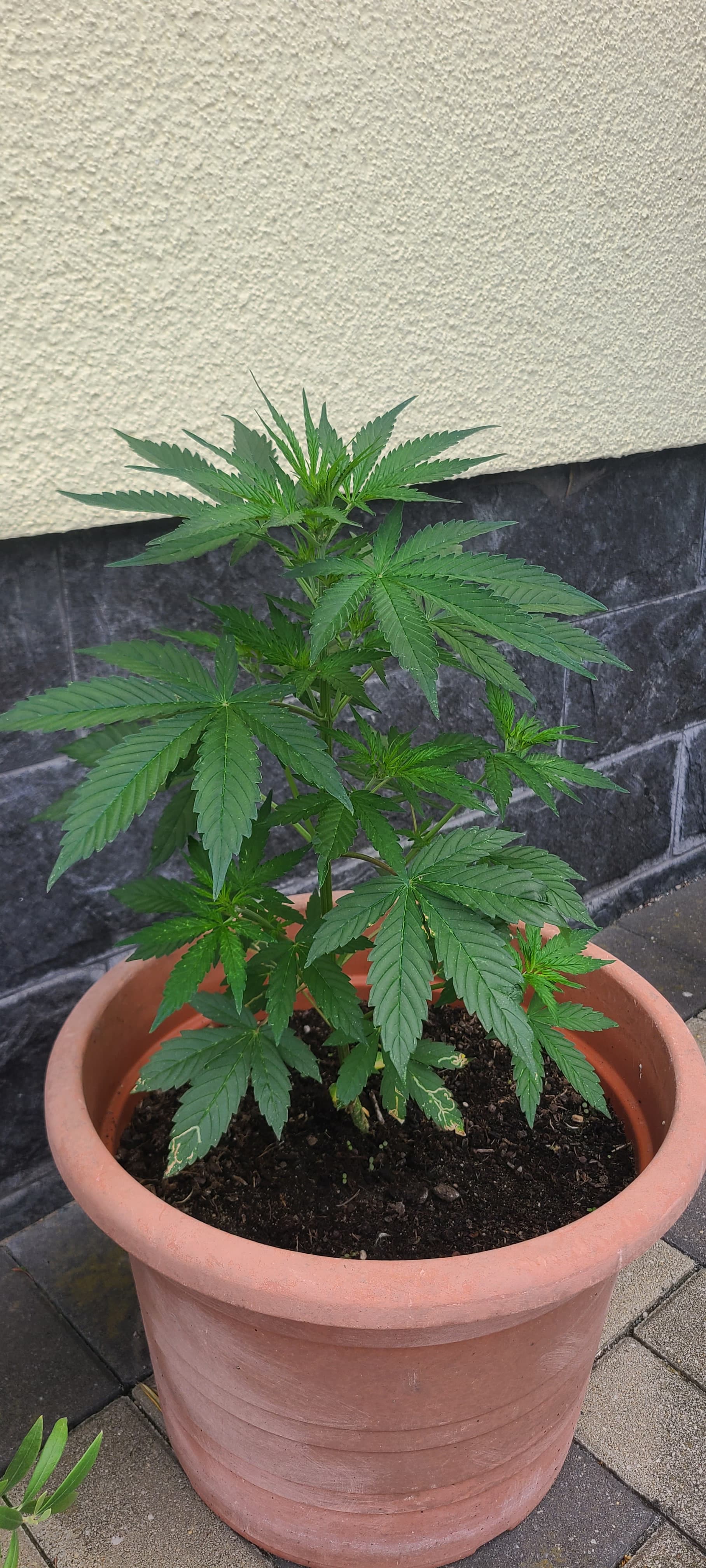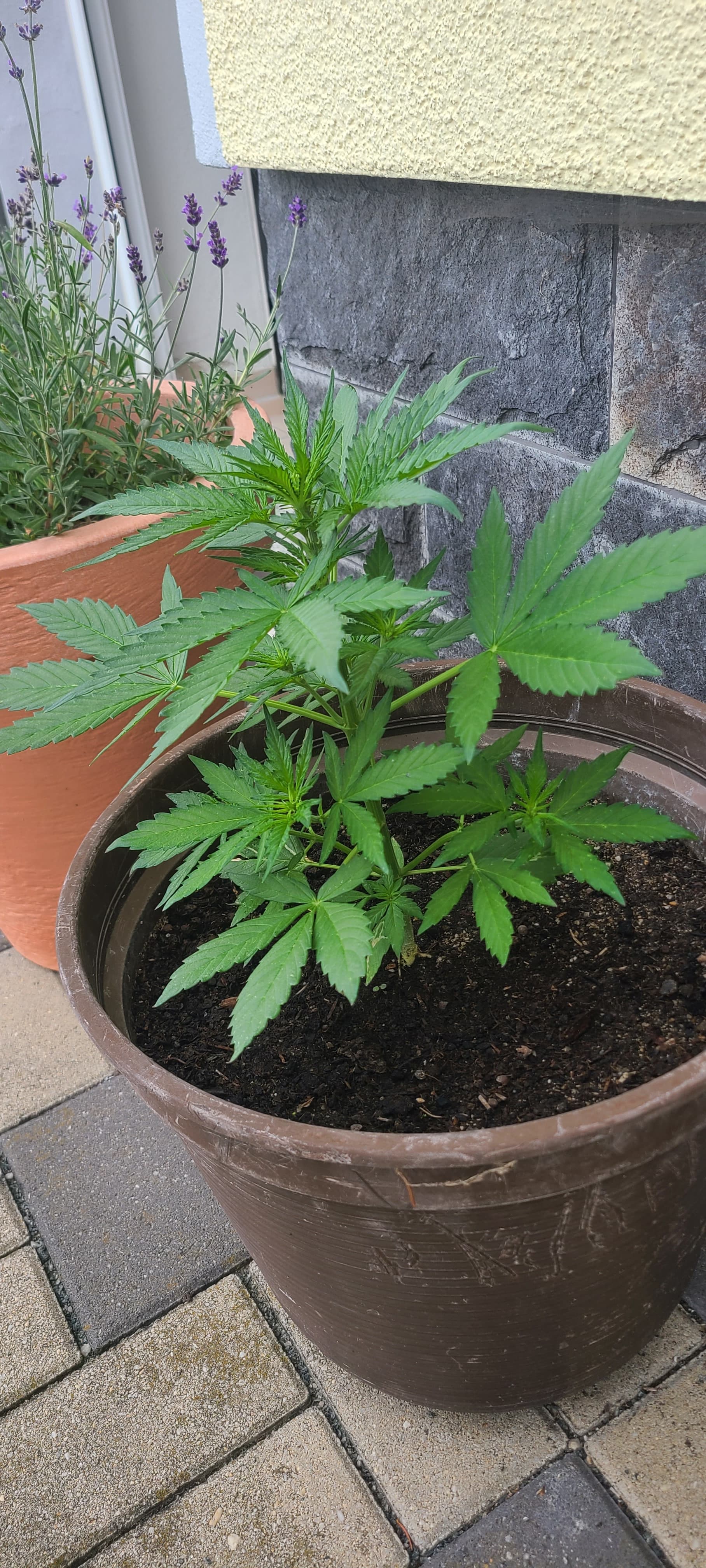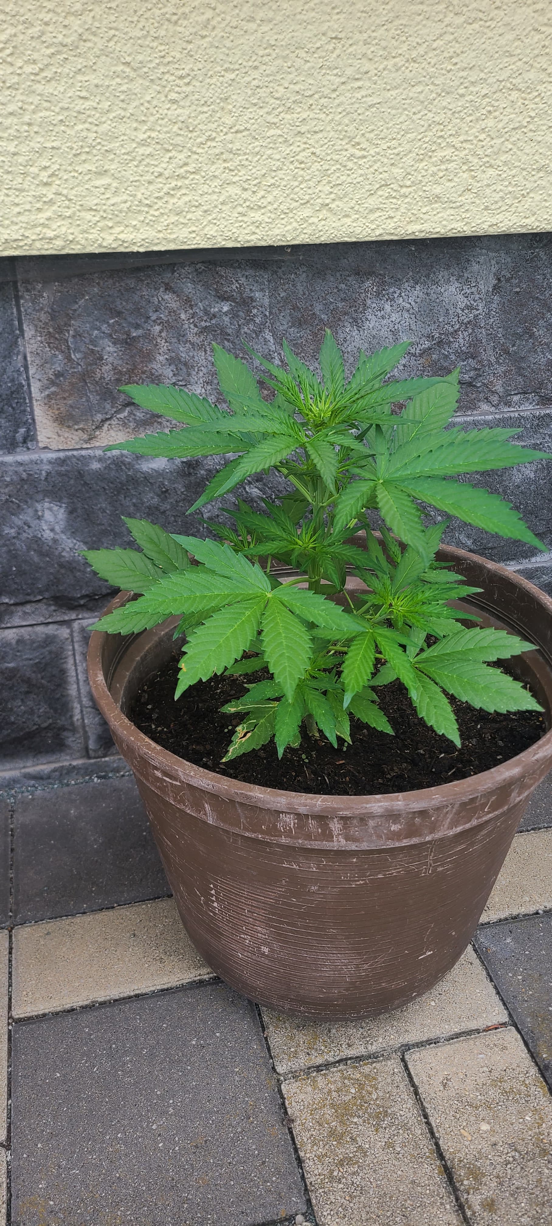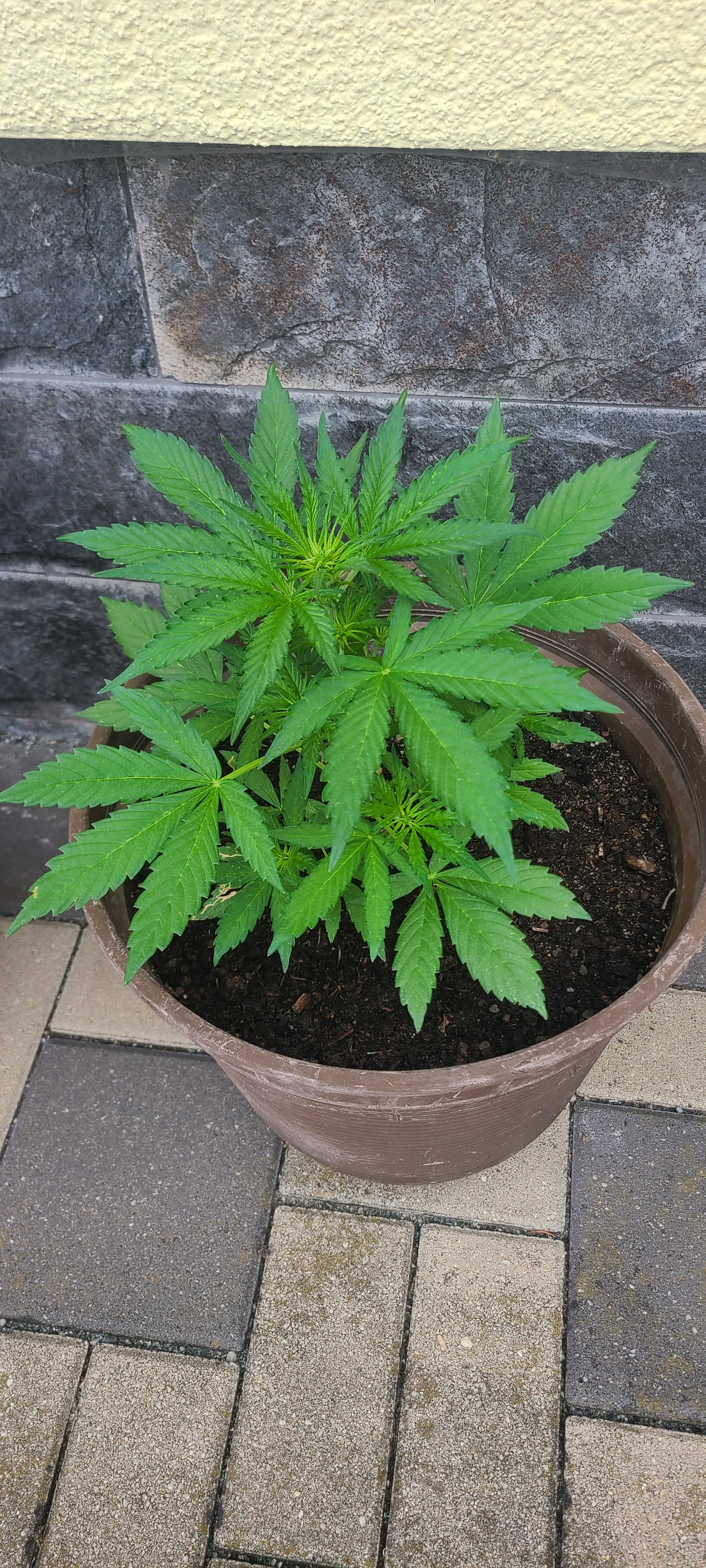 Meine Pflanzen sind jetzt ende 5. Woche und sie stehen bei uns vorm Haus. Ich hab sie drinnen großgezogen und dann draußen in 20L Töpfe eingepflanzt, als sie 2-3 cm groß waren.