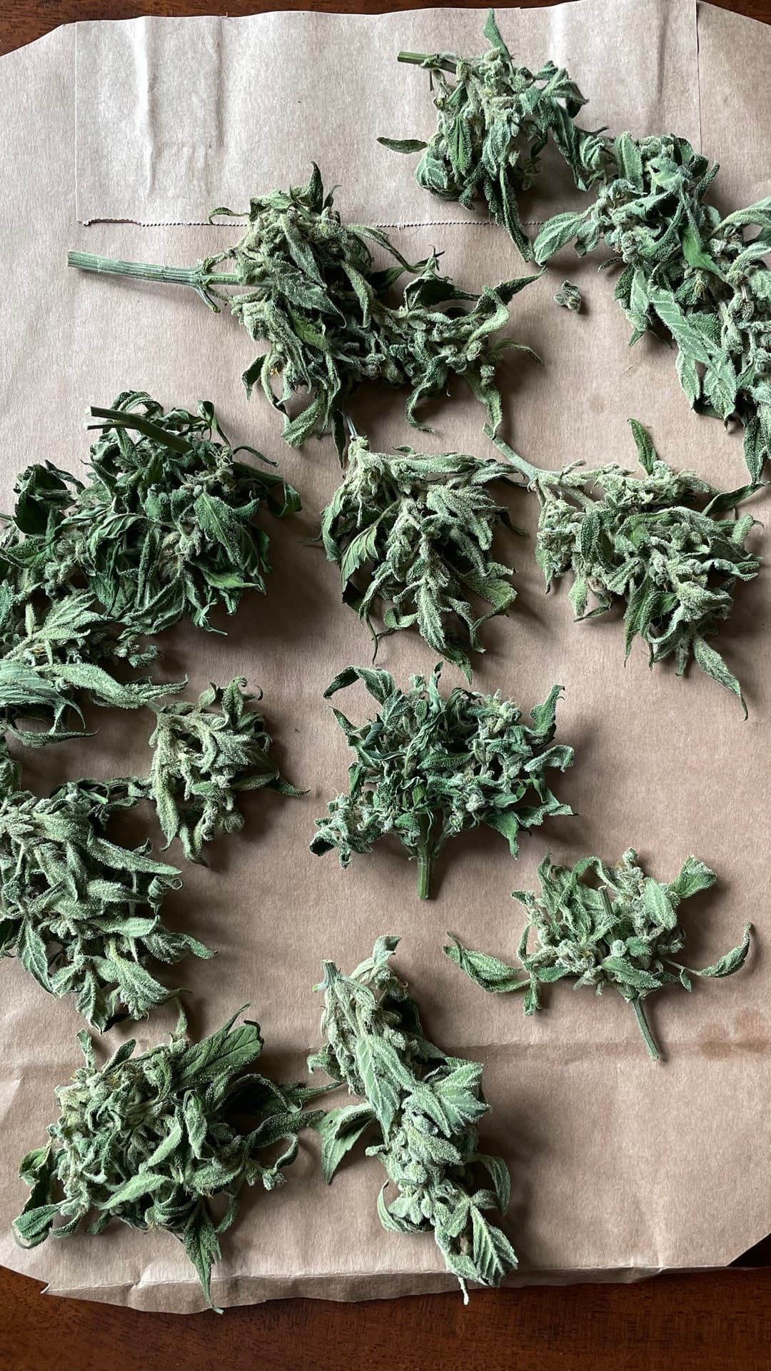 Moin! Auf den Fotos seht ihr den (traurigen) Ertrag von meiner Watermelon Auto, die ich vorzeitig wegen Blattlausbefall, Bananenwuchs und Anzeichen von Zwittrigkeit fällen musste (11. oder 12. Woche). Nach 7 Tagen Trocknung (bei 54 bis 63% LF und 22-24 Grad) knacken jetzt die Stiele und ich denke der Kram ist bereit fürs Curing in Gläsern.