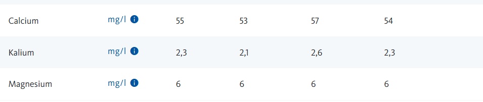 Calcium 54mg/l und Magnesium 6mg/l Quartalswert.