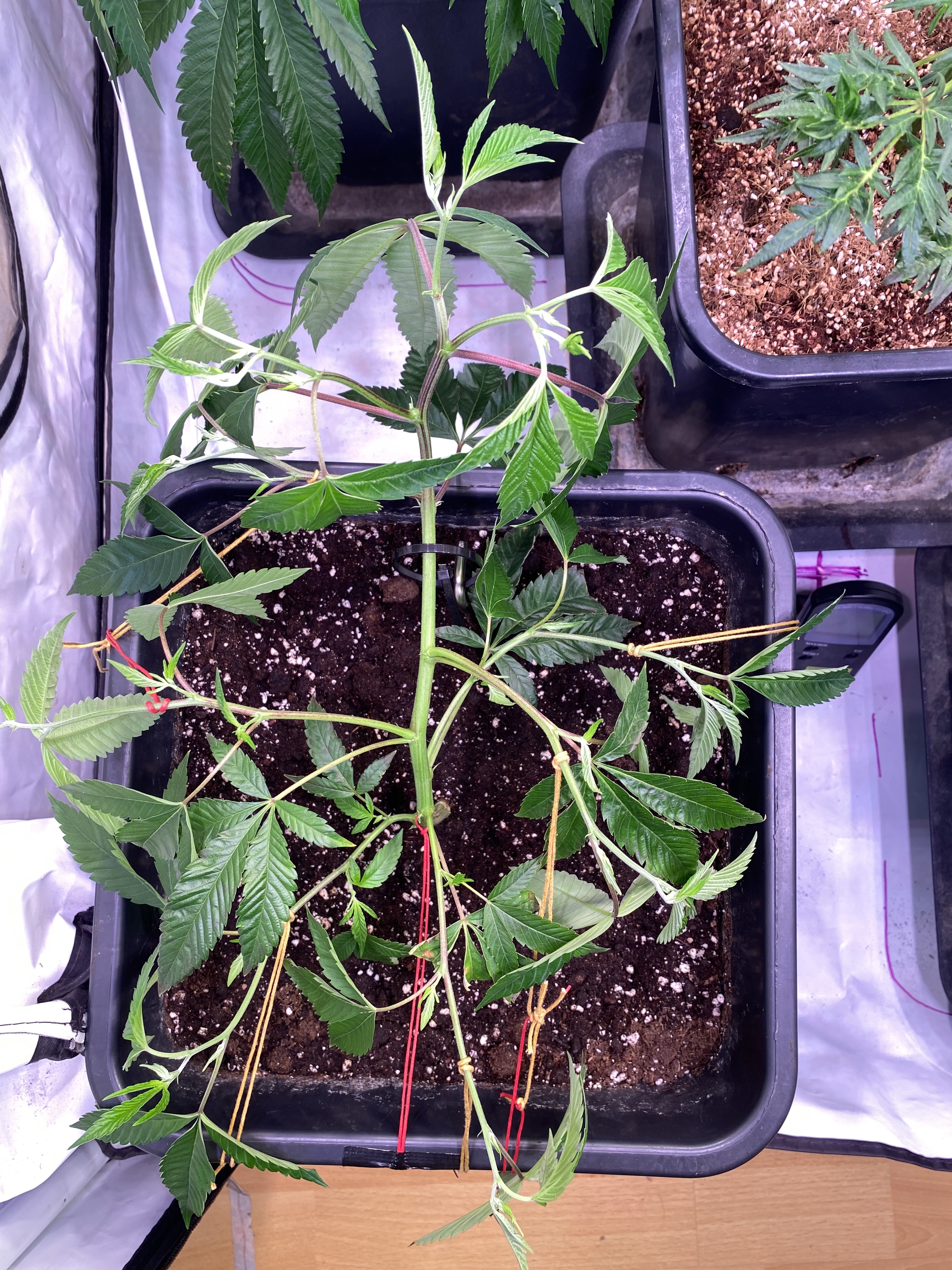 Für das erste Mal Herunterbinden sieht das doch schon ganz gut aus. Ich persönlich würde die Triebe ich glaub zweite Nodie, die eigentlich vom gebogenen Hauptstamm nach unten zeigen und jetzt sehr tief über den Erdboden lang laufen, komplett entfernen. Die entwickeln sich meist nicht so prall nach meinen bisherigen Erfahrungen damit.
