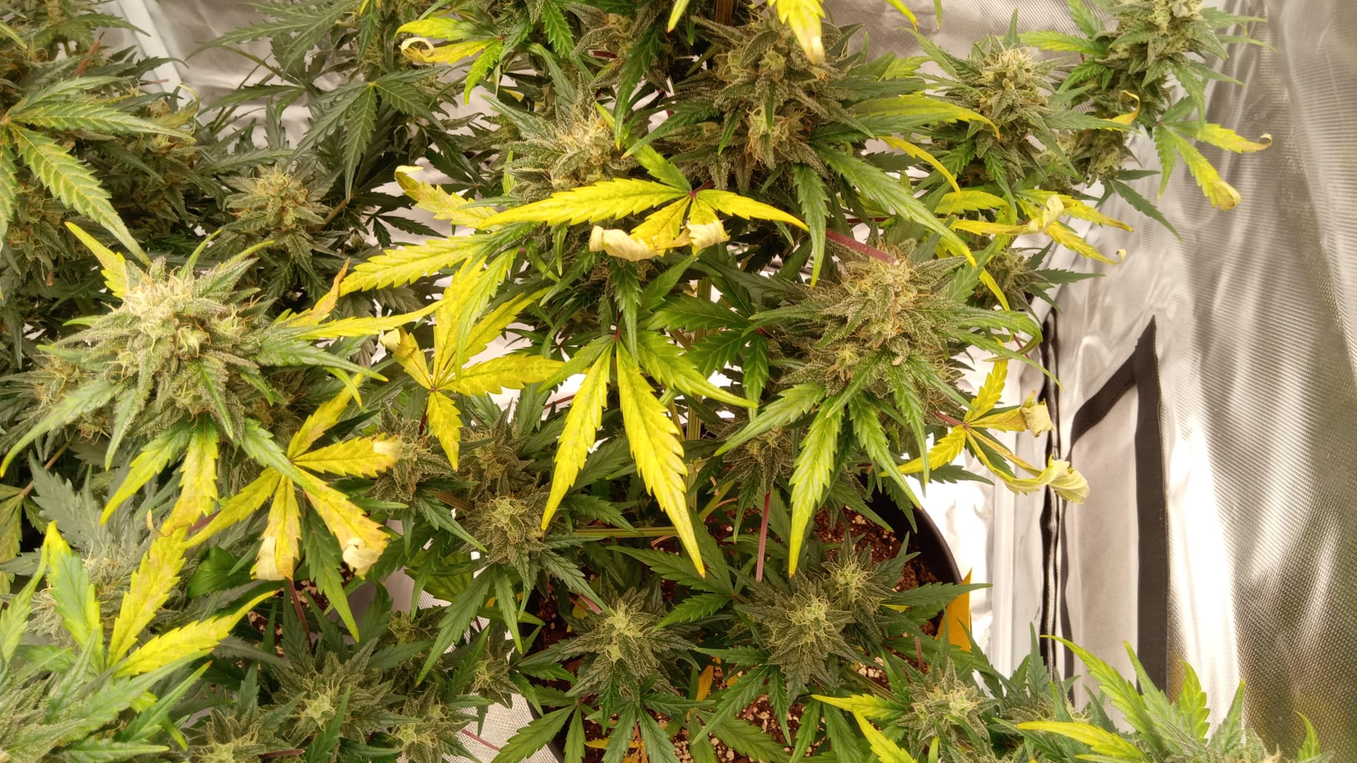 Die Pflanzen werden sich deutlich über den Rand des Topfes weg ausbreiten, allein mit den seitlich weghängenden Sonnensegeln. Und da kommen sie sich dann einfach in die Quere, das Zeug überlappt, hat Kontakt, bildet Schwitzwasser → große Schimmelgefahr, daher immer umgehend weggeschnippelt. Aber dann schiebt die Pflanze halt gleich das nächste riesige Sonnensegel raus in kürzester Zeit. Ich war in einer Tour am Schnippeln und die Pflanzen in einer Tour am neu austreiben, was sicher einiges an Energie abgezogen hat das sie gern zur Blütenbildung verwendet hätten. Es war eine Menge Micromanagement und eine Menge Furcht dass die Pflanzen sich was einfangen dabei, nicht so cool.