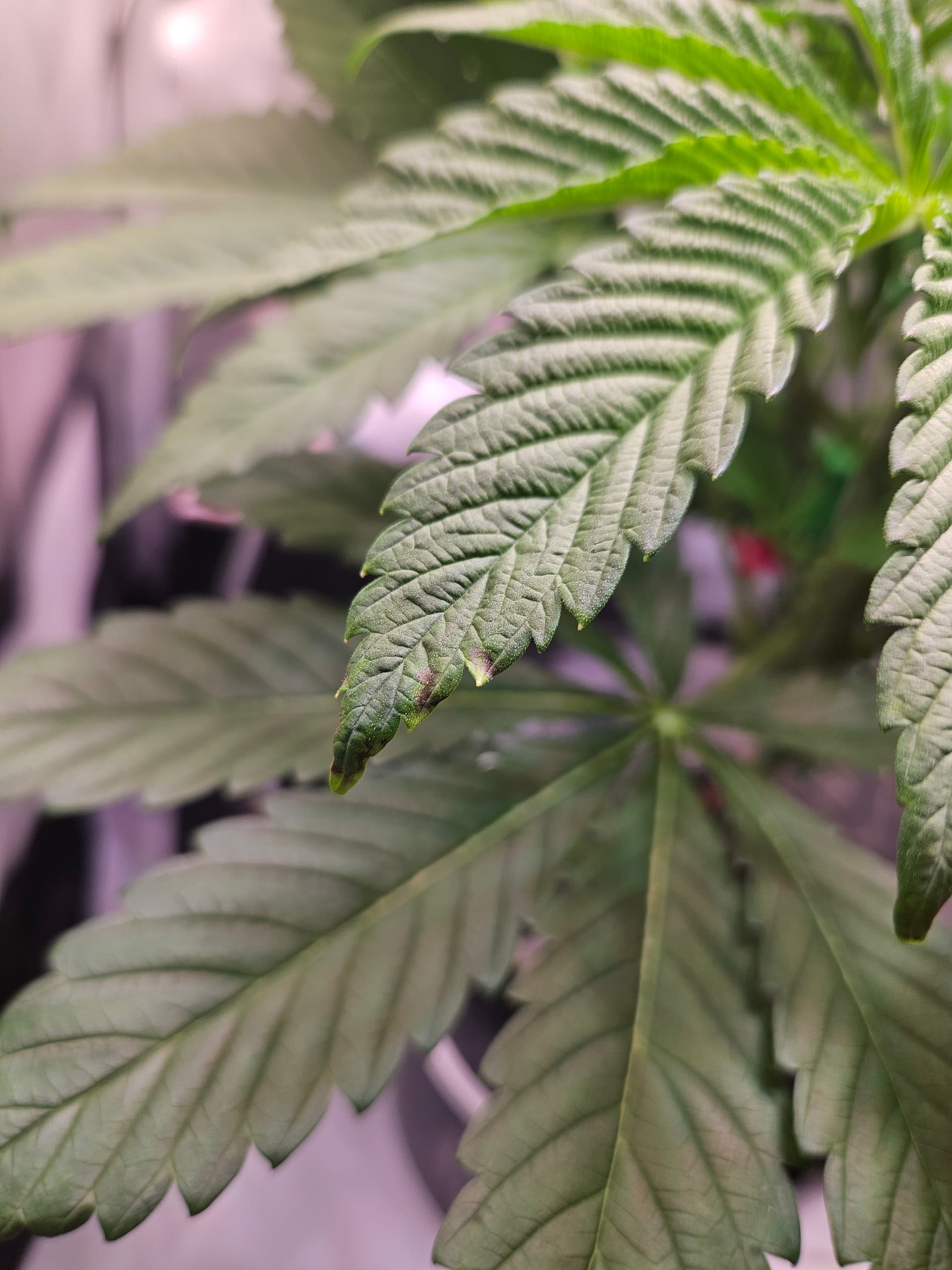 Das sind minimale Düngerspitzen, also der EC war leicht zu hoch. Zu viel Nährsalze im Medium oder im Hydro Tank entziehen der Pflanze die Feuchtigkeit und das zeigt sich als erstes an den Blattspitzen.