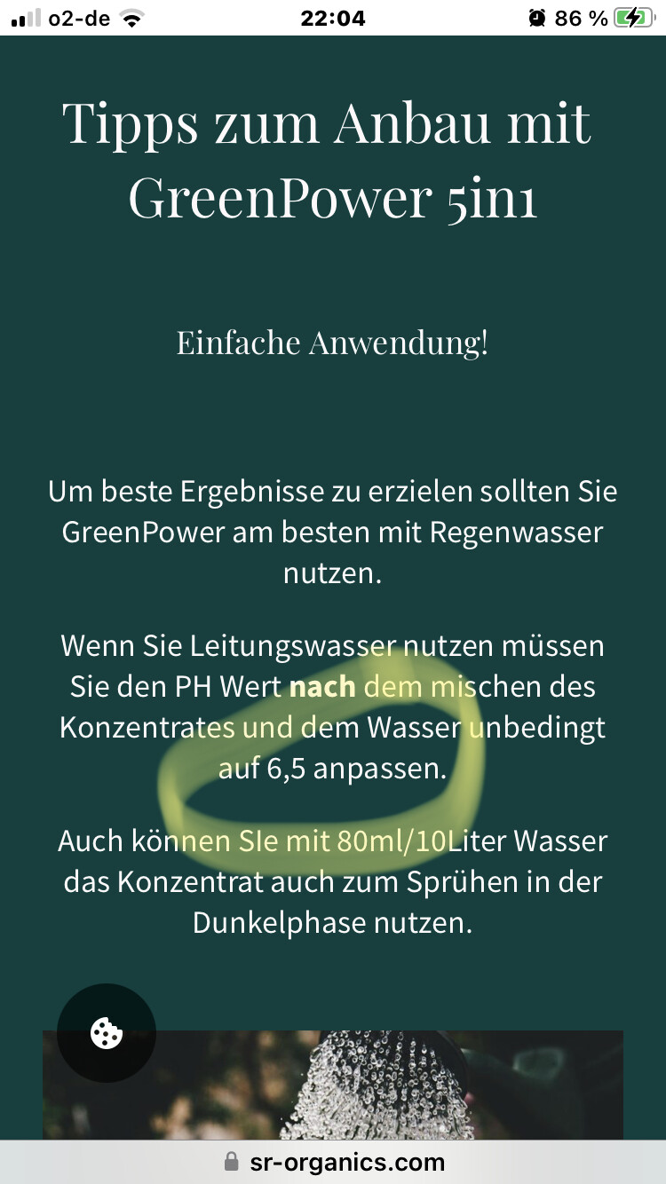 Beim Düngeschema von Green Power soll man von Woche zu Woche mehr geben. Jedes Mal einen Milliliter auf einen Liter Nährlösung. Da das Zeug organisch ist, senkt es von sich aus den PH der Nährlösung. Eventuell ab einer bestimmten Dosis zu stark. Zudem den PH immer erst am Ende des Anmischens der Nährlösung anpassen, eben weil der vorher schon durch Düngergabe selbst sinkt. Hoffe das wird von dir so gemacht. Und bitte bei deinem weichen Wasser bloß kein BB PH Minus, manche raten hier auch davon ab überhaupt anzupassen, da das Bodenleben in der Erde auch viel selbst reguliert und ungern Schwankungen hat. Ich habe mit PH Anpassen bei organischem Grow noch keine Probleme gehabt aber ich hab ne andere Wasserhärte und nutze auch kein BB PH Minus.