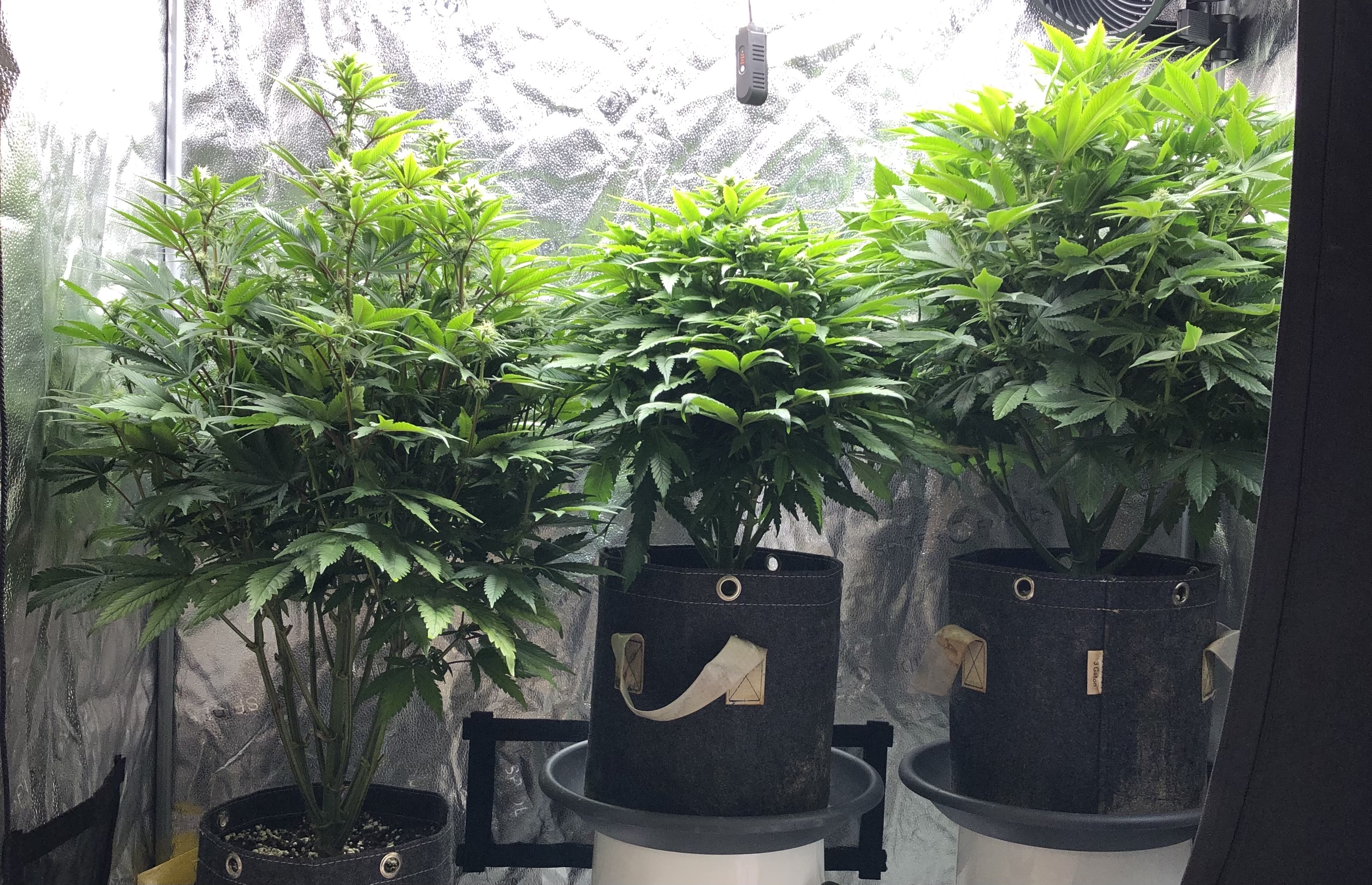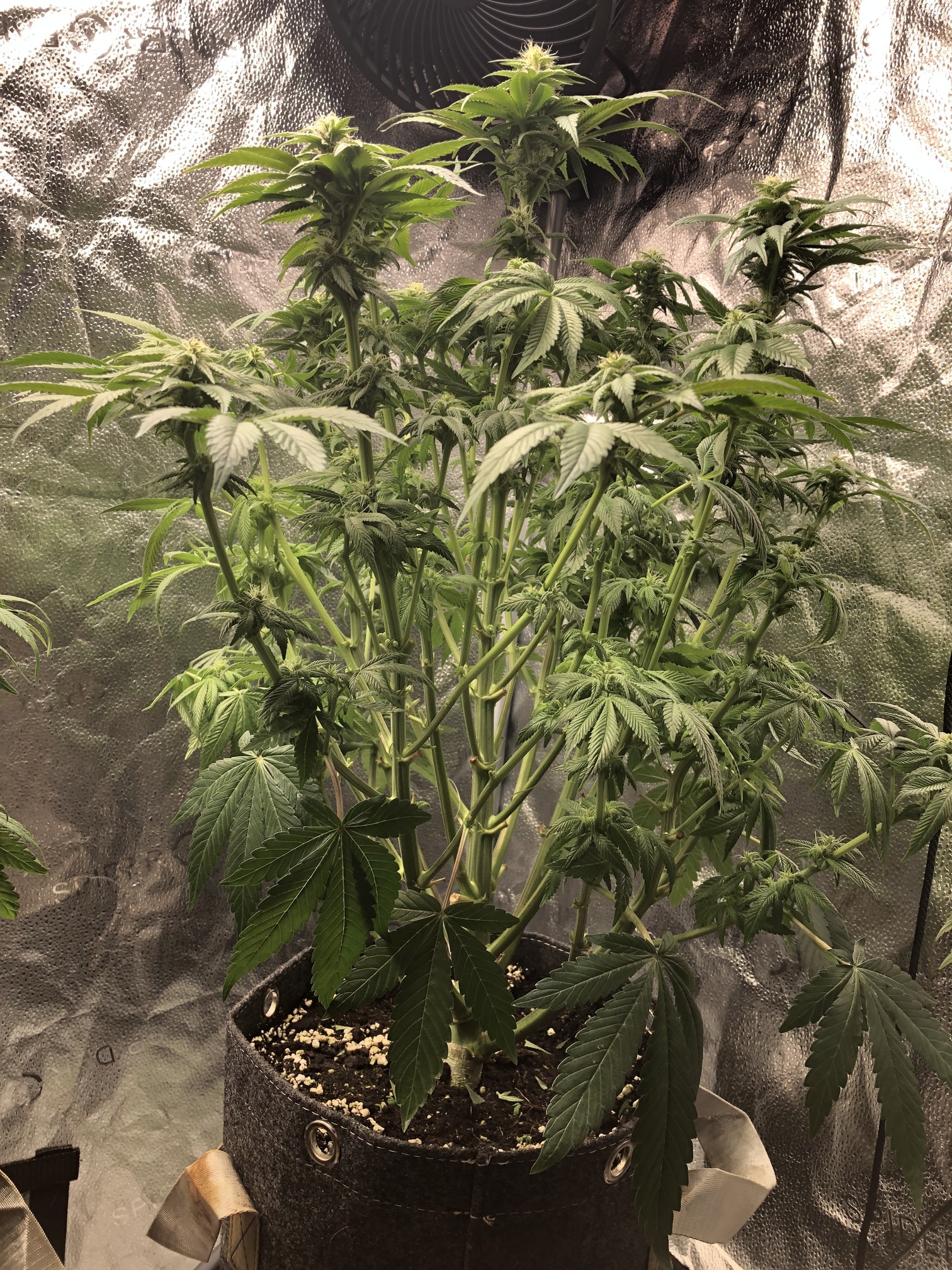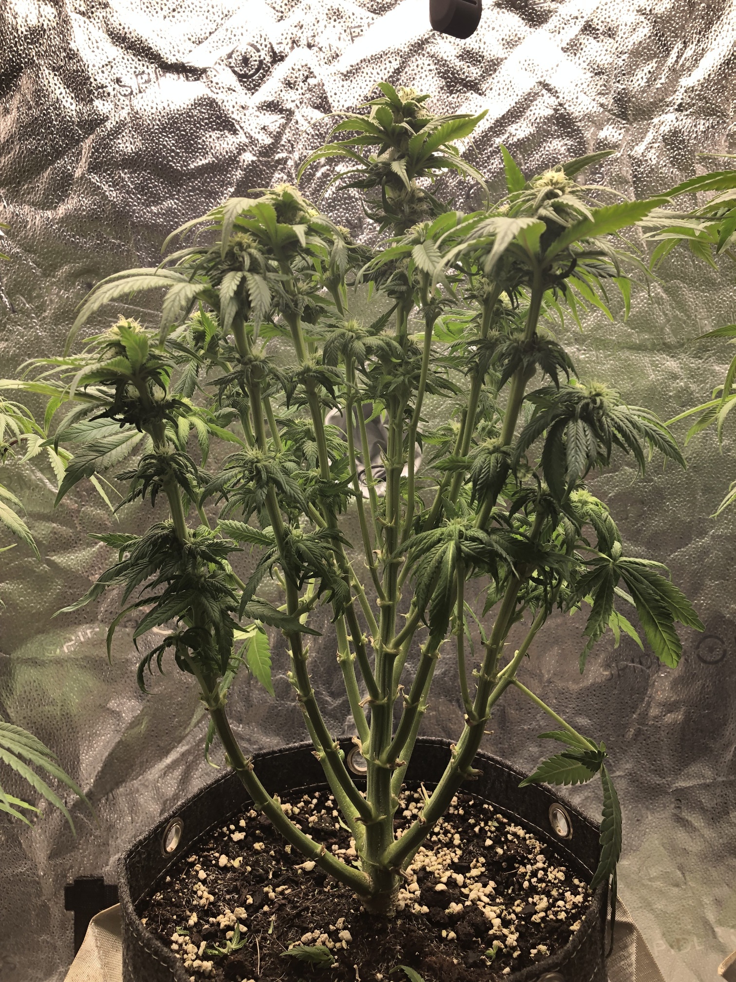 Die Watermelon (fem) von RQS ist zweimal getoppt und einmal entlaubt worden vor Umstellung im 11 Liter Topf bei 55 Watt LED (Habibi Flux Shield) und 4 Wochen im Wachstum gewesen.